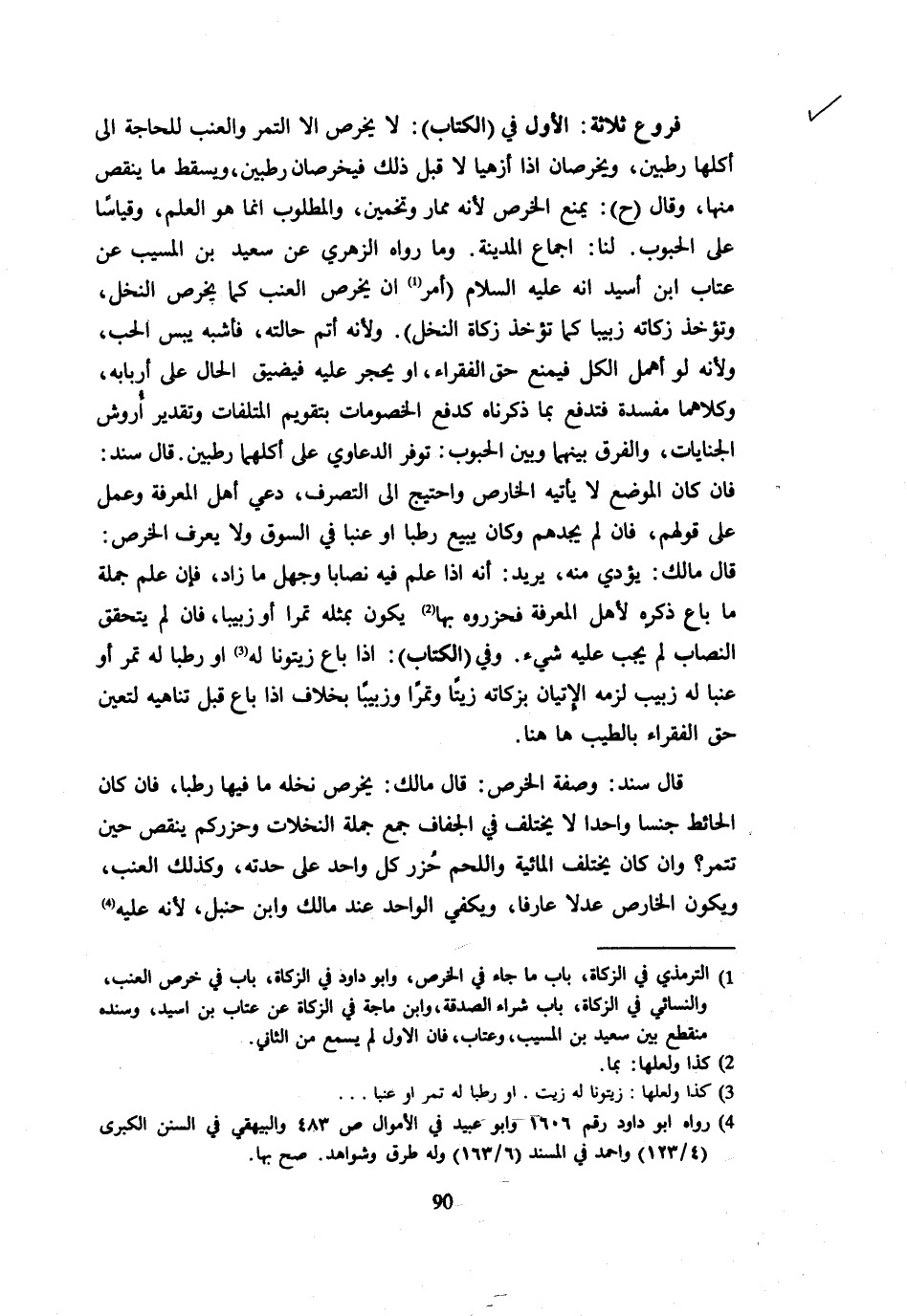فُرُوعٌ ثَلَاثَةٌ الْأَوَّلُ فِي الْكِتَابِ لَا يُخْرَصُ إِلَّا التَّمْر وَالْعِنَب للْحَاجة إِلَى أكلهَا رَطْبَيْنِ وَيُخْرَصَانِ إِذَا أُزْهِيَا لَا قَبْلَ ذَلِكَ فَيُخْرَصَانِ رَطْبَيْنِ وَيُسْقَطُ مَا يَنْقُصُ مِنْهَا وَقَالَ ح يمْنَع الْخرص لِأَنَّهُ ممار وَتَخْمِينٌ وَالْمَطْلُوبُ إِنَّمَا هُوَ الْعِلْمُ وَقِيَاسًا عَلَى الْحُبُوبِ لَنَا إِجْمَاعُ الْمَدِينَةِ وَمَا رَوَاهُ الزُّهْرِيُّ عَن سعيد بن الْمسيب عَن عتاب ابْن أسيد انه - صَلَّى اللَّهُ عَلَيْهِ وَسَلَّم َ - أَمَرَ أَنْ يُخْرَصَ الْعِنَبُ كَمَا يُخْرَصُ النَّخْلُ وَتُؤْخَذُ زَكَاتُهُ زَبِيبًا كَمَا تُؤْخَذُ زَكَاةُ النَّخْلِ وَلِأَنَّهُ أَتَمُّ حَالَتِهِ فَأَشْبَهَ يُبْسَ الْحَبِّ وَلِأَنَّهُ لَو أهمل الْكل فَيمْنَع حق الْفُقَرَاء أَو يحْجر عَلَيْهِ فيضق الْحَالُ عَلَى أَرْبَابِهِ وَكِلَاهُمَا مَفْسَدَةٌ فَتُدْفَعُ بِمَا ذَكَرْنَاهُ كَدَفْعِ الْخُصُومَاتِ بِتَقْوِيمِ الْمُتْلَفَاتِ وَتَقْدِيرِ أُرُوشِ الْجِنَايَاتِ وَالْفَرْقُ بَيْنَهُمَا وَبَيْنَ الْحُبُوبِ تَوَفُّرُ الدَّعَاوِي على أكملها رَطْبَيْنِ قَالَ سَنَدٌ فَإِنْ كَانَ الْمَوْضِعُ لَا يَأْتِيهِ الخارص واحتيج إِلَى التَّصَرُّف دعى أَهْلَ الْمَعْرِفَةِ وَعَمِلَ عَلَى قَوْلِهِمْ فَإِنْ لَمْ يَجِدْهُمْ وَكَانَ يَبِيعُ رَطْبًا أَوْ عِنَبًا فِي السُّوقِ وَلَا يَعْرِفُ الْخَرْصَ قَالَ مَالِكٌ يُؤَدِّي مِنْهُ يُرِيدُ أَنَّهُ إِذَا عَلِمَ فِيهِ نِصَابًا وَجَهل مَا زَادَ فَإِنْ عَلِمَ جُمْلَةَ مَا بَاعَ ذكره لأهل الْمعرفَة فحزروه بهَا يكون بمثلة تَمْرًا أَوْ زَبِيبًا فَإِنْ لَمْ يَتَحَقَّقِ النِّصَابُ لَمْ يَجِبْ عَلَيْهِ شَيْءٌ وَفِي الْكِتَابِ إِذَا بَاعَ زيتونا لَهُ أَو رطبا لَهُ تمر أَوْ عِنَبًا لَهُ زَبِيبٌ لَزِمَهُ الْإِتْيَانُ بِزَكَاتِهِ زيتا وَتَمْرًا وزبيبا بِخِلَاف إِذَا بَاعَ قَبْلَ تَنَاهِيهِ لِتَعَيُّنِ حَقِّ الْفُقَرَاءِ بالطيب هَاهُنَا قَالَ سَنَدٌ وَصِفَةُ الْخَرْصِ قَالَ مَالِكٌ يَخْرُصُ نَخْلَة مَا فِيهَا رَطْبًا فَإِنْ كَانَ الْحَائِطُ جِنْسًا وَاحِدًا لَا يُخْتَلَفُ فِي الْجَفَافِ جَمَعَ جملَة النخلات وحزركم ينقص حِين تتمر وَإِن كَانَ يخْتَلف الْمَائِيَّةُ وَاللَّحْمُ حَزَرَ كُلَّ وَاحِدٍ عَلَى حِدَتِهِ وَكَذَلِكَ الْعِنَبُ وَيَكُونُ الْخَارِصُ عَدْلًا عَارِفًا وَيَكْفِي الْوَاحِدُ عِنْدَ مَالِكٍ وَابْنِ حَنْبَلٍ لِأَنَّهُ عَلَيْهِ