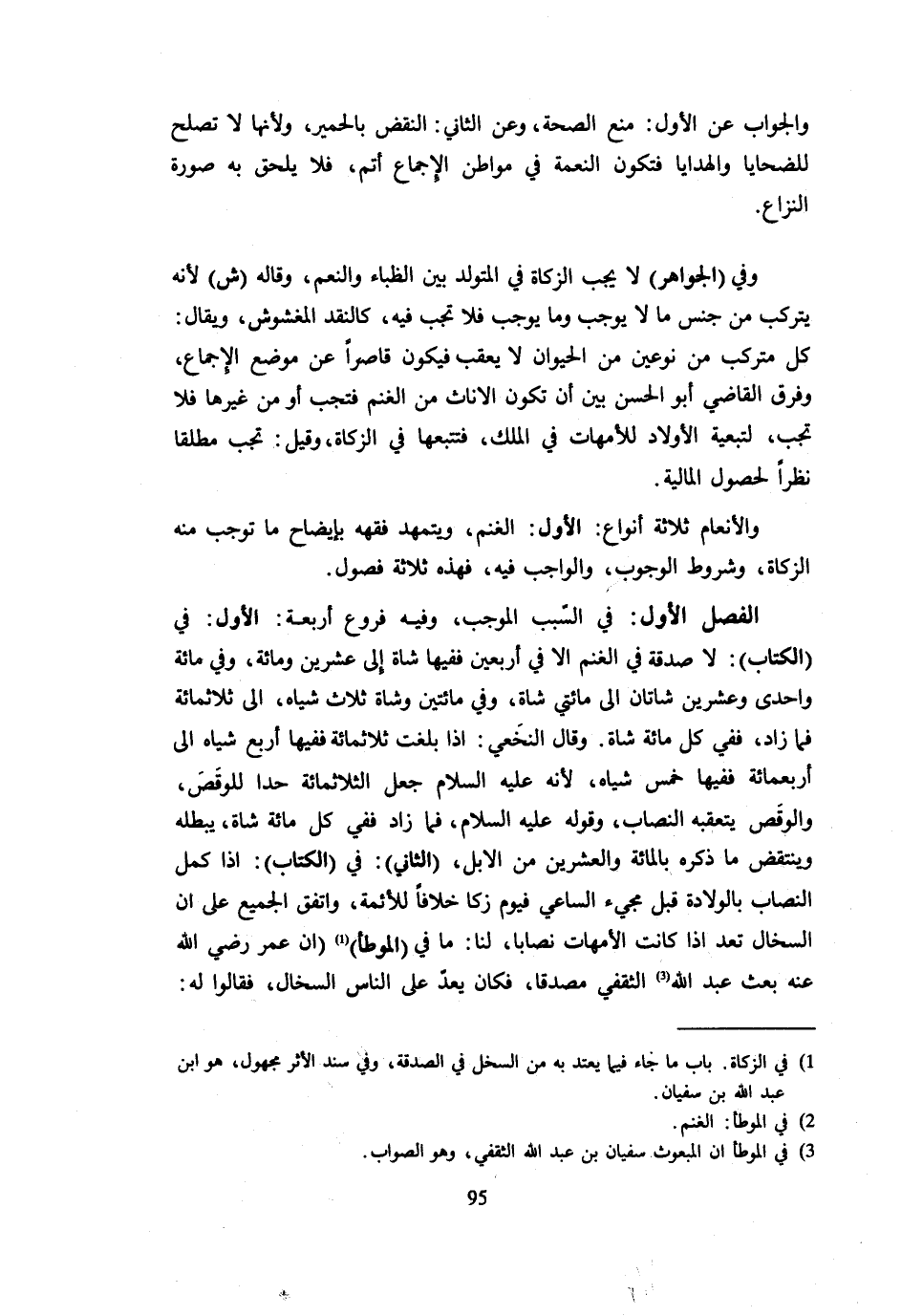 وَالْجَوَابُ عَنِ الْأَوَّلِ مَنْعُ الصِّحَّةِ وَعَنِ الثَّانِي النَّقْضُ بِالْحَمِيرِ وَلِأَنَّهَا لَا تَصْلُحُ لِلضَّحَايَا وَالْهَدَايَا فَتَكُونُ النِّعْمَةُ فِي مَوَاطِنِ الْإِجْمَاعِ أَتَمَّ فَلَا يَلْحَقُ بِهِ صُورَةُ النِّزَاعِ وَفِي الْجَوَاهِرِ لَا يجب الزَّكَاة فِي الْمُتَوَلد بَين الظباء وَالنعَم وَقَالَهُ ش لِأَنَّهُ يَتَرَكَّبُ مِنْ جِنْسِ مَا لَا يُوجب وَمَا يُوجب فَلَا تجب فِيهِ كَالنَّقْدِ الْمَغْشُوشِ وَيُقَالُ كُلُّ مُتَرَكِّبٍ مِنْ نَوْعَيْنِ مِنَ الْحَيَوَانِ لَا يُعْقِبُ فَيَكُونُ قَاصِرًا عَنْ مَوْضِعِ الْإِجْمَاعِ وَفَرَّقَ الْقَاضِي أَبُو الْحَسَنِ بَيْنَ أَن يكون الْإِنَاث من الْغنم فَتَجِبُ أَوْ مِنْ غَيْرِهَا فَلَا تَجِبُ لِتَبَعِيَّةِ الْأَوْلَاد للأمهات فِي الْملك فتتبعها فِي الزَّكَاةِ وَقِيلَ تَجِبُ مُطْلَقًا نَظَرًا لِحُصُولِ الْمَالِيَّةِ وَالْأَنْعَامُ ثَلَاثَةُ أَنْوَاعٍ الْأَوَّلُ الْغَنَمُ وَيَتَمَهَّدُ فِقْهُهُ بِإِيضَاحِ مَا تُوجَبُ مِنْهُ الزَّكَاةُ وَشُرُوطُ الْوُجُوبِ وَالْوَاجِبُ فِيهِ فَهَذِهِ ثَلَاثَةُ فُصُولٍ الْفَصْلُ الْأَوَّلُ فِي السَّبَبِ الْمُوجِبِ وَفِيهِ فُرُوعٌ أَرْبَعَةٌ الْأَوَّلُ فِي الْكِتَابِ لَا صَدَقَةً فِي الْغَنَمِ إِلَّا فِي أَرْبَعِينَ فَفِيهَا شَاةٌ إِلَى عِشْرِينَ وَمِائَةٍ وَفِي مِائَةٍ وَإِحْدَى وَعِشْرِينَ شَاتَانِ إِلَى مِائَتَيْ شَاةٍ وَفِي مِائَتَيْنِ وَشَاةٍ ثَلَاثُ شِيَاهٍ إِلَى ثَلَاثمِائَة فَمَا زَاد فَفِي مل مِائَةٍ شَاةٌ وَقَالَ النَّخَعِيُّ إِذَا بَلَغَتْ ثَلَاثَمِائَةٍ فَفِيهَا أَرْبَعُ شِيَاهٍ إِلَى أَرْبَعِمِائَةٍ فَفِيهَا خَمْسُ شِيَاه لِأَنَّهُ - صَلَّى اللَّهُ عَلَيْهِ وَسَلَّم َ - جَعَلَ الثَّلَاثَمِائَةَ حَدًّا لِلْوَقَصِ وَالْوَقَصُ يَتَعَقَّبُهُ النِّصَابُ وَقَوله - صَلَّى اللَّهُ عَلَيْهِ وَسَلَّم َ - فَمَا زَادَ فَفِي كُلِّ مِائَةٍ شَاةٌ يُبْطِلُهُ وَيَنْتَقِضُ مَا ذَكَرَهُ بِالْمِائَةِ وَالْعِشْرِينَ مِنَ الْإِبِلِ الثَّانِي فِي الْكِتَابِ إِذَا كَمَّلَ النِّصَابَ بِالْوِلَادَةِ قبل مَجِيء السَّاعِي فَيوم زكا خِلَافًا لِلْأَئِمَّةِ وَاتَّفَقَ الْجَمِيعُ عَلَى أَنَّ السِّخَالَ تُعَدُّ إِذَا كَانَتِ الْأُمَّهَاتُ نِصَابًا لَنَا مَا فِي الْمُوَطَّأِ أَنَّ عُمَرَ رَضِيَ اللَّهُ عَنْهُ بَعَثَ عَبْدَ اللَّهِ الثَّقَفِيَّ مُصَدِّقًا فَكَانَ يَعُدُّ على النَّاس السخال فَقَالُوا لَهُ