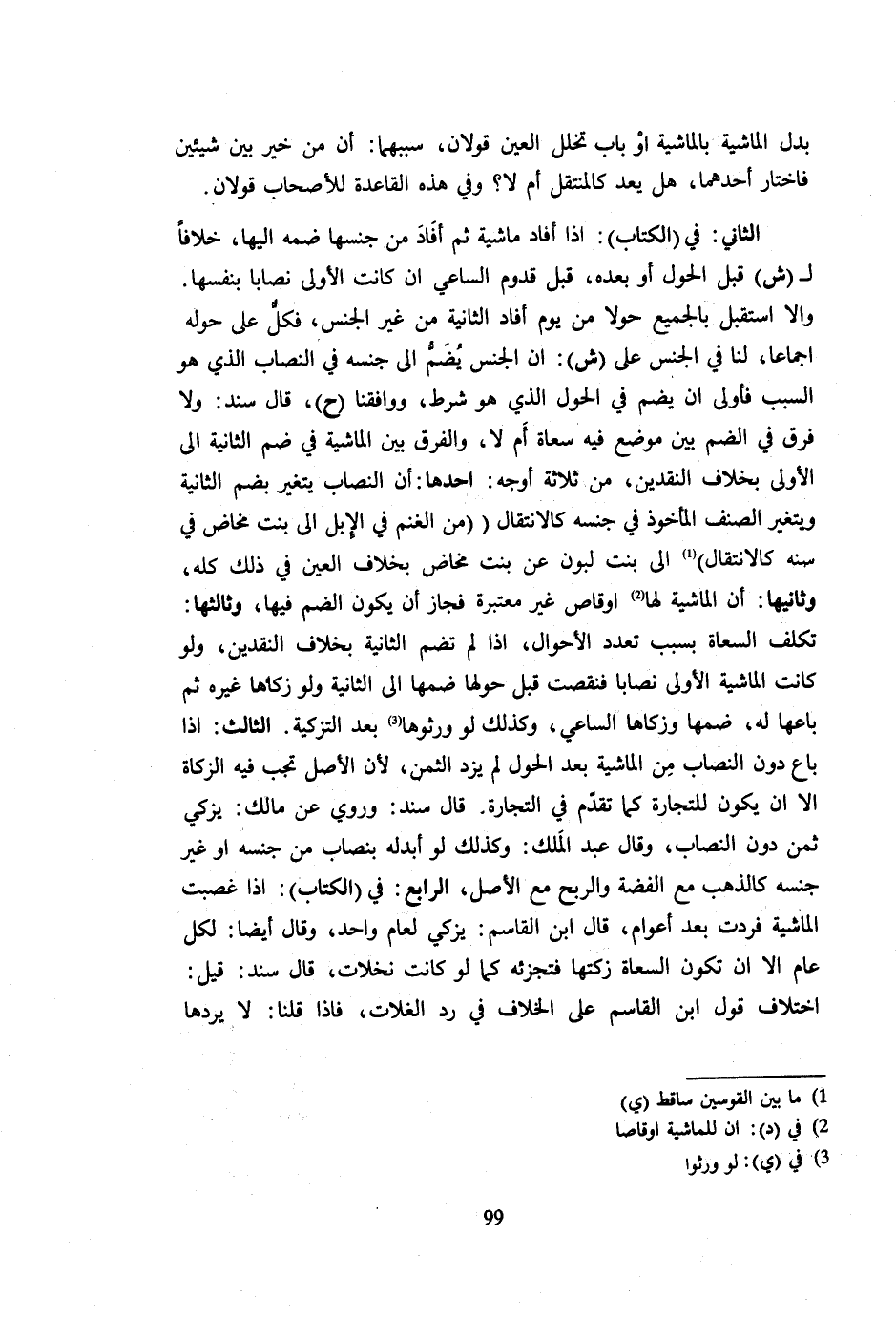 بَدَلِ الْمَاشِيَةِ بِالْمَاشِيَةِ أَوْ بَابِ تَخَلُّلِ الْعَيْنِ قَوْلَانِ سَبَبُهُمَا أَنَّ مَنْ خُيِّرَ بَيْنَ شَيْئَيْنِ فَاخْتَارَ أَحَدَهُمَا هَلْ يُعَدُّ كَالْمُنْتَقِلِ أَمْ لَا وَفِي هَذِهِ الْقَاعِدَةِ لِلْأَصْحَابِ قَوْلَانِ الثَّانِي فِي الْكِتَابِ إِذَا أَفَادَ مَاشِيَةً ثُمَّ أَفَادَ مِنْ جِنْسِهَا ضَمَّهُ إِلَيْهَا خِلَافًا لِ ش قَبْلَ الْحَوْلِ أَوْ بَعْدَهُ قَبْلَ قُدُومِ السَّاعِي إِنْ كَانَتِ الْأَوْلَى نِصَابًا بِنَفْسِهَا وَإِلَّا اسْتَقْبَلَ بِالْجَمِيعِ حَوْلًا مِنْ يَوْمِ أَفَادَ الثانيةَ مِنْ غَيْرِ الْجِنْسِ فَكُلٌّ عَلَى حَوْلِهِ إِجْمَاعًا لَنَا فِي الْجِنْسِ عَلَى ش أَنَّ الْجِنْسَ يُضَمُّ إِلَى جِنْسِهِ فِي النِّصَابِ الَّذِي هُوَ السَّبَبُ فَأَوْلَى أَنْ يُضَمَّ فِي الْحَوْلِ الَّذِي هُوَ شَرْطٌ وَوَافَقَنَا ح قَالَ سَنَدٌ وَلَا فَرْقَ فِي الضَّمِّ بَيْنَ مَوْضِعٍ فِيهِ سُعَاةٌ أَمْ لَا وَالْفَرْقُ بَيْنَ الْمَاشِيَةِ فِي ضَمِّ الثانيةِ إِلَى الْأَوْلَى بِخِلَافِ النَّقْدَيْنِ مِنْ ثَلَاثَةِ أَوْجُهٍ أَحَدُهَا أَنَّ النِّصَابَ يَتَغَيَّرُ بِضَمِّ الثانيةِ وَيَتَغَيَّرُ الصِّنْفُ الْمَأْخُوذُ فِي جِنْسِهِ كَالِانْتِقَالِ مِنَ الْغَنَمِ فِي الْإِبِلِ إِلَى بِنْتِ مَخَاضٍ فِي سَنَةٍ كَالِانْتِقَالِ إِلَى بِنْتِ لَبُونٍ عَنْ بِنْتِ مَخَاضٍ بِخِلَافِ الْعَيْنِ فِي ذَلِكَ كُلِّهِ وَثَانِيهَا أَنَّ الْمَاشِيَةَ لَهَا أَوَقَاصٌ غَيْرُ مُعْتَبَرَةٍ فَجَازَ أَنْ يَكُونَ الضَّمُّ فِيهَا وَثَالِثُهَا تَكَلُّفُ السُّعَاةِ بِسَبَبِ تَعَدُّدِ الْأَحْوَال إِذا لم تضم الثَّانِيَة بِخِلَافِ النَّقْدَيْنِ وَلَوْ كَانَتِ الْمَاشِيَةُ الْأُولَى نِصَابًا فَنَقَصَتْ قَبْلَ حَوْلِهَا ضَمَّهَا إِلَى الثانيةِ وَلَوْ زَكَّاهَا غَيْرُهُ ثُمَّ بَاعَهَا لَهُ ضَمَّهَا وَزَكَّاهَا السَّاعِي وَكَذَلِكَ لَوْ وَرِثُوهَا بَعْدَ التَّزْكِيَةِ الثَّالِثُ إِذَا بَاعَ دُونَ النِّصَابِ مِنَ الْمَاشِيَةِ بَعْدَ الْحَوْلِ لَمْ يَزِدِ الثَّمَنُ لِأَنَّ الْأَصْلَ تَجِبُ فِيهِ الزَّكَاةُ إِلَّا أَنْ يَكُونَ لِلتِّجَارَةِ كَمَا تَقَدَّمَ فِي التِّجَارَةِ قَالَ سَنَدٌ وَرُوِيَ عَنْ مَالِكٍ يُزَكِّي ثَمَنَ دُونِ النِّصَابِ وَقَالَ عَبْدُ الْمَلِكِ وَكَذَلِكَ لَوْ أَبْدَلَهُ بِنِصَابٍ مِنْ جِنْسِهِ أَوْ غَيْرِ جِنْسِهِ كَالذَّهَبِ مَعَ الْفِضَّةِ وَالرِّبْحِ مَعَ الْأَصْلِ الرَّابِعُ فِي الْكِتَابِ إِذَا غُصِبَتِ الْمَاشِيَةُ فَرُدَّتْ بَعْدَ أَعْوَامٍ قَالَ ابْنُ الْقَاسِمِ يُزَكِّي لِعَامٍ وَاحِدٍ وَقَالَ أَيْضًا لِكُلِّ عَامٍ إِلَّا أَن تكون السعاة زكتها فتجزئه كَمَا لَوْ كَانَتْ نَخَلَاتٍ قَالَ سَنَدٌ قِيلَ اخْتِلَاف قَول ابْن الْقَاسِم على الْخِلَافِ فِي رَدِّ الْغَلَّاتِ فَإِذَا قُلْنَا لَا يردهَا