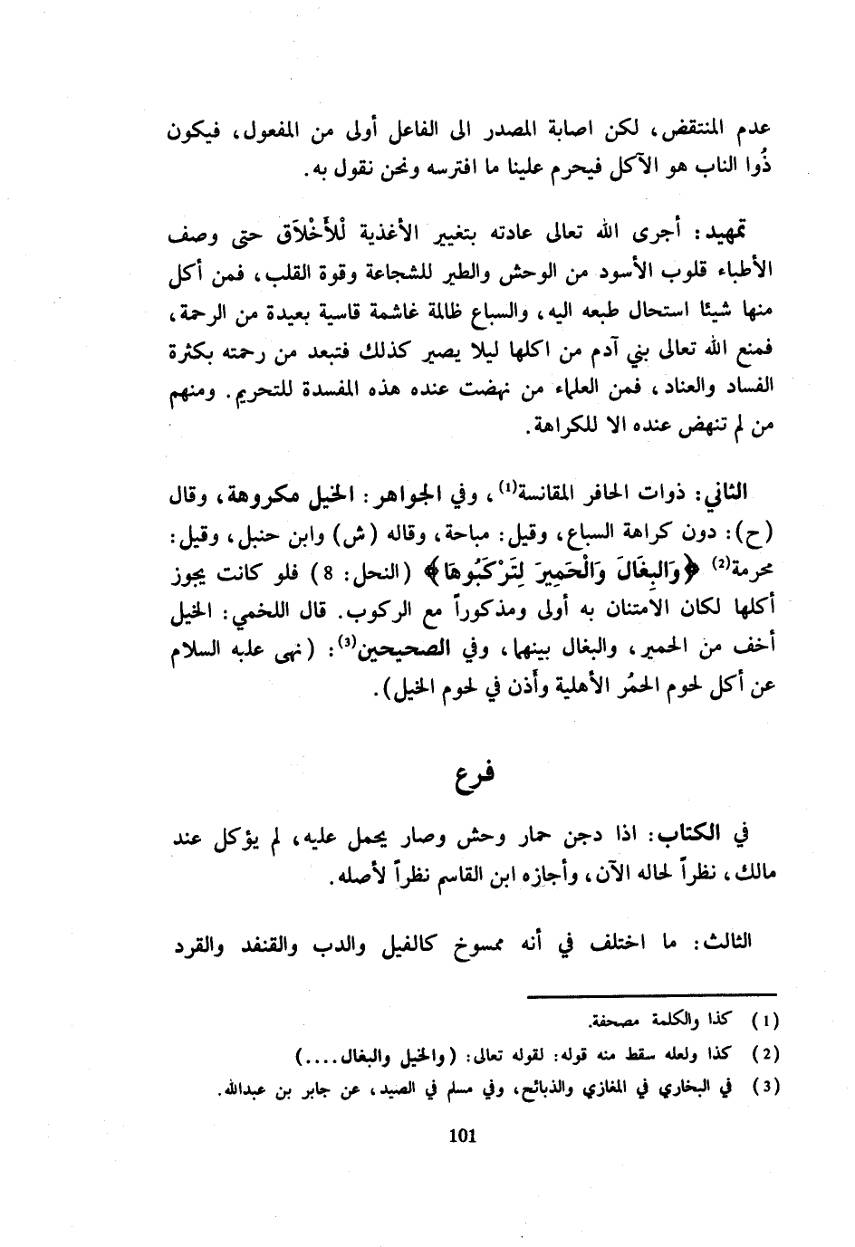 عدم المنتقض لَكِن أصابة الْمَصْدَرِ إِلَى الْفَاعِلِ أَوْلَى مِنَ الْمَفْعُولِ فَيَكُونُ ذَوا النَّابِ هُوَ الْآكِلَ فَيَحْرُمُ عَلَيْنَا مَا افْتَرَسَهُ وَنَحْنُ نَقُولُ بِهِ تَمْهِيدٌ أَجْرَى اللَّهُ تَعَالَى عَادَته بتغيير الأغذية للأخلاق حت وَصَفَ الْأَطِبَّاءُ قُلُوبَ الْأُسُودِ مِنَ الْوَحْشِ وَالطَّيْرِ لِلشَّجَاعَةِ وَقُوَّةِ الْقَلْبِ فَمَنْ أَكَلَ مِنْهَا شَيْئًا اسْتَحَالَ طَبْعُهُ إِلَيْهِ وَالسِّبَاعُ ظَالِمَةٌ غَاشِمَةٌ قَاسِيَةٌ بَعِيدَةٌ مِنَ الرَّحْمَةِ فَمَنَعَ اللَّهُ تَعَالَى بَنِي آدم من أكلهَا لَيْلًا يصير كَذَلِك فتعبد مِنْ رَحْمَتِهِ بِكَثْرَةِ الْفَسَادِ وَالْعِنَادِ فَمِنَ الْعُلَمَاءِ مَنْ نَهَضَتْ عِنْدَهُ هَذِهِ الْمَفْسَدَةُ لِلتَّحْرِيمِ وَمِنْهُمْ مَنْ لَمْ تَنْهَضْ عِنْدَهُ إِلَّا لِلْكَرَاهَةِ الثَّانِي ذَوَات الْحَافِر المقانسة وَفِي الْجَوَاهِرِ الْخَيْلُ مَكْرُوهَةٌ وَقَالَ ح دُونَ كَرَاهَةِ السِّبَاعِ وَقِيلَ مُبَاحَةٌ وَقَالَهُ ش وَابْنُ حَنْبَل وَقيل مُحرمَة {وَالْبِغَالَ وَالْحَمِيرَ لِتَرْكَبُوهَا} النَّحْل 8 فَلَوْ كَانَتْ يَجُوزُ أَكْلُهَا لَكَانَ الِامْتِنَانُ بِهِ أَوْلَى وَمَذْكُورًا مَعَ الرُّكُوبِ قَالَ اللَّخْمِيُّ الْخَيْلُ أَخَفُّ مِنَ الْحَمِيرِ وَالْبِغَالُ بَيْنَهُمَا وَفِي الصَّحِيحَيْنِ نَهَى عَلَيْهِ السَّلَامُ عَنْ أَكْلِ لُحُومِ الْحُمُرِ الْأَهْلِيَّةِ وَأَذِنَ فِي لُحُومِ الْخَيْلِ