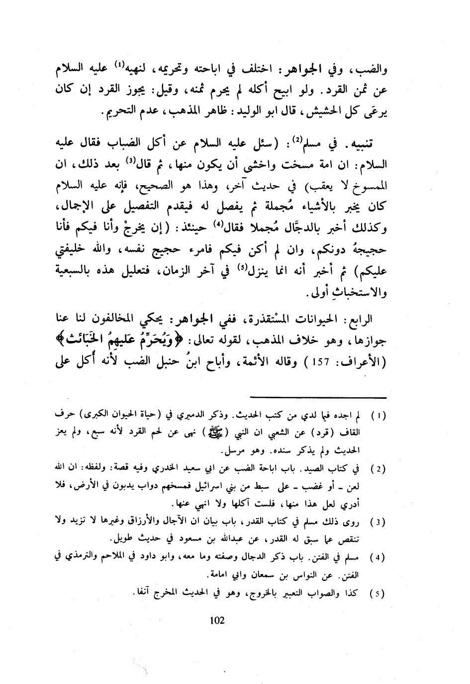 وَالضَّبِّ وَفِي الْجَوَاهِرِ اخْتُلِفَ فِي إِبَاحَتِهِ وَتَحْرِيمِهِ لِنَهْيِهِ عَلَيْهِ السَّلَامُ عَنْ ثَمَنِ الْقِرْدِ وَلَوْ أُبِيحَ أَكْلُهُ لَمْ يَحْرُمْ ثَمَنُهُ وَقِيلَ يَجُوزُ القرد إِن كَانَ يرْعَى كل الْحَشِيشِ قَالَ أَبُو الْوَلِيدِ ظَاهِرُ الْمَذْهَبِ عَدَمُ التَّحْرِيمِ تَنْبِيهٌ فِي مُسْلِمٍ سُئِلَ عَلَيْهِ السَّلَامُ عَنْ أَكْلِ الضِّبَابِ فَقَالَ عَلَيْهِ السَّلَامُ إِنَّ أُمَّةً مُسِخَتْ وَأَخْشَى أَنْ يَكُونَ مِنْهَا ثُمَّ قَالَ بَعْدَ ذَلِكَ أَنَّ الْمَمْسُوخَ لَا يُعَقِّبُ فِي حَدِيثٍ آخَرَ وَهَذَا هُوَ الصَّحِيحُ فَإِنَّهُ عَلَيْهِ السَّلَامُ كَانَ يُخْبَرُ بِالْأَشْيَاءِ مُجْمَلَةً ثُمَّ يُفَصَّلُ لَهُ فَيُقَدَّمُ التَّفْصِيلُ عَلَى الْإِجْمَالِ وَكَذَلِكَ أَخْبَرَ بِالدَّجَّالِ مُجْمَلًا فَقَالَ حِينَئِذٍ إِنْ يَخْرُجْ وَأَنَا فِيكُمْ فَأَنَا حَجِيجُهُ دُونَكُمْ وَإِنْ لَمْ أكن فِيكُم فامرء حَجِيجُ نَفْسِهِ وَاللَّهُ خَلِيفَتِي عَلَيْكُمْ ثُمَّ أُخْبِرَ أَنَّهُ إِنَّمَا يَنْزِلُ فِي آخِرِ الزَّمَانِ فَتَعْلِيلُ هَذِهِ بِالسَّبُعِيَّةِ وَالِاسْتِخْبَاثِ أَوْلَى الرَّابِعُ الْحَيَوَانَاتُ الْمُسْتَقْذَرَةُ فَفِي الْجَوَاهِرِ يَحْكِي الْمُخَالِفُونَ لَنَا عَنَّا جَوَازَهَا وَهُوَ خِلَافُ الْمَذْهَبِ لِقَوْلِهِ تَعَالَى {وَيُحَرِّمُ عَلَيْهِمُ الْخَبَائِث} الْأَعْرَاف 157 وَقَالَهُ الْأَئِمَّة وأباح ابْنُ حَنْبَلٍ الضَّبَّ لِأَنَّهُ أُكِلَ عَلَى