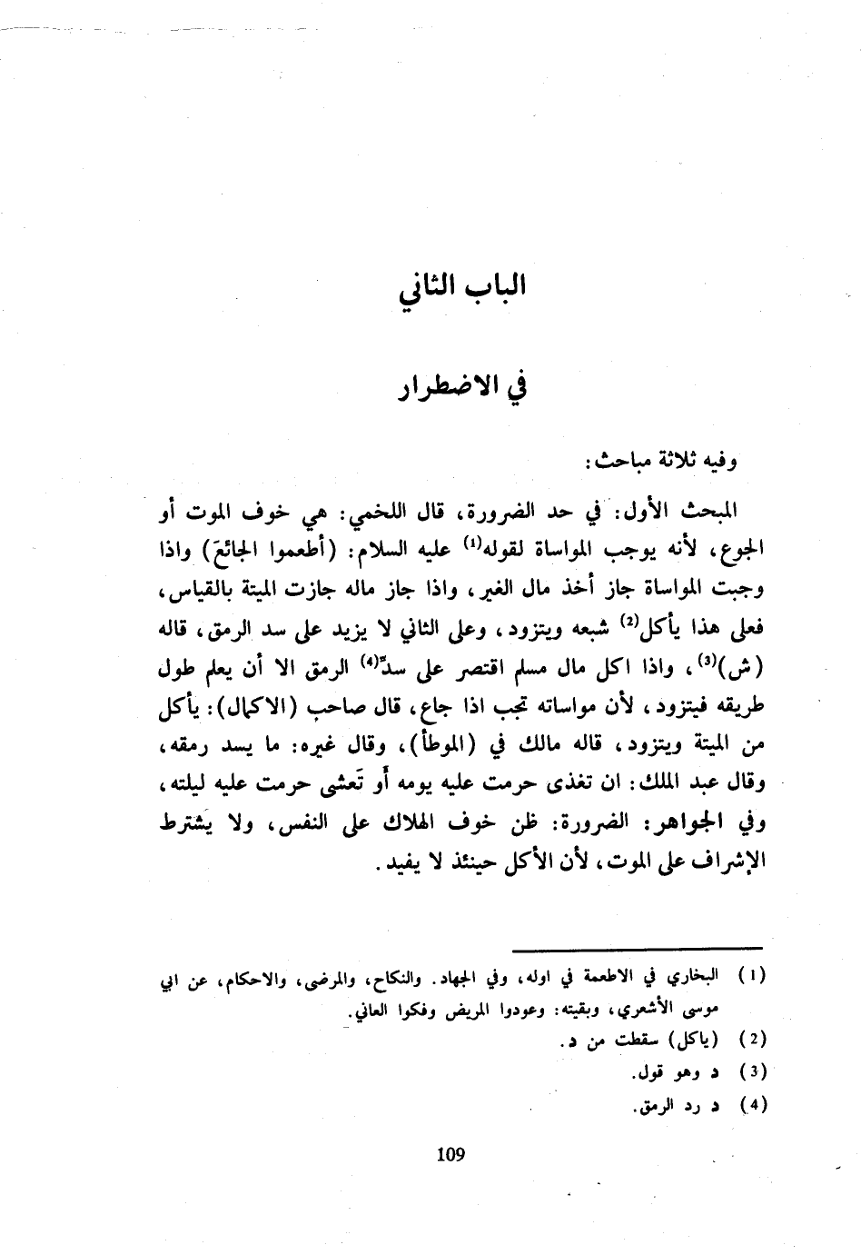 2 - وَفِيه ثَلَاثَة مياحث الْمَبْحَثُ الْأَوَّلُ فِي حَدِّ الضَّرُورَةِ قَالَ اللَّخْمِيُّ هِيَ خَوْفُ الْمَوْتِ أَوِ الْجُوعِ لِأَنَّهُ يُوجِبُ الْمُوَاسَاةَ لِقَوْلِهِ عَلَيْهِ السَّلَامُ أَطْعِمُوا الْجَائِعَ وَإِذَا وَجَبَتِ الْمُوَاسَاةُ جَازَ أَخْذُ مَالِ الْغَيْرِ وَإِذَا جَازَ مَالُهُ جَازَتِ الْمَيْتَةُ بِالْقِيَاسِ فَعَلَى هَذَا يَأْكُلُ شِبَعَهُ وَيَتَزَوَّدُ وَعَلَى الثَّانِي لَا يَزِيدُ عَلَى سَدِّ الرَّمَقِ قَالَهُ ش وَإِذَا أَكَلَ مَالَ مُسْلِمٍ اقْتَصَرَ عَلَى سَدِّ الرَّمَقِ إِلَّا أَنْ يَعْلَمَ طُولَ طَرِيقِهِ فَيَتَزَوَّدَ لِأَنَّ مُوَاسَاتَهُ تَجِبُ إِذَا جَاعَ قَالَ صَاحِبُ الْإِكْمَالِ يَأْكُلُ مِنَ الْمَيْتَةِ وَيَتَزَوَّدُ قَالَ مَالِكٌ فِي الْمُوَطَّأِ وَقَالَ غَيْرُهُ مَا يَسُدُّ رَمَقَهُ وَقَالَ عَبْدُ الْمَلِكِ أَن تغذى حرمت عَلَيْهِ يَوْمه أَو تغشى حُرِّمَتْ عَلَيْهِ لَيْلَتَهُ وَفِي الْجَوَاهِرِ الضَّرُورَةُ ظَنُّ خَوْفِ الْهَلَاكِ عَلَى النَّفْسِ وَلَا يُشْتَرَطُ الْإِشْرَافُ عَلَى الْمَوْتِ لِأَنَّ الْأَكْلَ حِينَئِذٍ لَا يُفِيدُ