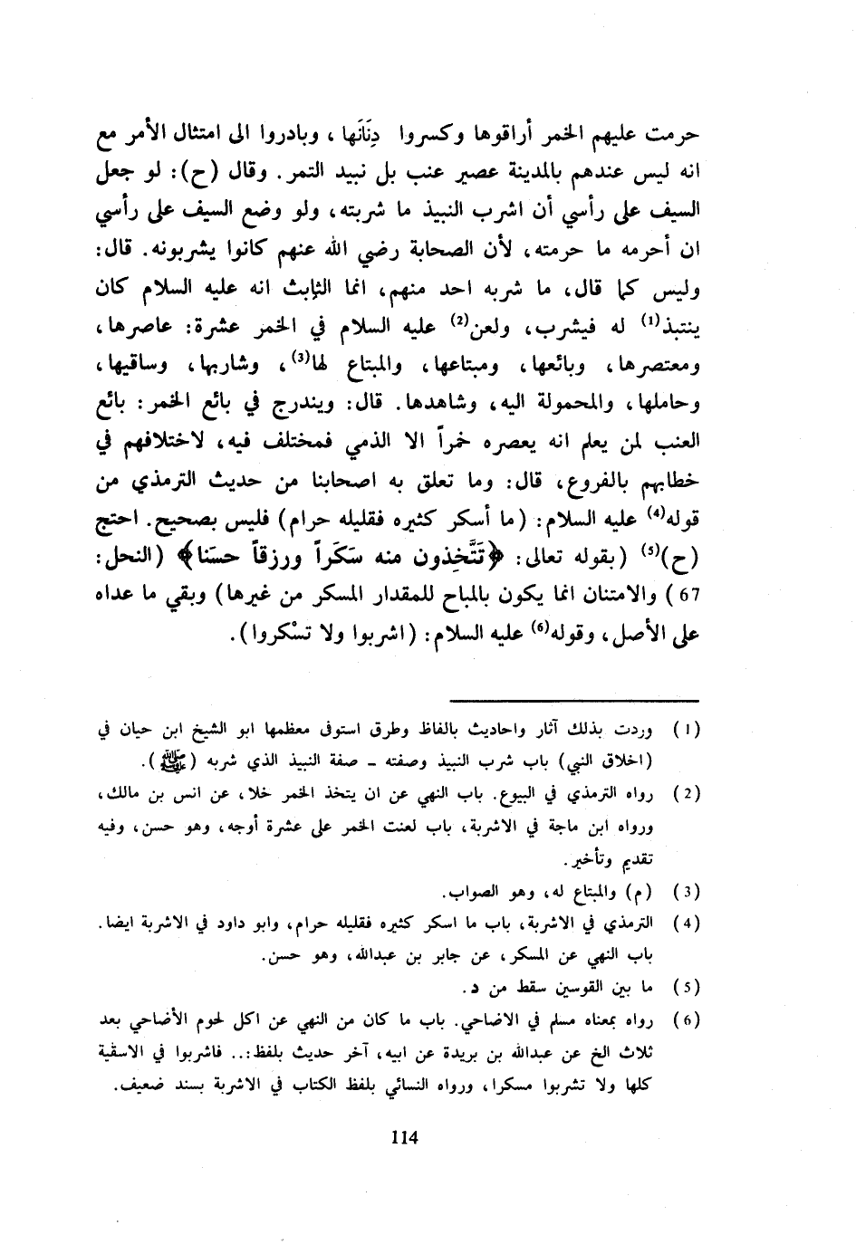 حُرِّمَتْ عَلَيْهِمُ الْخَمْرُ أَرَاقُوهَا وَكَسَرُوا دِنَانَهَا وَبَادَرُوا إِلَى امْتِثَالِ الْأَمْرِ مَعَ أَنَّهُ لَيْسَ عِنْدَهُمْ بِالْمَدِينَةِ عَصِيرُ عِنَبٍ بَلْ نَبِيذُ التَّمْرِ وَقَالَ ح لَوْ جُعِلَ السَّيْفُ عَلَى رَأْسِي أَنْ أَشْرَبَ النَّبِيذَ مَا شَرِبْتُهُ وَلَوْ وُضِعَ السَّيْفُ عَلَى رَأْسِي أَنْ أُحَرِّمَهُ مَا حَرَّمْتُهُ لِأَنَّ الصَّحَابَةَ رَضِيَ اللَّهُ عَنْهُمْ كَانُوا يَشْرَبُونَهُ قَالَ وَلَيْسَ كَمَا قَالَ مَا شَرِبَهُ أَحَدٌ مِنْهُمْ إِنَّمَا النَّابِت أَنَّهُ عَلَيْهِ السَّلَامُ كَانَ يُنْتَبَذُ لَهُ فَيَشْرَبُ وَلَعَنَ عَلَيْهِ السَّلَامُ فِي الْخَمْرِ عَشَرَةً عَاصِرَهَا وَمُعْتَصِرَهَا وَبَائِعَهَا وَمُبْتَاعَهَا وَالْمُبْتَاعَ لَهَا وَشَارِبَهَا وَسَاقِيَهَا وَحَامِلَهَا وَالْمَحْمُولَةَ إِلَيْهِ وَشَاهِدَهَا قَالَ وَيَنْدَرِجُ فِي بَائِعِ الْخَمْرِ بَائِعُ الْعِنَبِ لِمَنْ يَعْلَمُ أَنَّهُ يَعْصِرُهُ خَمْرًا إِلَّا الذِّمِّيَّ فَمُخْتَلَفٌ فِيهِ لِاخْتِلَافِهِمْ فِي خِطَابِهِمْ بِالْفُرُوعِ قَالَ وَمَا تَعَلَّقَ بِهِ أَصْحَابُنَا مِنْ حَدِيثِ التِّرْمِذِيِّ مِنْ قَوْلِهِ عَلَيْهِ السَّلَامُ مَا أَسْكَرَ كَثِيرُهُ فَقَلِيلُهُ حَرَامٌ فَلَيْسَ بِصَحِيح احْتَجَّ ح بِقَوْلِهِ تَعَالَى {تَتَّخِذُونَ مِنْهُ سَكَرًا وَرِزْقًا حَسَنًا} النَّحْل 67 وَالِامْتِنَانُ إِنَّمَا يَكُونُ بِالْمُبَاحِ لِلْمِقْدَارِ الْمُسْكِرِ مِنْ غَيْرِهَا وَبَقِيَ مَا عَدَاهُ عَلَى الْأَصْلِ وَقَوْلِهِ عَلَيْهِ السَّلَامُ اشْرَبُوا وَلَا تسكروا