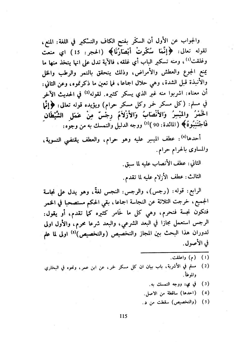 وَالْجَوَابُ عَنِ الْأَوَّلِ أَنَّ السَّكَرَ بِفَتْحِ الْكَافِ وَالتَّسْكِيرَ فِي اللُّغَةِ الْمَنْعُ لِقَوْلِهِ تَعَالَى {إِنَّمَا سكرت أبصارنا} الْحجر 15 أَي منعت وغلقت وَمنع تَسْكِيرُ الْبَابِ أَيْ غَلْقُهُ فَالْآيَةُ تَدُلُّ عَلَى أَنَّهَا يُتَّخَذُ مِنْهَا مَا يَمْنَعُ الْجُوعَ وَالْعَطَشَ وَالْأَمْرَاضَ وَذَلِكَ يَتَحَقَّقُ بِالتَّمْرِ وَالرُّطَبِ وَالْخَلِّ وَالْأَنْبِذَةِ قَبْلَ الشِّدَّةِ وَهِيَ حَلَالٌ إِجْمَاعًا فَمَا تَعَيَّنَ مَا ذَكَرْتُمُوهُ وَعَنِ الثَّانِي أَنَّ مَعْنَاهُ اشْرَبُوا مِنْهُ غَيْرَ الَّذِي يُسْكِرُ كَثِيرُهُ لِقَوْلِهِ فِي الْحَدِيثِ الْآخَرِ فِي مُسْلِمٍ كُلُّ مُسْكِرٍ خَمْرٌ وَكُلُّ مُسْكِرٍ حَرَامٌ وَيُؤَيِّدُهُ قَوْله تَعَالَى {إِنَّمَا الْخَمْرُ وَالْمَيْسِرُ وَالأَنْصَابُ وَالأَزْلامُ رِجْسٌ مِنْ عَمَلِ الشَّيْطَان فَاجْتَنبُوهُ} الْمَائِدَة 90 وَوَجْهُ الدَّلِيلِ وَالتَّمَسُّكِ بِهِ مِنْ وُجُوهٍ أَحَدُهَا عَطْفُ الْمَيْسِرِ عَلَيْهِ وَهُوَ حَرَامٌ وَالْعَطْفُ يَقْتَضِي التَّسْوِيَةَ وَالْمُسَاوَى بِالْحَرَامِ حَرَامٌ الثَّانِي عَطْفُ الأنصاب عَلَيْهِ لما سبق الثَّالِث عطف الأزلام عَلَيْهِ لِمَا تَقَدَّمَ الرَّابِعُ قَوْلُهُ رِجْسٌ وَالرِّجْسُ النَّجَسُ لُغَةً وَهُوَ يَدُلُّ عَلَى نَجَاسَةِ الْجَمِيعِ خَرَجَتِ الثَّلَاثَةُ عَنِ النَّجَاسَةِ إِجْمَاعًا بَقِيَ الْحُكْمُ مُسْتَصْحَبًا فِي الْخَمْرِ فَتَكُونُ نَجِسَةً فَتَحْرُمُ وَهِيَ كُلُّ مَا خَامَرَ كَثِيرُهُ كَمَا تَقَدَّمَ أَوْ يَقُولُ الرِّجْسُ اسْتُعْمِلَ مَجَازًا فِي الْبُعْدِ الشَّرْعِيِّ وَالْبُعْدُ شَرْعًا مُحَرَّمٌ وَالْأَوَّلُ أَوْلَى لِدَوَرَانِ هَذَا الْبَحْثِ بَيْنَ الْمَجَازِ وَالتَّخْصِيصِ وَالتَّخْصِيصُ أَوْلَى لِمَا عُلِمَ فِي الْأُصُولِ