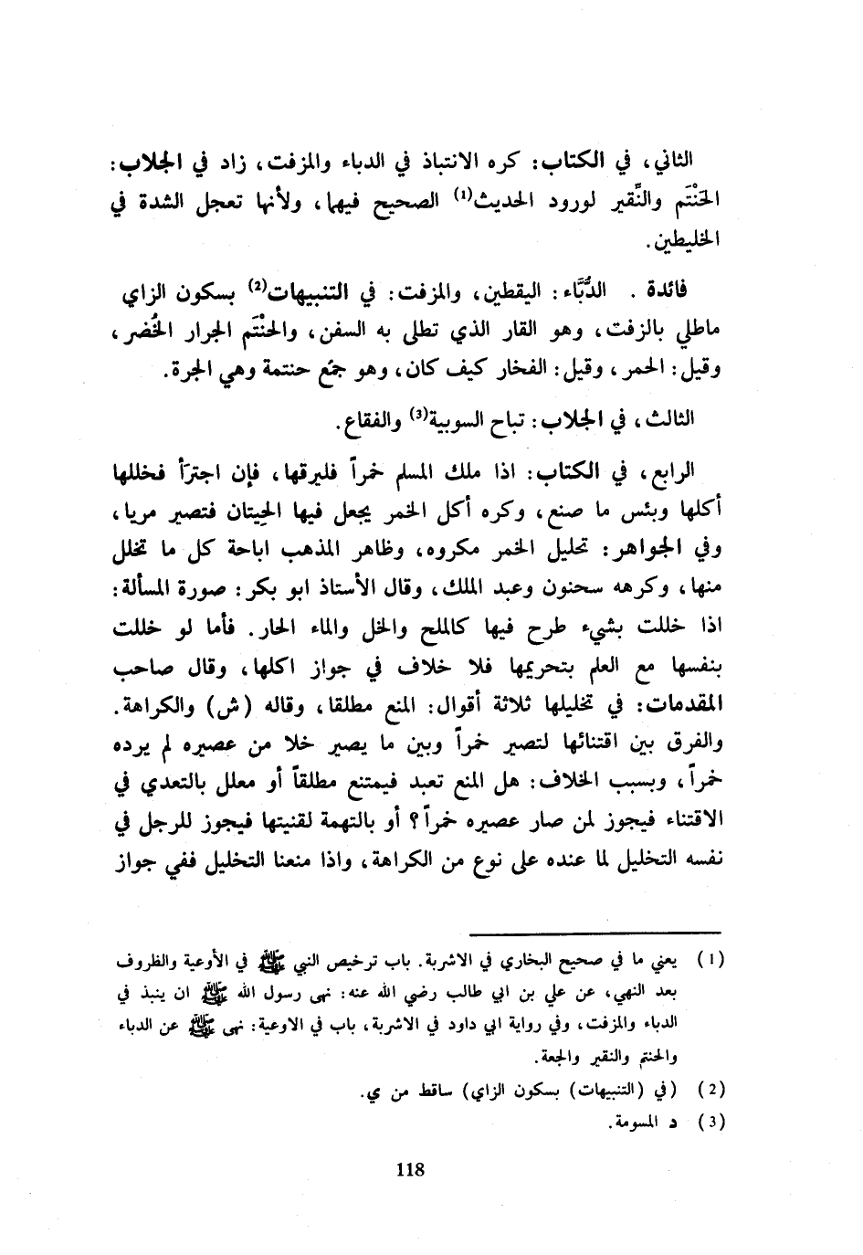 الثَّانِي فِي الْكِتَابِ كُرِهَ الِانْتِبَاذُ فِي الدُّبَّاءِ وَالْمُزْفَتِ زَادَ فِي الْجَلَّابِ الْحُنْتُمَ وَالنَّقِيرَ لِوُرُودِ الْحَدِيثِ الصَّحِيحِ فِيهِمَا وَلِأَنَّهَا تُعَجِّلُ الشِّدَّةَ فِي الْخَلِيطَيْنِ فَائِدَةٌ الدُّبَّاءُ الْيَقْطِينُ وَالْمُزْفَتُ فِي التَّنْبِيهَاتِ بِسُكُون الزَّاي ماطلي بِالزِّفْتِ وَهُوَ الْقَارُ الَّذِي تُطْلَى بِهِ السُّفُنُ وَالْحُنْتُمُ الْجِرَارُ الْخُضْرُ وَقِيلَ الْحُمْرُ وَقِيلَ الْفَخَّارُ كَيْفَ كَانَ وَهُوَ جَمْعُ حَنْتَمَةٍ وَهِيَ الْجَرَّةُ الثَّالِث فِي الْجلاب تُبَاح السوبية وَالْفُقَّاعُ الرَّابِعُ فِي الْكِتَابِ إِذَا مَلَكَ الْمُسْلِمُ خَمْرًا فَلْيُرِقْهَا فَإِنِ اجْتَرَأَ فَخَلَّلَهَا أَكَلَهَا وَبِئْسَ مَا صَنَعَ وَكَرِهَ أَكْلَ الْخَمْرِ يُجْعَلُ فِيهَا الْحيتَان فَتَصِير مريا وَفِي الْجَوَاهِر تَحْلِيل الْخَمْرِ مَكْرُوهٌ وَظَاهِرُ الْمَذْهَبِ إِبَاحَةُ كُلِّ مَا تَخَلَّلَ مِنْهَا وَكَرِهَهُ سَحْنُونٌ وَعَبْدُ الْمَلِكِ وَقَالَ الْأُسْتَاذُ أَبُو بَكْرٍ صُورَةُ الْمَسْأَلَةِ إِذَا خُلِّلَتْ بِشَيْءٍ طُرِحَ فِيهَا كَالْمِلْحِ وَالْخَلِّ وَالْمَاءِ الْحَارِّ فَأَمَّا لَوْ خُلِّلَتْ بِنَفْسِهَا مَعَ الْعِلْمِ بِتَحْرِيمِهَا فَلَا خِلَافَ فِي جَوَازِ أَكْلِهَا وَقَالَ صَاحِبُ الْمُقَدَّمَاتِ فِي تَخْلِيلِهَا ثَلَاثَةُ أَقْوَالٍ الْمَنْعُ مُطْلَقًا وَقَالَهُ ش وَالْكَرَاهَةُ وَالْفَرْقُ بَيْنَ اقْتِنَائِهَا لِتَصِيرَ خمرًا وَبَيْنَ مَا يَصِيرُ خَلًّا مِنْ عَصِيرِهِ لَمْ يردهُ خمرًا وبسبب الْخِلَافِ هَلِ الْمَنْعُ تَعَبُّدٌ فَيَمْتَنِعُ مُطْلَقًا أَوْ مُعَلَّلٌ بِالتَّعَدِّي فِي الِاقْتِنَاءِ فَيَجُوزُ لِمَنْ صَارَ عصيره خمرًا أَو بالتهمة لقنيتها فَيَجُوزُ لِلرَّجُلِ فِي نَفْسِهِ التَّخْلِيلُ لِمَا عِنْدَهُ عَلَى نَوْعٍ مِنَ الْكَرَاهَةِ وَإِذَا مَنَعْنَا التَّخْلِيلَ فَفِي جَوَاز