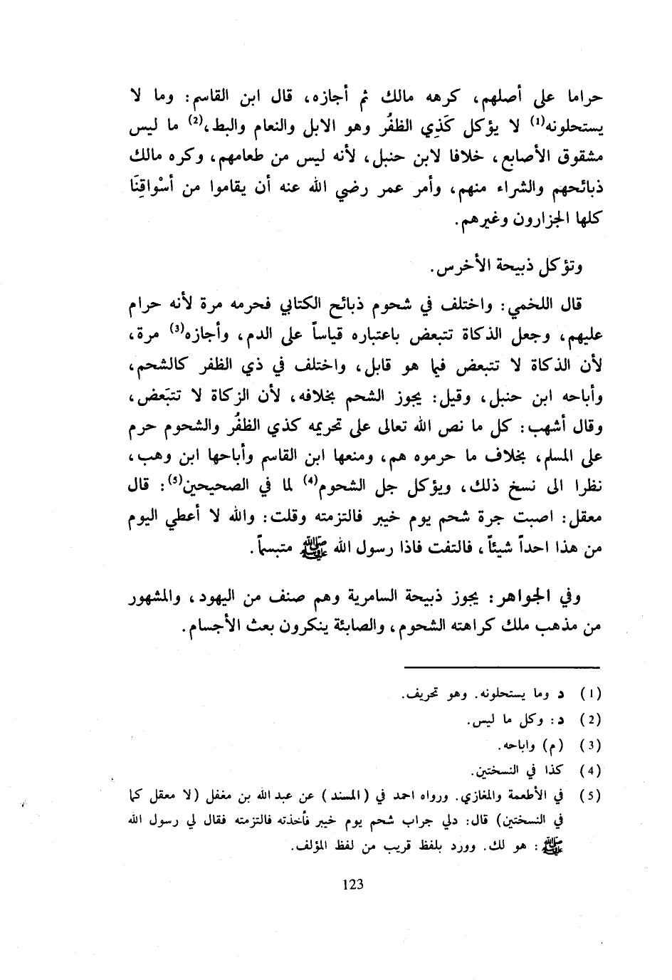 حَرَامًا عَلَى أَصْلِهِمْ كَرِهَهُ مَالِكٌ ثُمَّ أَجَازَهُ قَالَ ابْنُ الْقَاسِمِ وَمَا لَا يَسْتَحِلُّونَهُ لَا يُؤْكَلُ كَذِي الظُّفْرِ وَهُوَ الْإِبِلُ وَالنَّعَامُ وَالْبَطُّ مَا لَيْسَ مَشْقُوقَ الْأَصَابِعِ خِلَافًا لِابْنِ حَنْبَلٍ لِأَنَّهُ لَيْسَ مِنْ طَعَامِهِمْ وَكَرِهَ مَالِكٌ ذَبَائِحَهُمْ وَالشِّرَاءَ مِنْهُمْ وَأَمَرَ عُمَرُ رَضِيَ اللَّهُ عَنْهُ ان يقاموا مِنْ أَسْوَاقِنَا كُلِّهَا الْجَزَّارُونَ وَغَيْرِهِمْ وَتُؤْكَلُ ذَبِيحَةُ الْأَخْرَسِ قَالَ اللَّخْمِيُّ وَاخْتُلِفَ فِي شُحُومِ ذَبَائِحِ الْكِتَابِيِّ فَحَرَّمَهُ مَرَّةً لِأَنَّهُ حَرَامٌ عَلَيْهِمْ وَجَعَلَ الذَّكَاة تتبعض بِاعْتِبَارِهِ قِيَاسا على الدَّم وَأَجَازَهُ مرّة لِأَن الذَّكَاة لَا تتبعض فِيمَا هُوَ قَابل وَاخْتُلِفَ فِي ذِي الظُّفْرِ كَالشَّحْمِ وَأَبَاحَهُ ابْنُ حَنْبَل وَقيل يجوز الشَّحْم بخلافة لِأَن الزَّكَاة لَا تَتَبَعَّضُ وَقَالَ أَشْهَبُ كُلُّ مَا نَصَّ اللَّهُ تَعَالَى عَلَى تَحْرِيمِهِ كَذِي الظُّفْرِ وَالشُّحُومِ حُرِّمَ عَلَى الْمُسْلِمِ بِخِلَافِ مَا حَرَّمُوهُ هُمْ وَمَنَعَهَا ابْنُ الْقَاسِمِ وَأَبَاحَهَا ابْنُ وَهْبٍ نَظَرًا إِلَى نسخ ذَلِك ويؤكل جلّ السحوم لما فِي الصَّحِيحَيْنِ قَالَ معقل أصبت جرة شَحْمٍ يَوْمَ خَيْبَرَ فَالْتَزَمْتُهُ وَقُلْتُ وَاللَّهِ لَا أُعْطِي الْيَوْمَ مِنْ هَذَا أَحَدًا شَيْئًا فَالْتَفَتُّ فَإِذَا رَسُولُ اللَّهِ - صَلَّى اللَّهُ عَلَيْهِ وَسَلَّم َ - فتبسما وَفِي الْجَوَاهِر يجوز ذَبِيحَة السامرية وهم صنف من الْيَهُود وَالْمَشْهُور من مَذْهَب ملك كَرَاهَته الشحوم والصابئة يُنْكِرُونَ بَعْثَ الْأَجْسَامِ