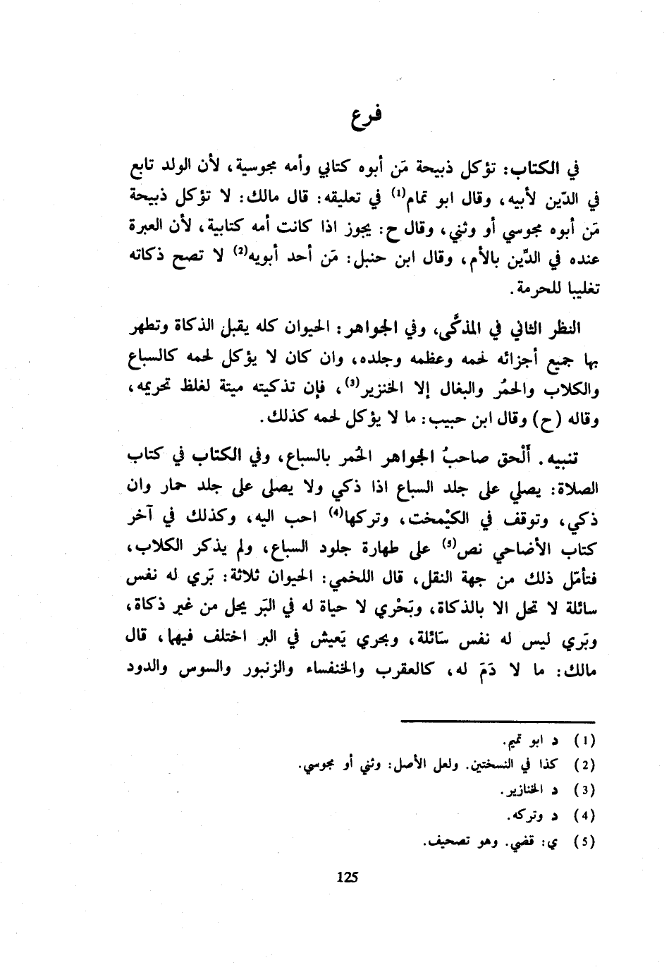 فِي الْكِتَابِ تُؤْكَلُ ذَبِيحَةُ مَنْ أَبُوهُ كِتَابِيٌّ وَأُمُّهُ مَجُوسِيَّةٌ لِأَنَّ الْوَلَدَ تَابِعٌ فِي الدِّينِ لِأَبِيهِ وَقَالَ أَبُو تَمَّامٍ فِي تَعْلِيقِهِ قَالَ مَالِكٌ لَا تُؤْكَل ذَبِيحَة من أَبوهُ محوسي أَوْ وَثَنِيٌّ وَقَالَ ح يَجُوزُ إِذَا كَانَتْ أمة كِتَابِيَّةً لِأَنَّ الْعِبْرَةَ عِنْدَهُ فِي الدِّينِ بِالْأُمِّ وَقَالَ ابْنُ حَنْبَلٍ مَنْ أَحَدُ أَبَوَيْهِ لَا تَصِحُّ ذَكَاتُهُ تَغْلِيبًا لِلْحُرْمَةِ النَّظَرُ الثَّانِي فِي الْمُذَكَّى وَفِي الْجَوَاهِرِ الْحَيَوَانُ كُلُّهُ يَقْبَلُ الذَّكَاةَ وَتَطْهُرُ بِهَا جَمِيعُ أَجْزَائِهِ لَحْمِهِ وَعَظْمِهِ وَجِلْدِهِ وَإِنْ كَانَ لَا يُؤْكَلُ لَحْمُهُ كَالسِّبَاعِ وَالْكِلَابِ وَالْحُمُرِ وَالْبِغَالِ إِلَّا الْخِنْزِيرَ فَإِنَّ تَذْكِيَتَهُ ميتَة لغلط تَحْرِيمِهِ وَقَالَهُ ح وَقَالَ ابْنُ حَبِيبٍ مَا لَا يُؤْكَلُ لَحْمُهُ كَذَلِكَ تَنْبِيهٌ أَلْحَقَ صَاحِبُ الْجَوَاهِرِ الْحُمُرَ بِالسِّبَاعِ وَفِي الْكِتَابِ فِي كِتَابِ الصَّلَاةِ يُصَلَّى عَلَى جِلْدِ السِّبَاعِ إِذَا ذُكِّيَ وَلَا يُصَلَّى عَلَى جِلْدِ حِمَارٍ وَإِنْ ذُكِّيَ وَتَوَقَّفَ فِي الْكَيْمَخْتِ وَتَرْكُهَا أَحَبُّ إِلَيْهِ وَكَذَلِكَ فِي آخِرِ كِتَابِ الْأَضَاحِيِّ نَصَّ عَلَى طَهَارَةِ جُلُودِ السِّبَاعِ وَلَمْ يَذْكُرِ الْكِلَابَ فَتَأَمَّلْ ذَلِكَ مِنْ جِهَةِ النَّقْلِ قَالَ اللَّخْمِيُّ الْحَيَوَانُ ثَلَاثَةٌ بَرِّيٌّ لَهُ نَفْسٌ سَائِلَةٌ لَا تَحِلُّ إِلَّا بِالذَّكَاةِ وَبَحْرِيٌّ لَا حَيَاةَ لَهُ فِي الْبَرِّ يَحِلُّ مِنْ غَيْرِ ذَكَاةٍ وَبَرِّيٌّ لَيْسَ لَهُ نفس سَائِلَة وبحري يعيس فِي الْبَرِّ اخْتُلِفَ فِيهِمَا قَالَ مَالِكٌ مَا لَا دَمَ لَهُ كَالْعَقْرَبِ وَالْخُنْفُسَاءِ وَالزُّنْبُورِ وَالسُّوسِ والدود