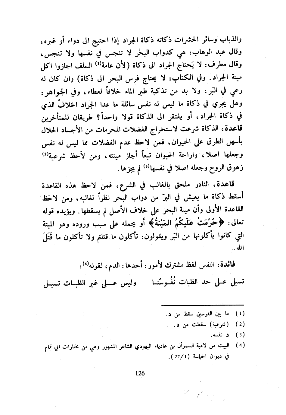 وَالذُّبَابِ وَسَائِرِ الْحَشَرَاتِ ذَكَاتُهُ ذَكَاةُ الْجَرَادِ إِذَا احْتِيجَ إِلَى دَوَاءٍ أَوْ غَيْرِهِ وَقَالَ عَبْدُ الْوَهَّابِ هِيَ كَدَوَابِّ الْبَحْرِ لَا تَنْجُسُ فِي نَفْسِهَا وَلَا تُنَجِّسُ وَقَالَ مُطَرِّفٌ لَا يَحْتَاجُ الْجَرَادُ إِلَى ذَكَاةٍ لِأَنَّ عَامَّةَ السَّلَفِ أَجَازُوا أَكْلَ مَيْتَةِ الْجَرَادِ وَفِي الْكِتَابِ لَا يَحْتَاجُ فَرَسُ الْبَحْرِ إِلَى ذَكَاةٍ وَإِنْ كَانَ لَهُ رَعْيٌ فِي الْبَرِّ وَلَا بُدَّ مِنْ تَذْكِيَةِ طَيْرِ الْمَاءِ خِلَافًا لِعَطَاءٍ وَفِي الْجَوَاهِرِ وَهَلْ يَجْرِي فِي ذَكَاةِ مَا لَيْسَ لَهُ نَفْسٌ سَائِلَةٌ مَا عَدَا الْجَرَادَ الْخِلَافُ الَّذِي فِي ذَكَاةِ الْجَرَادِ أَوْ يَفْتَقِرُ إِلَى الذَّكَاةِ قَوْلًا وَاحِدًا طَرِيقَانِ لِلْمُتَأَخِّرِينَ قَاعِدَةٌ الذَّكَاةُ شُرِعَتْ لِاسْتِخْرَاجِ الْفَضَلَاتِ الْمُحَرَّمَاتِ مِنَ الْأَجْسَادِ الْحَلَالِ بِأَسْهَلِ الطُّرُقِ عَلَى الْحَيَوَانِ فَمَنْ لَاحَظَ عَدَمَ الْفَضَلَاتِ مِمَّا لَيْسَ لَهُ نَفْسٌ وَجَعَلَهَا أَصْلًا وَإِرَاحَةَ الْحَيَوَانِ تِبَعًا أَجَازَ مَيْتَتَهُ وَمَنْ لَاحَظَ شَرْعِيَّةَ زُهُوقِ الرُّوحِ وَجَعَلَهُ أَصْلًا فِي نَفْسِهَا لَمْ يُجِزْهَا قَاعِدَةٌ النَّادِرُ مُلْحَقٌ بِالْغَالِبِ فِي الشَّرْعِ فَمَنْ لَاحَظَ هَذِهِ الْقَاعِدَةَ أَسْقَطَ ذَكَاةَ مَا يَعِيشُ فِي الْبَرِّ مِنْ دَوَابِّ الْبَحْرِ نَظَرًا لِغَالِبِهِ وَمَنْ لَاحَظَ الْقَاعِدَةَ الْأُولَى وَأَنَّ مَيْتَةَ الْبَحْرِ عَلَى خِلَافِ الْأَصْلِ لَمْ يُسْقِطْهَا وَيُؤَيِّدُهُ قَوْله تَعَالَى {حرمت عَلَيْكُم الْميتَة} أَوْ يَحْمِلُهُ عَلَى سَبَبِ وُرُودِهِ وَهُوَ الْمَيْتَةُ الَّتِي كَانُوا يَأْكُلُونَهَا مِنَ الْبَرِّ وَيَقُولُونَ تَأْكُلُونَ مَا قَتَلْتُمْ وَلَا تَأْكُلُونَ مَا قَتَلَ اللَّهُ فَائِدَةٌ النَّفْسُ لَفْظٌ مُشْتَرَكٌ لِأُمُورٍ أَحَدُهَا الدَّمُ لِقَوْلِهِ