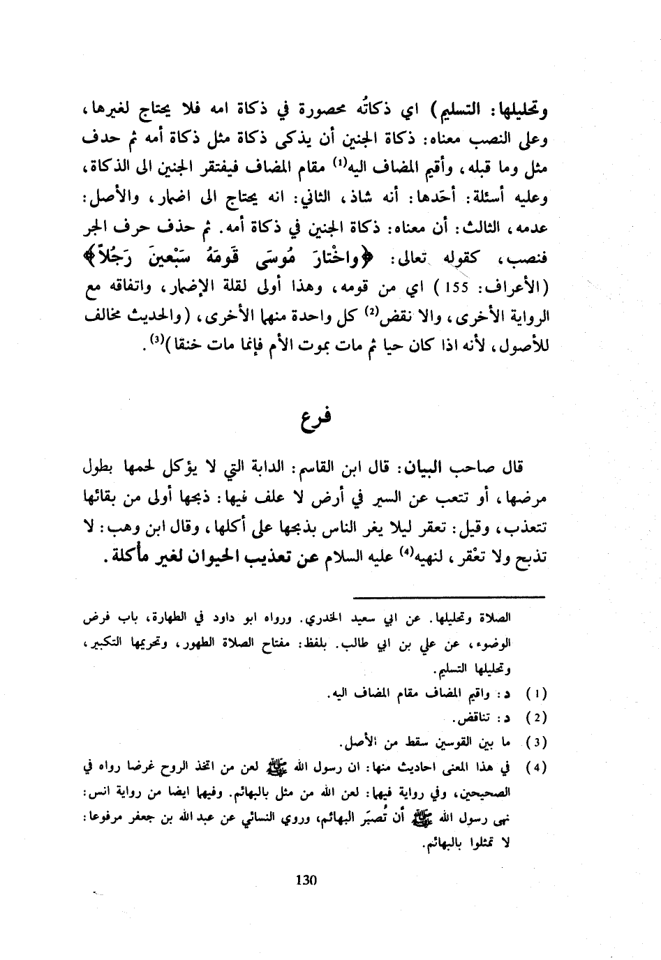 وَتَحْلِيلُهَا التَّسْلِيمُ أَيْ ذَكَاتُهُ مَحْصُورَةٌ فِي ذَكَاةِ أُمِّهِ فَلَا يُحْتَاجُ لِغَيْرِهَا وَعَلَى النَّصْبِ مَعْنَاهُ ذَكَاةُ الْجَنِينِ أَنْ يُذَكَّى ذَكَاةً مِثْلَ ذَكَاةِ أمه ثمَّ حدف مِثْلُ وَمَا قَبْلَهُ وَأُقِيمَ الْمُضَافُ إِلَيْهِ مَقَامَ الْمُضَافِ فَيَفْتَقِرُ الْجَنِينُ إِلَى الذَّكَاةِ وَعَلَيْهِ أَسْئِلَةٌ أَحَدُهَا أَنَّهُ شَاذٌّ الثَّانِي أَنَّهُ يَحْتَاجُ إِلَى إِضْمَارٍ وَالْأَصْلُ عَدَمُهُ الثَّالِثُ أَنَّ مَعْنَاهُ ذَكَاةُ الْجَنِينِ فِي ذَكَاةِ أُمِّهِ ثُمَّ حُذِفَ حَرْفُ الْجَرِّ فَنُصِبَ كَقَوْلِهِ تَعَالَى {وَاخْتَارَ مُوسَى قَوْمَهُ سَبْعِينَ رَجُلا} الْأَعْرَاف 155 أَيْ مِنْ قَوْمِهِ وَهَذَا أَوْلَى لِقِلَّةِ الْإِضْمَارِ وَاتِّفَاقِهِ مَعَ الرِّوَايَةِ الْأُخْرَى وَإِلَّا نَقَضَ كُلُّ وَاحِدَةٍ مِنْهُمَا الْأُخْرَى وَالْحَدِيثُ مُخَالِفٌ لِلْأُصُولِ لِأَنَّهُ إِذَا كَانَ حَيًّا ثُمَّ مَاتَ بِمَوْتِ الْأُمِّ فَإِنَّمَا مَاتَ خَنْقًا