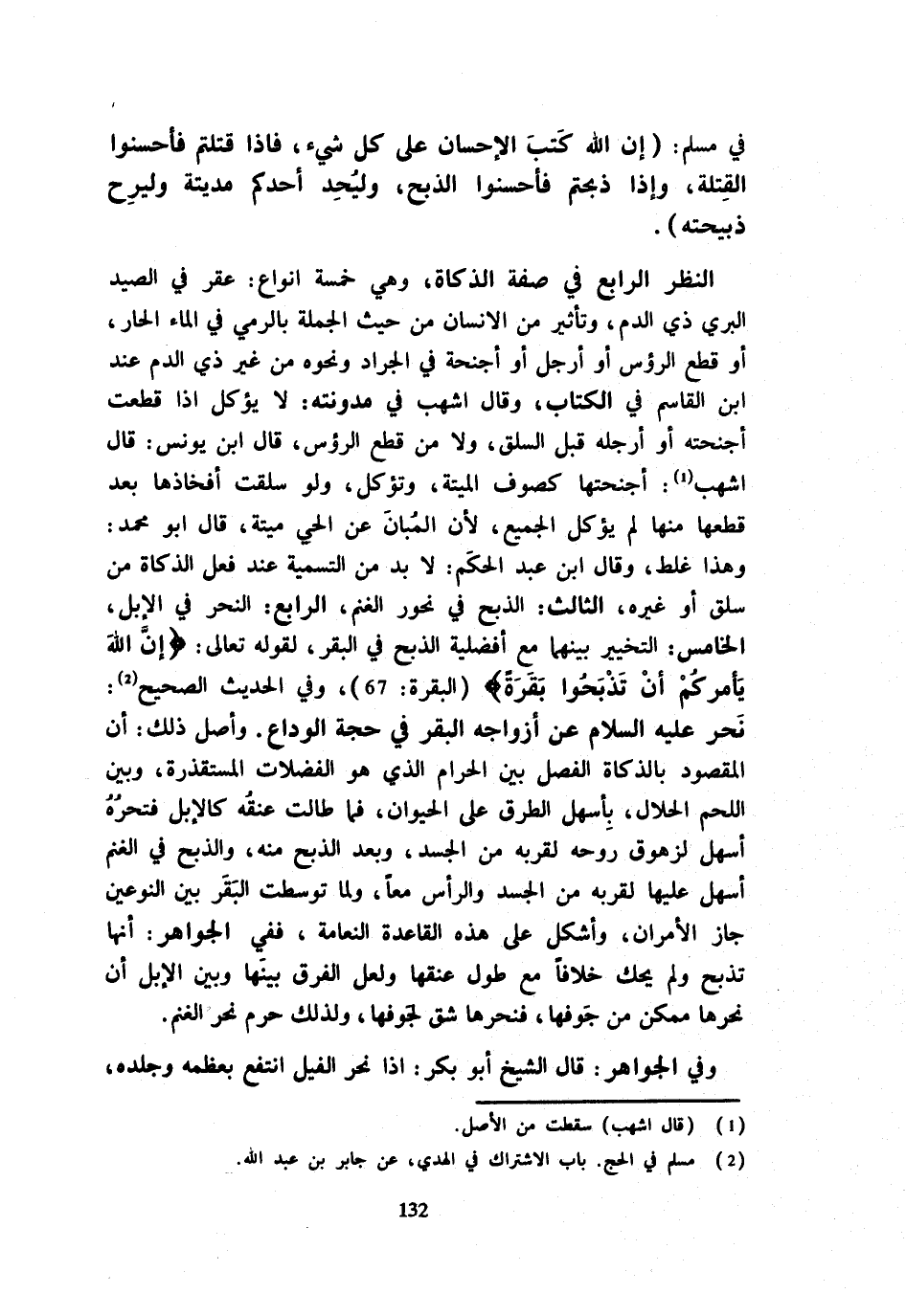 فِي مُسْلِمٍ إِنَّ اللَّهَ كَتَبَ الْإِحْسَانَ عَلَى كُلِّ شَيْءٍ فَإِذَا قَتَلْتُمْ فَأَحْسِنُوا الْقِتْلَةَ وَإِذَا ذَبَحْتُمْ فَأَحْسِنُوا الذِّبْحَ وَلْيُحِدَّ أَحَدُكُمْ مُدْيَتَهُ وَلْيُرِحْ ذَبِيحَته النّظر الرَّابِع فِي صفة الذَّكَاة وَهِيَ خَمْسَةُ أَنْوَاعٍ عَقْرٌ فِي الصَّيْدِ الْبَرِّيِّ ذِي الدَّمِ وَتَأْثِيرٌ مِنَ الْإِنْسَانِ مِنْ حَيْثُ الْجُمْلَةِ بِالرَّمْيِ فِي الْمَاءِ الْحَارِّ أَوْ قَطْعُ الرؤس أَو أرجل أَو أَجْنِحَة فِي الْجَرَادِ وَنَحْوِهِ مِنْ غَيْرِ ذِي الدَّمِ عِنْدَ ابْن الْقَاسِم فِي الْكتاب وَقَالَ أَشْهَبُ فِي مُدَوَّنَتِهِ لَا يُؤْكَلُ إِذَا قُطِعَتْ أَجْنِحَتُهُ أَوْ أَرْجُلُهُ قَبْلَ السَّلْقِ وَلَا من قطع الرؤس قَالَ ابْنُ يُونُسَ قَالَ أَشْهَبُ أَجْنِحَتُهَا كَصُوفِ الْمَيْتَةِ وَتُؤْكَلُ وَلَوْ سُلِقَتْ أَفْخَاذُهَا بَعْدَ قَطْعِهَا مِنْهَا لَمْ يُؤْكَلِ الْجَمِيعُ لِأَنَّ الْمُبَانَ عَنِ الْحَيِّ مَيْتَةٌ قَالَ أَبُو مُحَمَّدٍ وَهَذَا غَلَطٌ وَقَالَ ابْنُ عَبْدِ الْحَكَمِ لَا بُدَّ مِنَ التَّسْمِيَةِ عِنْدَ فِعْلِ الذَّكَاةِ مِنْ سَلْقٍ أَوْ غَيْرِهِ الثَّالِثُ الذَّبْحُ فِي نُحُورِ الْغَنَمِ الرَّابِعُ النَّحْرُ فِي الْإِبِلِ الْخَامِسُ التَّخْيِيرُ بَيْنَهُمَا مَعَ أَفْضَلِيَّةِ الذَّبْحِ فِي الْبَقَرِ لِقَوْلِهِ تَعَالَى {إِنَّ اللَّهَ يَأْمُرُكُمْ أَنْ تَذْبَحُوا بَقَرَةً} الْبَقَرَة 67 وَفِي الْحَدِيثِ الصَّحِيحِ نَحَرَ عَلَيْهِ السَّلَامُ عَنْ أَزْوَاجِهِ الْبَقَرَ فِي حَجَّةِ الْوَدَاعِ وَأَصْلُ ذَلِكَ أَنَّ الْمَقْصُودَ بِالذَّكَاةِ الْفَصْلُ بَيْنَ الْحَرَامِ الَّذِي هُوَ الْفَضَلَاتُ الْمُسْتَقْذَرَةُ وَبَيْنَ اللَّحْمِ الْحَلَالِ بِأَسْهَلِ الطُّرُقِ على الْحَيَوَان فَمَا طَالَتْ عُنُقه كَالْإِبِلِ فتحره أَسْهَلُ لِزُهُوقِ رُوحِهِ لِقُرْبِهِ مِنَ الْجَسَدِ وَبْعْدِ الذَّبْحِ مِنْهُ وَالذَّبْحُ فِي الْغَنَمِ أَسْهَلُ عَلَيْهَا لِقُرْبِهِ مِنَ الْجَسَدِ وَالرَّأْسِ مَعًا وَلَمَّا تَوَسَّطَتِ الْبَقَرُ بَيْنَ النَّوْعَيْنِ جَازَ الْأَمْرَانِ وَأُشْكِلَ عَلَى هَذِهِ الْقَاعِدَةِ النَّعَامَةُ فَفِي الْجَوَاهِرِ أَنَّهَا تُذْبَحُ وَلَمْ يَحْكِ خِلَافًا مَعَ طُولِ عُنُقِهَا وَلَعَلَّ الْفَرْقَ بَيْنَهَا وَبَيْنَ الْإِبِلِ أَنَّ نَحْرَهَا مُمْكِنٌ من جوفها فنحرها شقّ لجوفها وَلذَلِك حُرِّمَ نَحْرُ الْغَنَمِ وَفِي الْجَوَاهِرِ قَالَ الشَّيْخُ أَبُو بَكْرٍ إِذَا نُحِرَ الْفِيلُ انْتُفِعَ بِعَظْمِهِ وَجلده