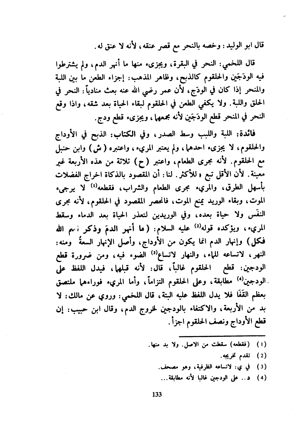 قَالَ أَبُو الْوَلِيدِ وَخَصَّهُ بِالنَّحْرِ مَعَ قِصَرِ عُنُقِهِ لِأَنَّهُ لَا عُنُقَ لَهُ قَالَ اللَّخْمِيُّ النَّحْرُ فِي الْبَقَرَةِ وَيُجْزِئُ مِنْهَا مَا أَنْهَرَ الدَّمَ وَلَمْ يَشْتَرِطُوا فِيهِ الْوَدَجَيْنِ وَالْحُلْقُومَ كَالذَّبْحِ وَظَاهِرُ الْمَذْهَبِ إِجْزَاءُ الطَّعْنِ مَا بَيْنَ اللَّبَّةِ وَالْمَنْحَرِ إِذَا كَانَ فِي الْوَدَجِ لِأَنَّ عُمَرَ رَضِيَ اللَّهُ عَنْهُ بَعَثَ مُنَادِيًا النَّحْرُ فِي الْحَلْقِ وَاللَّبَّةِ وَلَا يَكْفِي الطَّعْنُ فِي الْحُلْقُومِ لِبَقَاءِ الْحَيَاةِ بَعْدَ شَقِّهِ وَإِذَا وَقَعَ النَّحْرُ فِي الْمَنْحَرِ قَطَعَ الْوَدَجَيْنِ لِأَنَّهُ مَجْمَعُهُمَا وَيُجْزِئُ قَطْعُ وَدَجٍ فَائِدَةٌ اللَّبَّةُ وَاللَّبَبُ وَسَطُ الصَّدْرِ وَفِي الْكتاب الذّبْح فِي الْأَوْدَاج والحلقوم لَا يُجْزِئُ أَحَدُهُمَا وَلَمْ يَعْتَبِرِ الْمَرِّيءَ وَاعْتَبَرَهُ ش وَابْنُ حَنْبَلٍ مَعَ الْحُلْقُومِ لِأَنَّهُ مَجْرَى الطَّعَامِ وَاعْتَبَرَ ح ثَلَاثَةً مِنْ هَذِهِ الْأَرْبَعَةِ غَيْرَ مُعَيَّنَةٍ لِأَنَّ الْأَقَلَّ تَبَعٌ لِلْأَكْثَرِ لَنَا أَنَّ الْمَقْصُودَ بِالذَّكَاةِ إِخْرَاجُ الْفَضَلَاتِ بِأَسْهَلِ الطُّرُقِ وَالْمَرِّيءُ مَجْرَى الطَّعَامِ وَالشَّرَابِ فَقَطْعُهُ لَا يُرْجِئُ الْمَوْتَ وَبَقَاء الوريد مَجْرَى الطَّعَامِ وَالشَّرَابِ فَقَطْعُهُ لَا يُرْجِئُ الْمَوْتَ وَبَقَاءُ الْوَرِيدِ يَمْنَعُ الْمَوْتَ فَانْحَصَرَ الْمَقْصُودُ فِي الْحُلْقُومِ لِأَنَّهُ مَجْرَى النَّفَسِ وَلَا حَيَاةَ بَعْدَهُ وَفِي الوريدين بتعذر الْحَيَاةِ بَعْدَ الدِّمَاءِ وَسَقْطِ الْمَرِيءِ وَيُؤَكِّدُهُ قَوْلُهُ عَلَيْهِ السَّلَامُ مَا أَنْهَرَ الدَّمَ وَذُكِرَ اسْمُ اللَّهِ فَكُلْ وَإِنْهَارُ الدَّمِ إِنَّمَا يَكُونُ مِنَ الْأَوْدَاجِ وَأَصْلُ الْإِنْهَارِ السَّعَةُ وَمِنْهُ النَّهْرُ لِاتِّسَاعِهِ لِلْمَاءِ وَالنَّهَارُ لِاتِّسَاعِ الضَّوْءِ فِيهِ وَمِنْ ضَرُورَةِ قَطْعِ الْوَدَجَيْنِ قَطْعُ الْحُلْقُومِ غَالِبًا قَالَ لِأَنَّهُ قبلهمَا فَيدل اللَّفْظ على الودجين مُطَابقَة وعَلى الْحُلْقُوم التزاما وَأما المرئ فَوَرَاءَهُمَا مُلْتَصِقٌ بِعَظْمِ الْقَفَا فَلَا يَدُلُّ اللَّفْظُ عَلَيْهِ أَلْبَتَّةَ قَالَ اللَّخْمِيُّ وَرُوِيَ عَنْ مَالِكٍ لَا بُدَّ مِنَ الْأَرْبَعَةِ وَالِاكْتِفَاءُ بِالْوَدَجَيْنِ لِخُرُوجِ الدَّمِ وَقَالَ ابْنُ حَبِيبٍ إِنْ قَطَعَ الْأَوْدَاجَ وَنصف الْحُلْقُوم اجزأ