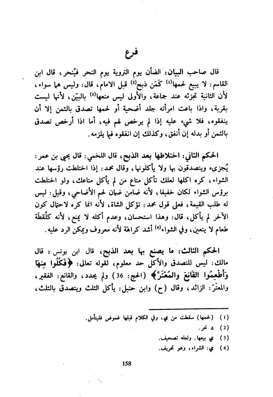 قَالَ صَاحب الْبَيَان الضَّأْن يَوْم التَّرويَة يَوْم النَّحْر فينحر قَالَ ابْنُ الْقَاسِمِ لَا يَبِيعُ لَحْمَهَا كَمَنْ ذَبَحَ قَبْلَ الْإِمَامِ قَالَ وَلَيْسَ هُمَا سَوَاءً لِأَنَّ الثَّانِيَةَ تُجْزِئُهُ عِنْدَ جَمَاعِةٍ وَالْأُولَى لَيْسَ مَنْعُهَا بِالْبَيِّنِ لِأَنَّهَا لَيْسَتْ بِقُرْبَةٍ وَإِذَا بَاعَتِ امْرَأَته جِلْدَ أُضْحِيَّةٍ أَوْ لَحْمَهَا تَصَدَّقَ بِالثَّمَنِ إِلَّا أَنْ يُنْفِقُوهُ فَلَا شَيْءَ عَلَيْهِ إِذَا لَمْ يُرَخِّصْ لَهُمْ فِيهِ أَمَّا إِذَا أَرْخَصَ تَصَدَّقَ بِالثّمن أَو بدله إِن أنْفق وَكَذَلِكَ إِنْ أَنْفَقُوهُ فِيمَا يَلْزَمُهُ الْحُكْمُ الثَّانِي اخْتِلَاطُهَا بَعْدَ الذَّبْحِ قَالَ اللَّخْمِيُّ قَالَ يَحْيَى بْنُ عُمَرَ يُجْزِئُ وَيَتَصَدَّقُونَ بِهَا وَلَا يَأْكُلُونَهَا وَقَالَ مُحَمَّد إِذا اخْتلطت رؤسها عِنْدَ الشِّوَاءِ كُرِهَ أَكْلُهَا لَعَلَّكَ تَأْكُلُ مَتَاعَ من لم يَأْكُل متاعك وَلَو اخْتلطت برؤس الشِّوَاءِ لَكَانَ خَفِيفًا لِأَنَّهُ ضَامِنٌ ضَمَانَ لَحْمِ الْأَضَاحِيِّ وَقِيلَ لَيْسَ لَهُ طَلَبُ الْقِيمَةِ فَعَلَى قَوْلِ مُحَمَّدٍ تُؤْكَلُ الشَّاةُ لِأَنَّهُ إِنَّمَا كُرِهَ لاحْتِمَال كَون لاخر لَمْ يَأْكُلْ قَالَ وَهَذَا اسْتِحْسَانٌ وَعَدَمُ أَكْلِهِ لَا يَمْنَعُ لِأَنَّهُ كَلُقَطَةِ طَعَامٍ لَا يَتَعَيَّنُ وَفِي الشِّوَاءِ أَشَدُّ كَرَاهَةً لِأَنَّهُ مَعْرُوفٌ وَيُمْكِنُ الرَّدُّ عَلَيْهِ الْحُكْمُ الثَّالِثُ مَا يُصْنَعُ بِهَا بَعْدَ الذَّبْحِ قَالَ ابْنُ يُونُسَ قَالَ مَالِكٌ لَيْسَ لِلتَّصَدُّقِ وَالْأَكْلِ حَدٌّ مَعْلُومٌ لِقَوْلِهِ تَعَالَى {فَكُلُوا مِنْهَا وَأَطْعِمُوا الْقَانِعَ وَالْمُعْتَرَّ} الْحَج 36 وَلَمْ يُحَدِّدْ وَالْقَانِعُ الْفَقِيرُ وَالْمُعْتَرُّ الزَّائِدُ وَقَالَ ح وَابْنُ حَنْبَلٍ يَأْكُلُ الثُّلُثَ وَيَتَصَدَّقُ بِالثُّلُثِ
