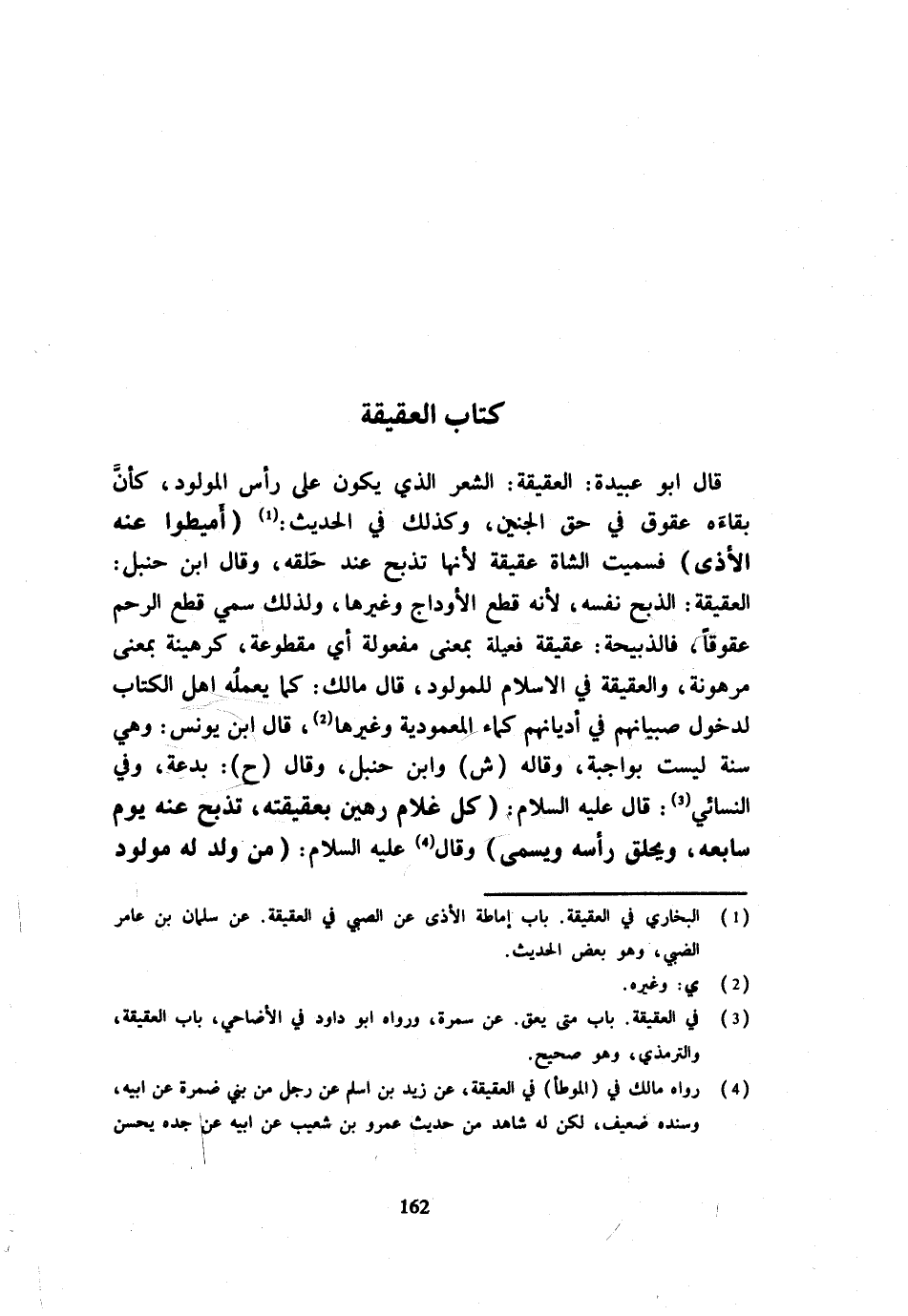قَالَ أَبُو عُبَيْدَةَ الْعَقِيقَةُ الشَّعَرُ الَّذِي يَكُونُ عَلَى رَأْسِ الْمَوْلُودِ كَأَنَّ بَقَاءَهُ عُقُوقٌ فِي حَقِّ الْجَنِينِ وَكَذَلِكَ فِي الْحَدِيثِ أَمِيطُوا عَنْهُ الْأَذَى فَسُمِّيَتِ الشَّاةُ عَقِيقَةً لِأَنَّهَا تُذْبَحُ عِنْدَ حَلْقِهِ وَقَالَ ابْنُ حَنْبَلٍ الْعَقِيقَةُ الذَّبْحُ نَفْسُهُ لِأَنَّهُ قَطْعُ الْأَوْدَاجِ وَغَيْرِهَا وَلِذَلِكَ سُمِّيَ قَطْعُ الرَّحِم عقوقا فالذبيحة عقيقة فَعَلَيهِ بِمَعْنَى مَفْعُولَةٍ أَيْ مَقْطُوعَةٍ كَرَهِينَةٍ بِمَعْنَى مَرْهُونَةٍ وَالْعَقِيقَةُ فِي الْإِسْلَامِ لِلْمَوْلُودِ قَالَ مَالِكٌ كَمَا يَعْمَلُهُ أَهْلُ الْكِتَابِ لِدُخُولِ صِبْيَانِهِمْ فِي أَدْيَانِهِمْ كَمَاءِ الْمَعْمُودِيَّةِ وَغَيْرِهَا قَالَ ابْنُ يُونُسَ وَهِيَ سُنَّةٌ لَيْسَتْ بِوَاجِبَةٍ وَقَالَهُ ش وَابْنُ حَنْبَلٍ وَقَالَ ح بِدْعَةٌ وَفِي النَّسَائِيِّ قَالَ عَلَيْهِ السَّلَامُ كُلُّ غُلَامٍ رَهِينٌ بِعَقِيقَتِهِ تُذْبَحُ عَنْهُ يَوْمَ سَابِعِهِ وَيُحْلَقُ رَأْسُهُ وَيُسَمَّى وَقَالَ عَلَيْهِ السَّلَامُ مِنْ وُلِدَ لَهُ مَوْلُودٌ
