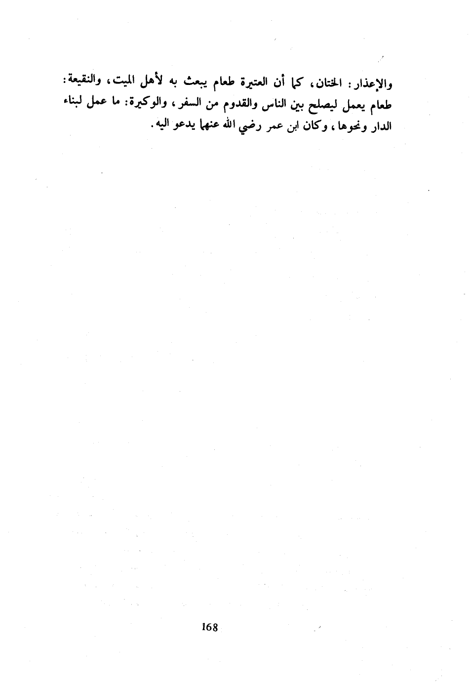 وَالْإِعْذَارُ الْخِتَانُ كَمَا أَنَّ الْعَتِيرَةَ طَعَامٌ يُبْعَثُ بِهِ لأهل الْمَيِّت والنقيعة طَعَام يعْمل ليصلح بَيْنَ النَّاسِ وَالْقُدُومِ مِنَ السَّفَرِ وَالْوَكِيرَةَ مَا عُمِلَ لِبِنَاءِ الدَّارِ وَنَحْوِهَا وَكَانَ ابْنُ عُمَرَ رَضِيَ اللَّهُ عَنْهُمَا يَدْعُو إِلَيْهِ
