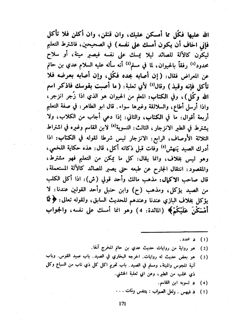 اللَّهِ عَلَيْهَا فَكُلْ مِمَّا أَمْسَكْنَ عَلَيْكَ وَإِنْ قَتَلْنَ وَإِنْ أَكَلْنَ فَلَا تَأْكُلْ فَإِنِّي أَخَافُ أَنْ يَكُونَ أَمْسَكَ عَلَى نَفْسِهِ فِي الصَّحِيحَيْنِ فَاشْترط التَّعْلِيم ليَكُون كالآلة للصائد لَيْلًا يُمْسِكَ عَلَى نَفْسِهِ فَيَصِيرَ مَيْتَةً أَوْ سِلَاحٌ مَحْدُود رِفْقًا بِالْحَيَوَانِ لِمَا فِي مُسْلِمٍ أَنَّهُ سَأَلَهُ عَلَيْهِ السَّلَامُ عَدِيُّ بْنُ حَاتِمٍ عَنِ الْمِعْرَاضِ فَقَالَ إِنْ أَصَابَهُ بِحَدِّهِ فَكُلْ وَإِنْ أَصَابَهُ بِعَرْضِهِ فَلَا تَأْكُلْ فَإِنَّهُ وَقِيذٌ وَقَالَ لِأَبِي ثَعْلَبَةَ مَا أَصَبْتَ بِقَوْسِكَ فَاذْكُرِ اسْمَ اللَّهِ وَكُلْ وَفِي الْكِتَابِ الْمُعَلَّمُ مِنَ الْحَيَوَانِ هُوَ الَّذِي إِذَا زُجِرَ انْزَجَرَ وَإِذَا أُرْسِلَ أَطَاعَ وَالسَّلَالِقَةُ وَغَيْرُهَا سَوَاءٌ قَالَ أَبُو الطَّاهِرِ فِي صِفَةِ التَّعْلِيمِ أَرْبَعَةُ أَقْوَالٍ مَا فِي الْكِتَابِ وَالثَّانِي إِذَا دُعِيَ أَجَابَ مِنَ الْكِلَابِ وَلَا يُشْتَرَطُ فِي الطَّيْرِ الِانْزِجَارُ الثَّالِثُ التَّسْوِيَةُ لِابْنِ الْقَاسِمِ وَغَيْرِهِ فِي اشْتِرَاطِ الثَّلَاثَةِ الْأَوْصَافِ الرَّابِعُ الِانْزِجَارُ لَيْسَ شَرْطًا لِقَوْلِهِ فِي الْكِتَابِ إِذَا أَدْرَكَ الصَّيْدَ يَنْهَشُ وَفَاتَ قَبْلَ ذَكَاتِهِ أَكَلَ قَالَ هَذِهِ حِكَايَةُ اللَّخْمِيِّ وَهُوَ لَيْسَ بِخِلَافٍ وَإِنَّمَا يُقَال كَا مَا يُمْكِنُ مِنَ التَّعْلِيمِ فَهُوَ مُشْتَرَطٌ وَالْمَقْصُودُ انْتِقَالُ الْجَارِحِ عَنْ طَبْعِهِ حَتَّى يَصِيرَ لِلصَّائِدِ كَالْآلَةِ الْمُسْتَعْمَلَةِ قَالَ صَاحِبُ الْإِكْمَالِ مَذْهَبُ مَالِكٍ وَأَحَدُ قَوْلَيْ ش إِذَا أَكَلَ الْكَلْبُ مِنَ الصَّيْدِ يُؤْكَلُ وَمَذْهَبُ ح وَابْنِ حَنْبَلٍ وَأَحَدُ الْقَوْلَيْنِ عِنْدَنَا لَا يُؤْكَلُ بِخِلَافِ الْبَازِيِّ عِنْدَنَا وَعِنْدَهُمْ لِلْحَدِيثِ السَّابِقِ وَلِقَوْلِهِ تَعَالَى {مِمَّا أَمْسَكْنَ عَلَيْكُمْ} الْمَائِدَة 4 وَهُوَ إِنَّمَا أَمْسَكَ عَلَى نَفْسِهِ وَالْجَوَاب
