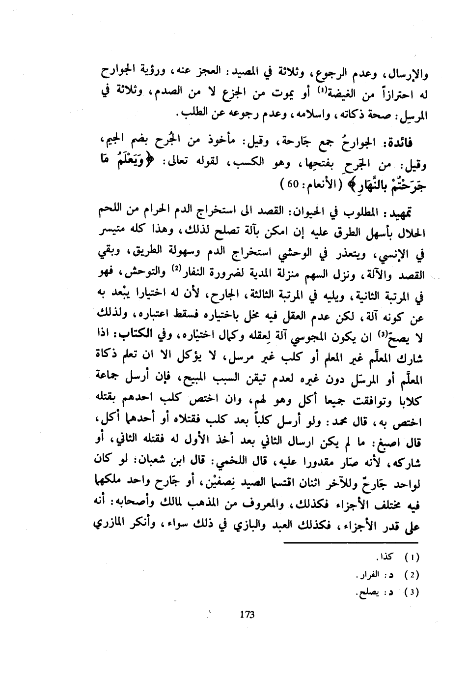 وَالْإِرْسَالُ وَعَدَمُ الرُّجُوعِ وَثَلَاثَةٍ فِي الْمَصِيدِ الْعَجْزُ عَنهُ ورؤية الْجَوَارِح لَهُ احْتِرَازًا من الغيضة أَو يَمُوت من الْجزع لَا من الصدوم وَثَلَاثَةٍ فِي الْمُرْسِلِ صِحَّةُ ذَكَاتِهِ وَإِسْلَامُهُ وَعَدَمُ رُجُوعِهِ عَنِ الطَّلَبِ فَائِدَةٌ الْجَوَارِحُ جَمْعُ جَارِحَةٍ وَقِيلَ مَأْخُوذٌ مِنَ الْجُرْحِ بِضَمِّ الْجِيمِ وَقِيلَ مِنَ الْجَرْحِ بِفَتْحِهَا وَهُوَ الْكَسْبُ لِقَوْلِهِ تَعَالَى {وَيَعْلَمُ مَا جَرَحْتُمْ بِالنَّهَارِ} الْأَنْعَام 60 تَمْهِيدٌ الْمَطْلُوبُ فِي الْحَيَوَانِ الْقَصْدُ إِلَى اسْتِخْرَاجِ الدَّمِ الْحَرَامِ من اللَّحْم الْحَلَال بأسهل الطّرق عَلَيْهِ إِن أَمْكَنَ بِآلَةٍ تَصْلُحُ لِذَلِكَ وَهَذَا كُلُّهُ مُتَيَسِّرٌ فِي الْإِنْسِي ويتعذر فِي الْوَحْشِيِّ اسْتِخْرَاجُ الدَّمِ وَسُهُولَةُ الطَّرِيقِ وَبَقِيَ الْقَصْدُ وَالْآلَةُ وَنُزِّلَ السَّهْمُ مَنْزِلَةَ الْمُدْيَةِ لِضَرُورَةِ النِّفَارِ وَالتَّوَحُّشِ فَهُوَ فِي الْمَرْتَبَةِ الثَّانِيَةِ وَيَلِيهِ فِي الْمَرْتَبَةِ الثَّالِثَةِ الْجَارِحُ لِأَنَّ لَهُ اخْتِيَارًا يبعد بِهِ عَن كَوْنه آلَةً لَكِنَّ عَدَمَ الْعَقْلِ فِيهِ مُخِلٌّ بِاخْتِيَارِهِ فَسقط اعْتِبَاره وَلذَلِك لَا يَصح أَنْ يَكُونَ الْمَجُوسِيُّ آلَةً لِعَقْلِهِ وَكَمَالِ اخْتِيَارِهِ وَفِي الْكِتَابِ إِذَا شَارَكَ الْمُعَلَّمَ غَيْرُ الْمُعَلَّمِ أَوْ كَلْبٌ غَيْرُ مُرْسَلٍ لَا يُؤْكَلُ إِلَّا أَنْ تُعْلَمَ ذَكَاةُ الْمُعَلَّمِ أَوِ الْمُرْسَلِ دُونَ غَيْرِهِ لِعَدَمِ تَيَقُّنِ السَّبَبِ الْمُبِيحِ فَإِنْ أَرْسَلَ جَمَاعَةٌ كِلَابًا وَتَوَافَقَتْ جَمِيعًا أُكِلَ وَهُوَ لَهُمْ وَإِنِ اخْتُصَّ كَلْبُ أَحَدِهِمْ بِقَتْلِهِ اخْتُصَّ بِهِ قَالَ مُحَمَّدٌ وَلَوْ أَرْسَلَ كَلْبًا بَعْدَ كَلْبٍ فَقَتَلَاهُ أَوْ أَحَدُهُمَا أُكِلَ قَالَ أَصْبَغُ مَا لَمْ يَكُنْ إِرْسَالُ الثَّانِي بَعْدَ أَخْذِ الْأَوَّلِ لَهُ فَقَتَلَهُ الثَّانِي أَوْ شَارَكَهُ لِأَنَّهُ صَارَ مَقْدُورًا عَلَيْهِ قَالَ اللَّخْمِيُّ قَالَ ابْنُ شَعْبَانَ لَو كَانَ لوَاحِد جارح وَللْآخر اثْنَان افتسما الصَّيْدَ نِصْفَيْنِ أَوْ جَارِحٌ وَاحِدٌ مِلْكُهُمَا فِيهِ مُخْتَلِفُ الْأَجْزَاءِ فَكَذَلِكَ وَالْمَعْرُوفُ مِنَ الْمَذْهَبِ لِمَالِكٍ وَأَصْحَابِهِ أَنَّهُ عَلَى قَدْرِ الْأَجْزَاءِ فَكَذَلِكَ الْعَبْدُ وَالْبَازِيُّ فِي ذَلِكَ سَوَاءٌ وَأَنْكَرَ الْمَازِرِيُّ