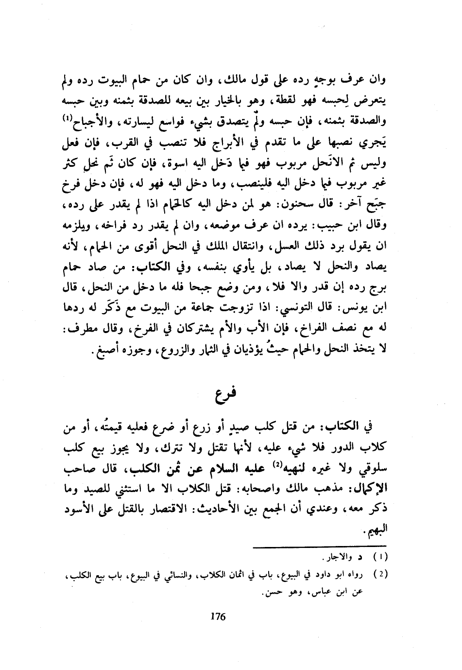 فِي الْكِتَابِ مِنْ قَتَلَ كَلْبَ صَيْدٍ أَوْ زَرْعٍ أَوْ ضَرْعٍ فَعَلَيْهِ قِيمَتُهُ أَوْ مِنْ كِلَابِ الدُّورِ فَلَا شَيْءَ عَلَيْهِ لِأَنَّهَا تُقْتَلُ وَلَا تُتْرَكُ وَلَا يَجُوزُ بَيْعُ كَلْبٍ سُوقِيٍّ وَلَا غَيْرِهِ لِنَهْيِهِ عَلَيْهِ السَّلَامُ عَنْ ثَمَنِ الْكَلْبِ قَالَ صَاحِبُ الْإِكْمَالِ مَذْهَبُ مَالِكٍ وَأَصْحَابِهِ قَتْلُ الْكِلَابِ إِلَّا مَا اسْتُثْنِيَ لِلصَّيْدِ وَمَا ذُكِرَ مَعَهُ وَعِنْدِي أَنَّ الْجَمْعَ بَين الْأَحَادِيث الِاقْتِصَار بالفتل عَلَى الْأَسْوَدِ الْبَهِيمِ