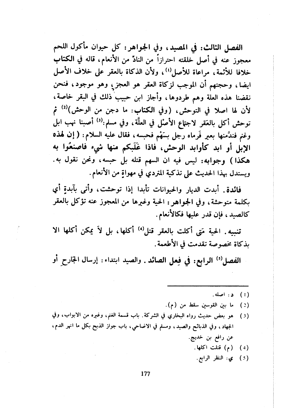 الْفَصْل الثَّالِث فِي المصيد وَفِي الْجَوَاهِرِ كُلُّ حَيَوَانٍ مَأْكُولِ اللَّحْمِ مَعْجُوزٍ عَنْهُ فِي أَصْلِ خِلْقَتِهِ احْتِرَازًا مِنَ النَّادِّ مِنَ الْأَنْعَامِ قَالَهُ فِي الْكِتَابِ خِلَافًا لِلْأَئِمَّةِ مُرَاعَاةً لِلْأَصْلِ وَلِأَنَّ الذَّكَاةَ بِالْعَقْرِ عَلَى خِلَافِ الأَصْل أَيْضا وحجتهم أَن الْمُوجب لزكاة الْعقر هُوَ الْعَجز وَهُوَ مَوْجُود فَنحْن نقصنا هَذِهِ الْعِلَّةَ وَهُمْ طَرَدُوهَا وَأَجَازَ ابْنُ حَبِيبٍ ذَلِكَ فِي الْبَقَرِ خَاصَّةً لِأَنَّ لَهَا أَصْلًا فِي التَّوَحُّشِ وَفِي الْكِتَابِ مَا دَجَنَ مِنَ الْوَحْش ثمَّ تَوَّحَشَ أُكِلَ بِالْعَقْرِ لِاجْتِمَاعِ الْأَصْلِ فِي الْعِلَّةِ وَفِي مُسلم أصبْنَا نهب إبل وغنم فندمنها بِغَيْر فَرَمَاهُ رَجُلٌ بِسَهْمٍ فَحَبَسَهُ فَقَالَ عَلَيْهِ السَّلَامُ إِن لهَذِهِ الْإِبِل أَو ابد كَأَوَابِدِ الْوَحْشِ فَإِذَا غَلَبَكُمْ مِنْهَا شَيْءٌ فَاصْنَعُوا بِهِ هَكَذَا وَجَوَابُهُ لَيْسَ فِيهِ أَنَّ السَّهْمَ قَتَلَهُ بَلْ حَبَسَهُ وَنَحْنُ نَقُولُ بِهِ وَيُسْتَدَلُّ بِهَذَا الْحَدِيثِ عَلَى تَذْكِيَةِ الْمُتَرَدِّي فِي مَهْوَاةٍ مِنَ الْأَنْعَامِ فَائِدَةٌ أَبَدَتِ الدِّيَارُ وَالْحَيَوَانَاتُ تَأَبُّدًا إِذَا تَوَحَّشَتْ وَأَتَى بِآبِدَةٍ أَيْ بِكَلِمَةٍ مُتَوَحِّشَةٍ وَفِي الْجَوَاهِرِ الْحَيَّةُ وَغَيْرُهَا مِنَ الْمَعْجُوزِ عَنْهُ تُؤْكَلُ بِالْعَقْرِ كَالصَّيْدِ فَإِنْ قُدِرَ عَلَيْهَا فَكَالْأَنْعَامِ تَنْبِيه الْحَيَّة مَتى أكلت بالعقر قتل آكلهَا بَلْ لَا يُمْكِنُ أَكْلُهَا إِلَّا بِذَكَاةٍ مَخْصُوصَةٍ تَقَدَّمَتْ فِي الْأَطْعِمَةِ الْفَصْلُ الرَّابِعُ فِي فعل الصَّائِد وَالصَّيْدُ ابْتِدَاءً إِرْسَالُ الْجَارِحِ أَوِ