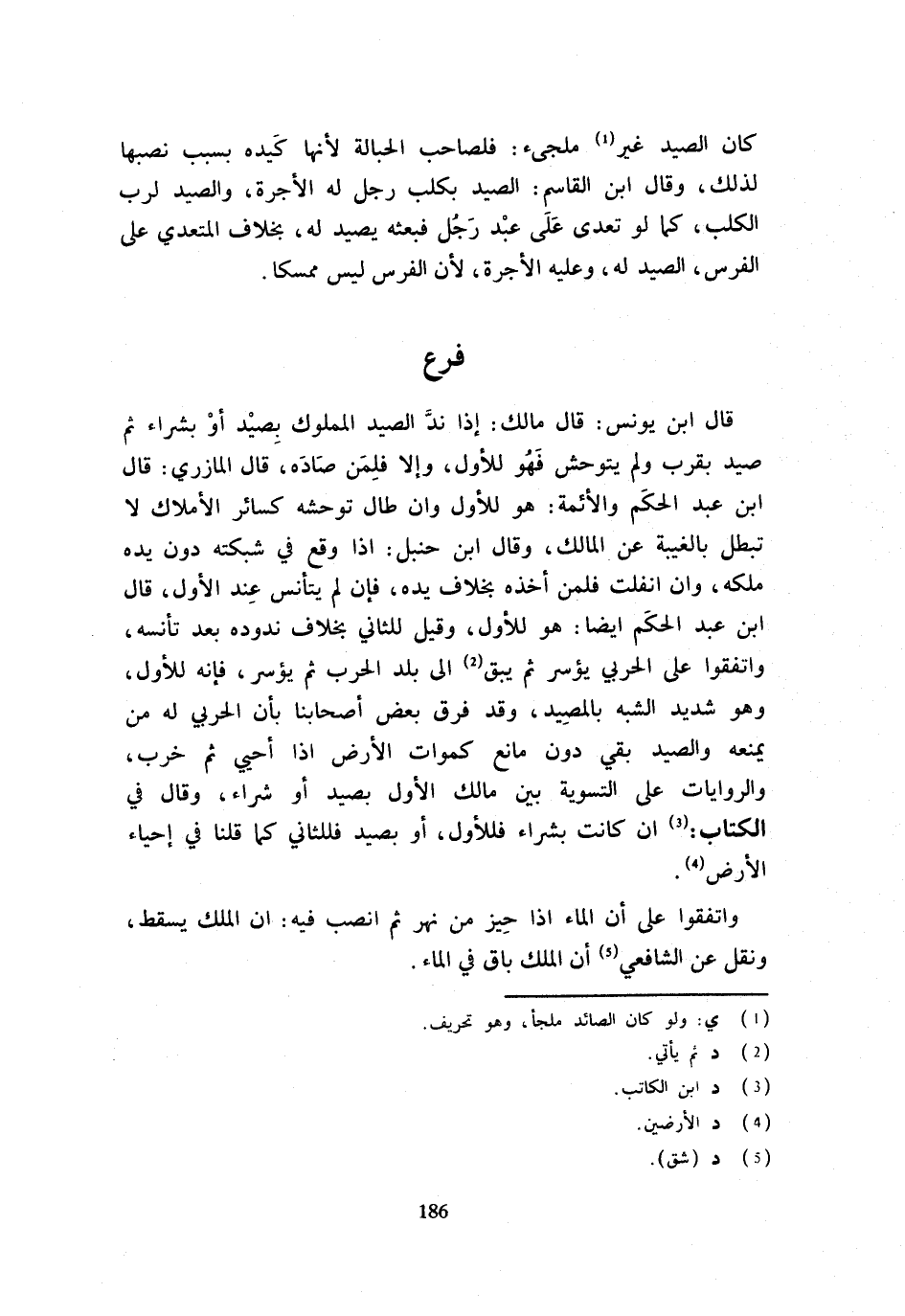 قَالَ ابْنُ يُونُسَ قَالَ مَالِكٌ إِذَا نَدَّ الصَّيْدُ الْمَمْلُوكُ بِصَيْدٍ أَوْ بِشِرَاءٍ ثُمَّ صِيدَ بِقُرْبٍ وَلَمْ يَتَوَحَّشْ فَهُوَ لِلْأَوَّلِ وَإِلَّا فَلِمَنْ صَادَهُ قَالَ الْمَازِرِيُّ قَالَ ابْنُ عَبْدِ الْحَكَمِ وَالْأَئِمَّةُ هُوَ لِلْأَوَّلِ وَإِنْ طَالَ تَوَحُّشُهُ كَسَائِرِ الْأَمْلَاكِ لَا تَبْطُلُ بِالْغَيْبَةِ عَنِ الْمَالِكِ وَقَالَ ابْنُ حَنْبَلٍ إِذَا وَقَعَ فِي شَبَكَتِهِ دُونَ يَدِهِ مَلَكَهُ وَإِنِ انْفَلَتَ فَلِمَنْ أَخَذَهُ بِخِلَافِ يَدِهِ فَإِنْ لَمْ يَتَأَنَّسْ عِنْدَ الأول قَالَ ابْن عَبْدِ الْحَكَمِ أَيْضًا هُوَ لِلْأَوَّلِ وَقِيلَ لِلثَّانِي بِخِلَافِ نُدُودِهِ بَعْدَ تَأَنُّسِهِ وَاتَّفَقُوا عَلَى الْحَرْبِيِّ يُؤْسَرُ ثُمَّ يُبْقَ إِلَى بَلَدِ الْحَرْبَ ثُمَّ يُؤْسَرُ فَإِنَّهُ لِلْأَوَّلِ وَهُوَ شَدِيدُ الشَّبَهِ بِالْمَصِيدِ وَقَدْ فَرَّقَ بَعْضُ أَصْحَابِنَا بِأَنَّ الْحَرْبِيَّ لَهُ مَنْ يَمْنَعُهُ وَالصَّيْدُ بَقِيَ دُونَ مَانِعٍ كَمَوَاتِ الْأَرْضِ إِذَا أُحْيِيَ ثُمَّ خُرِّبَ وَالرِّوَايَاتُ عَلَى التَّسْوِيَة بَين مَالك الْأَوَّلِ بِصَيْدٍ أَوْ شِرَاءٍ وَقَالَ فِي الْكِتَابِ إِنْ كَانَتْ بِشِرَاءٍ فَلِلْأَوَّلِ أَوْ بِصَيْدٍ فَلِلثَّانِي كَمَا قُلْنَا فِي إِحْيَاءِ الْأَرْضِ وَاتَّفَقُوا عَلَى أَنَّ الْمَاءَ إِذَا حِيزَ مِنْ نَهْرٍ ثُمَّ انصب فِيهِ إِن الْملك يسْقط وَنقل عَن الشَّافِعِيِّ أَنَّ الْمِلْكَ بَاقٍ فِي الْمَاءِ