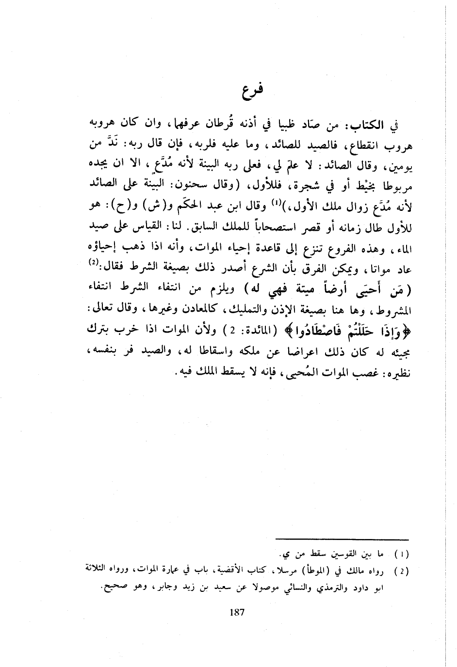 فِي الْكِتَابِ مَنْ صَادَ ظَبْيًا فِي أُذُنه قرطان عرفهما وَإِن كَانَ هُرُوبُهُ هُرُوبَ انْقِطَاعٍ فَالصَّيْدُ لِلصَّائِدِ وَمَا عَلَيْهِ فَلِرَبِّهِ فَإِنْ قَالَ رَبُّهُ نَدَّ مِنْ يَوْمَيْنِ وَقَالَ الصَّائِدُ لَا عِلْمَ لِي فعلى ربه البنية لِأَنَّهُ مُدَّعٍ إِلَّا أَنْ يَجِدَهُ مَرْبُوطًا بِخَيْطٍ أَوْ فِي شَجَرَةٍ فَلِلْأَوَّلِ وَقَالَ سَحْنُونٌ الْبَيِّنَةُ على الصَّائِد أَنه مُدع زَوَال مِلْكِ الْأَوَّلِ وَقَالَ ابْنُ عَبْدِ الْحَكَمِ وَش وح هُوَ لِلْأَوَّلِ طَالَ زَمَانُهُ أَوْ قَصُرَ اسْتِصْحَابًا لِلْمِلْكِ السَّابِقِ لَنَا الْقِيَاسُ عَلَى صَيْدِ الْمَاءِ وَهَذِهِ الْفُرُوعُ تَنْزِعُ إِلَى قَاعِدَةِ إِحْيَاءِ الْمَوَاتِ وَأَنَّهُ إِذَا ذَهَبَ إِحْيَاؤُهُ عَادَ مَوَاتًا وَيُمْكِنُ الْفَرْقُ بِأَنَّ الشَّرْعَ أَصْدَرَ ذَلِكَ بِصِيغَةِ الشَّرْطِ فَقَالَ من أحيى أَرْضًا مَيْتَةً فَهِيَ لَهُ وَيَلْزَمُ مِنِ انْتِفَاءِ الشَّرْط انْتِفَاء الْمَشْرُوط وَهَا هُنَا بِصِيغَةِ الْإِذْنِ وَالتَّمْلِيكِ كَالْمَعَادِنِ وَغَيْرِهَا وَقَالَ تَعَالَى {وَإِذَا حَلَلْتُمْ فَاصْطَادُوا الْمَائِدَة 2 وَلِأَنَّ الْمَوَاتَ إِذَا خرب بترك مَجِيئه لَهُ كَانَ ذَلِكَ إِعْرَاضًا عَنْ مِلْكِهِ وَإِسْقَاطًا لَهُ وَالصَّيْدُ فَرَّ بِنَفْسِهِ نَظِيرُهُ غَصْبُ الْمَوَاتِ المحيى فَإِنَّهُ لَا يُسْقِطُ الْمِلْكَ فِيهِ