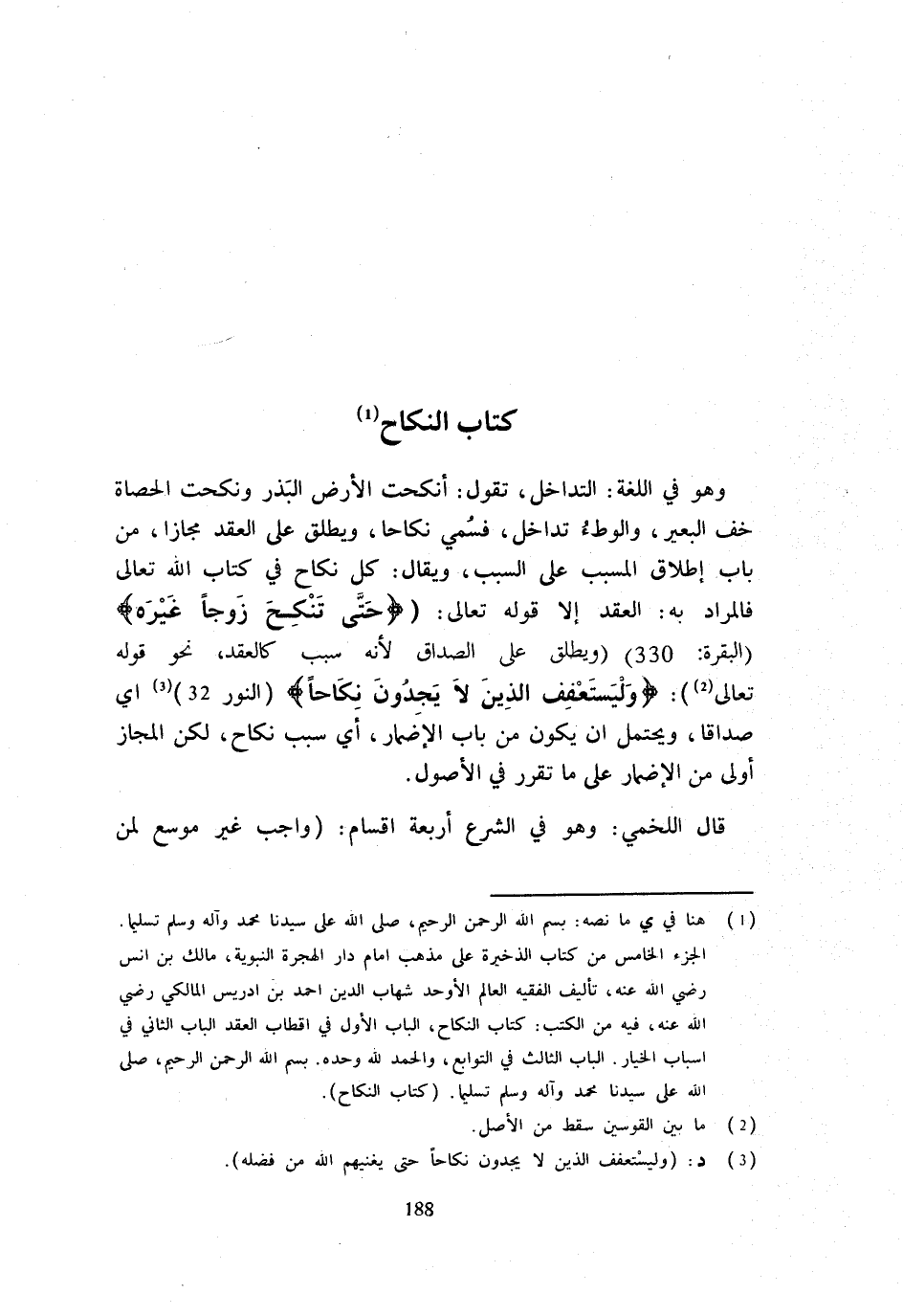 وَهُوَ فِي اللُّغَةِ التَّدَاخُلُ تَقُولُ أنكحت الأَرْض الْبذر وَنكَحَتِ الْحَصَاةُ خُفَّ الْبَعِيرِ وَالْوَطْءُ تَدَاخُلٌ فَسُمِّيَ نِكَاحًا وَيُطْلَقُ عَلَى الْعَقْدِ مَجَازًا مِنْ بَابِ إِطْلَاقِ الْمُسَبَّبِ عَلَى السَّبَبِ وَيُقَالُ كُلُّ نِكَاحٍ فِي كِتَابِ اللَّهِ تَعَالَى فَالْمُرَادُ بِهِ الْعَقْدُ إِلَّا قَوْله تَعَالَى {حَتَّى تَنْكِحَ زَوْجًا غَيْرَهُ} الْبَقَرَة 330 وَيُطْلَقُ عَلَى الصَّدَاقِ لِأَنَّهُ سَبَبٌ كَالْعَقْدِ نَحْوَ قَوْله تَعَالَى {وَلْيَسْتَعْفِفِ الَّذِينَ لَا يَجِدُونَ نِكَاحًا} النُّور 32 أَيْ صَدَاقًا وَيُحْتَمَلُ أَنْ يَكُونَ مِنْ بَابِ الْإِضْمَارِ أَيْ سَبَبَ نِكَاحٍ لَكِنَّ الْمَجَازَ أَوْلَى مِنَ الْإِضْمَارِ عَلَى مَا تَقَرَّرَ فِي الْأُصُولِ قَالَ اللَّخْمِيُّ وَهُوَ فِي الشَّرْعِ أَرْبَعَةُ أَقْسَامٍ وَاجِبٌ غَيْرُ مُوَسَّعٍ لِمَنْ