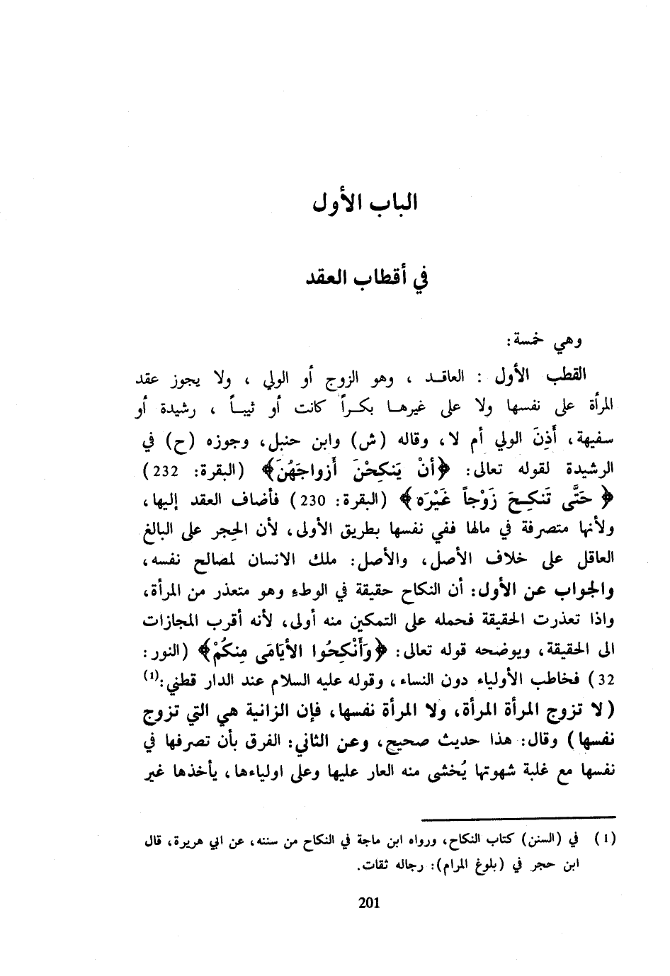 وَهِيَ خَمْسَةٌ الْقُطْبُ الْأَوَّلُ الْعَاقِدُ وَهُوَ الزَّوْجُ أَوِ الْوَلِيُّ وَلَا يَجُوزُ عَقْدُ الْمَرْأَةِ عَلَى نَفْسِهَا وَلَا عَلَى غَيْرِهَا بِكْرًا كَانَتْ أَوْ ثَيِّبًا رَشِيدَةً أَوْ سَفِيهَةً أَذِنَ الْوَلِيُّ أَمْ لَا وَقَالَهُ ش وَابْنُ حَنْبَلٍ وَجَوَّزَهُ ح فِي الرَّشِيدَةِ لقَوْله تَعَالَى {أَن ينكحن أَزوَاجهنَّ} الْبَقَرَة 232 {حَتَّى تَنْكِحَ زَوْجًا غَيْرَهُ} الْبَقَرَة 230 فَأَضَافَ الْعَقْدَ إِلَيْهَا وَلِأَنَّهَا مُتَصَرِّفَةٌ فِي مَالِهَا فَفِي نَفْسِهَا بِطَرِيقِ الْأَوْلَى لِأَنَّ الْحَجْرَ عَلَى الْبَالِغِ الْعَاقِلِ عَلَى خِلَافِ الْأَصْلِ وَالْأَصْلُ مِلْكُ الْإِنْسَانِ لِمَصَالِحِ نَفْسِهِ وَالْجَوَابُ عَنِ الْأَوَّلِ أَنَّ النِّكَاحَ حَقِيقَةٌ فِي الْوَطْءِ وَهُوَ مُتَعَذِّرٌ مِنَ الْمَرْأَةِ وَإِذَا تَعَذَّرَتِ الْحَقِيقَةُ فَحَمْلُهُ عَلَى التَّمْكِينِ مِنْهُ أَوْلَى لِأَنَّهُ أَقْرَبُ الْمَجَازَاتِ إِلَى الْحَقِيقَةِ وَيُوَضِّحُهُ قَوْله تَعَالَى {وَأَنْكِحُوا الأَيَامَى مِنْكُمْ} النُّور 32 فَخَاطَبَ الْأَوْلِيَاءَ دُونَ النِّسَاءِ وَقَوْلُهُ عَلَيْهِ السَّلَامُ عِنْدَ الدَّارَقُطْنِيِّ لَا تُزَوِّجُ الْمَرْأَةُ الْمَرْأَةَ وَلَا الْمَرْأَةُ نَفْسَهَا فَإِنَّ الزَّانِيَةَ هِيَ الَّتِي تُزَوِّجُ نَفْسَهَا وَقَالَ هَذَا حَدِيثٌ صَحِيحٌ وَعَنِ الثَّانِي الْفَرْقُ بِأَنَّ تَصَرُّفَهَا فِي نَفْسِهَا مَعَ غَلَبَةِ شَهْوَتِهَا يُخْشَى مِنْهُ الْعَار عَلَيْهَا وعَلى أولياءها يَأْخُذهَا غير