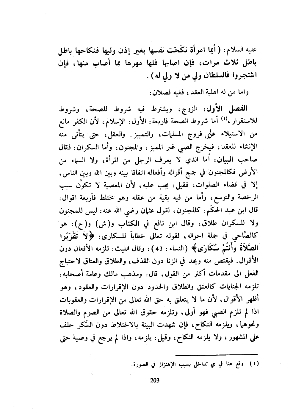وَأَمَّا مَنْ لَهُ أَهْلِيَّةُ الْعَقْدِ فَفِيهِ فَصْلَانِ الْفَصْلُ الْأَوَّلُ الزَّوْجُ وَيُشْتَرَطُ فِيهِ شُرُوطٌ لِلصِّحَّةِ وَشُرُوطٌ لِلِاسْتِقْرَارِ أَمَّا شُرُوطُ الصِّحَّةِ فَأَرْبَعَةٌ الْأَوَّلُ الْإِسْلَامُ لِأَنَّ الْكُفْرَ مَانِعٌ مِنَ الِاسْتِيلَاءِ عَنْ فُرُوجِ الْمُسْلِمَاتِ وَالتَّمْيِيزُ وَالْعَقْلُ حَتَّى يَتَأَتَّى مِنْهُ الْإِنْشَاءُ لِلْعَقْدِ فَيَخْرُجُ الصَّبِيُّ غَيْرُ الْمُمَيِّزِ وَالْمَجْنُونُ وَأَمَّا السَّكْرَانُ فَقَالَ صَاحِبُ الْبَيَانِ أَمَّا الَّذِي لَا يَعْرِفُ الرَّجُلَ مِنَ الْمَرْأَةِ وَلَا السَّمَاءَ مِنَ الْأَرْضِ فَكَالْمَجْنُونِ فِي جَمِيعِ أَقْوَالِهِ وَأَفْعَالِهِ اتِّفَاقًا بَيْنَهُ وَبَيْنَ اللَّهِ وَبَيْنَ النَّاسِ إِلَّا فِي قَضَاءِ الصَّلَوَاتِ فَقِيلَ يَجِبُ عَلَيْهِ لِأَنَّ الْمَعْصِيَةَ لَا تَكُونُ سَبَبَ الرُّخْصَةِ وَالتَّوَسُّعِ وَأَمَّا من فِيهِ بَقِيَّة من عقله وَهُوَ مختلط فَأَرْبَعَةُ أَقْوَالٍ قَالَ ابْنُ عَبْدِ الْحَكَمِ كَالْمَجْنُونِ لِقَوْلِ عُثْمَانَ رَضِيَ اللَّهُ عَنْهُ لَيْسَ لِلْمَجْنُونِ وَلَا السَّكْرَان طَلَاق وَقَالَ ابْن نَافِع فِي الْكتاب وش وح هُوَ كَالصَّاحِي فِي جُمْلَةِ أَحْوَالِهِ لِقَوْلِهِ تَعَالَى خِطَابًا لِلسُّكَارَى {لَا تَقْرَبُوا الصَّلاةَ وَأَنْتُمْ سُكَارَى} النِّسَاء 43 وَقَالَ اللَّيْثُ تَلْزَمُهُ الْأَفْعَالُ دُونَ الْأَقْوَالِ فَيُقْتَصُّ مِنْهُ وَيُحَدُّ فِي الزِّنَا دُونَ الْقَذْفِ وَالطَّلَاقِ وَالْعِتَاقِ لِاحْتِيَاجِ الْفِعْلِ إِلَى مُقَدِّمَاتٍ أَكْثَرَ من القَوْل قَالَ وَمذهب مَالك وَعَامة أَصْحَابه تَلْزَمُهُ الْجِنَايَاتُ كَالْعِتْقِ وَالطَّلَاقِ وَالْحُدُودِ دُونَ الْإِقْرَارَاتِ وَالْعُقُودِ وَهُوَ أَظْهَرُ الْأَقْوَالِ لِأَنَّ مَا لَا يَتَعَلَّقُ بِهِ حَقُّ اللَّهِ تَعَالَى مِنَ الْإِقْرَارَاتِ وَالْعُقُوبَاتِ إِذَا لَمْ تَلْزَمِ الصَّبِيَّ فَهُوَ أَوْلَى وَتَلْزَمُهُ حُقُوقُ اللَّهِ تَعَالَى مِنَ الصَّوْمِ وَالصَّلَاةِ وَنَحْوِهِمَا وَيَلْزَمُهُ النِّكَاحُ فَإِنْ شَهِدَتِ الْبَيِّنَةُ بِالِاخْتِلَاطِ دُونَ السُّكْرِ حَلَفَ عَلَى الْمَشْهُورِ وَلَا يَلْزَمُهُ النِّكَاحُ وَقِيلَ يَلْزَمُهُ وَإِذَا لَمْ يَرْجِعْ فِي وَصِيَّة حَتَّى
