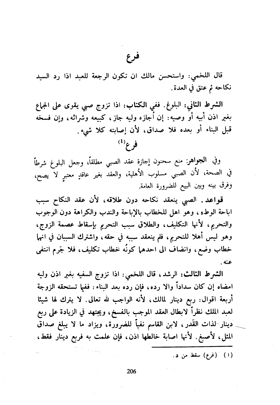 قَالَ اللَّخْمِيُّ وَاسْتَحْسَنَ مَالِكٌ أَنْ تَكُونَ الرَّجْعَةُ لِلْعَبْدِ إِذَا رَدَّ السَّيِّدُ نِكَاحَهُ ثُمَّ عَتَقَ فِي الْعِدَّةِ الشَّرْطُ الثَّانِي الْبُلُوغُ فَفِي الْكِتَابِ إِذَا تَزَوَّجَ صَبِيٌّ يَقْوَى عَلَى الْجِمَاعِ بِغَيْرِ إِذْنِ أَبِيهِ أَوْ وَصِيِّهِ إِنْ أَجَازَهُ وَلِيُّهُ جَازَ كَبَيْعِهِ وَشِرَائِهِ وَإِنْ فَسَخَهُ قَبْلَ الْبِنَاءِ أَوْ بَعْدَهُ فَلَا صَدَاقَ لِأَنَّ إِصَابَتَهُ كَلَا شَيْءٍ