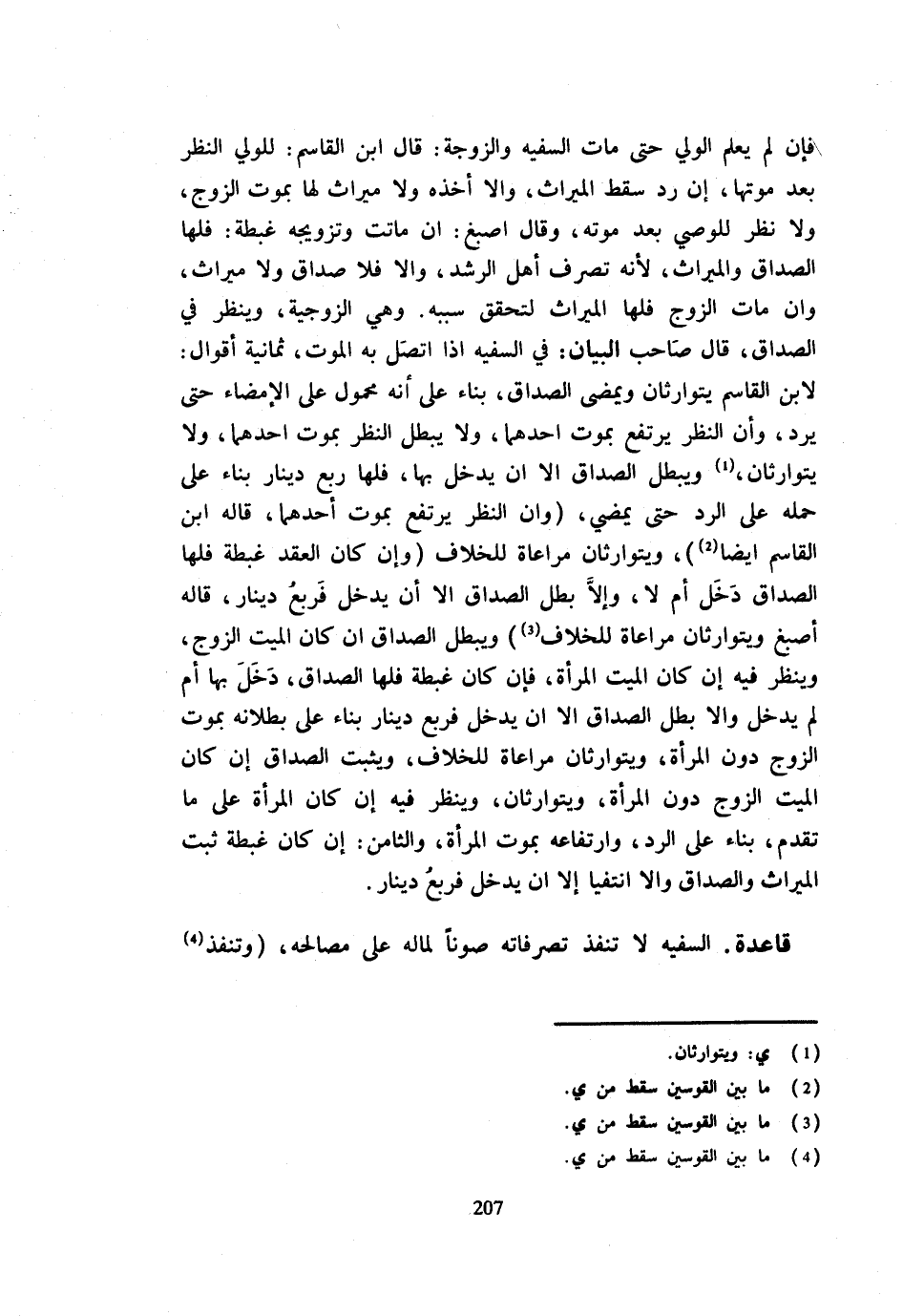 فَإِنْ لَمْ يَعْلَمِ الْوَلِيُّ حَتَّى مَاتَ السَّفِيهُ وَالزَّوْجَةُ قَالَ ابْنُ الْقَاسِمِ لِلْوَلِيِّ النَّظَرُ بَعْدَ مَوْتِهَا إِنْ رَدَّ سَقَطَ الْمِيرَاثُ وَإِلَّا أَخَذَهُ وَلَا مِيرَاثَ لَهَا بِمَوْتِ الزَّوْجِ وَلَا نَظَرَ للْوَصِيّ بَعْدَ مَوْتِهِ وَقَالَ أَصْبَغُ إِنْ مَاتَتْ وَتَزْوِيجُهُ غِبْطَةٌ فَلَهَا الصَّدَاقُ وَالْمِيرَاثُ لِأَنَّهُ تَصَرُّفُ أَهْلِ الرُّشْدِ وَإِلَّا فَلَا صَدَاقَ وَلَا مِيرَاثَ وَإِنْ مَاتَ الزَّوْجُ فَلَهَا الْمِيرَاثُ لِتَحَقُّقِ سَبَبِهِ وَهِيَ الزَّوْجِيَّةُ وَيُنْظَرُ فِي الصَّدَاقِ قَالَ صَاحِبُ الْبَيَانِ فِي السَّفِيهِ إِذَا اتَّصَلَ بِهِ الْمَوْتُ ثَمَانِيَةُ أَقْوَالٍ لِابْنِ الْقَاسِمِ يَتَوَارَثَانِ وَيَمْضِي الصَّدَاقُ بِنَاءً عَلَى أَنَّهُ مَحْمُولٌ عَلَى الْإِمْضَاءِ حَتَّى يَرُدَّ وَأَنَّ النَّظَرَ يَرْتَفِعُ بِمَوْتِ أَحَدِهِمَا وَلَا يَبْطُلُ النَّظَرُ بِمَوْتِ أَحَدِهِمَا وَلَا يَتَوَارَثَانِ وَيَبْطُلُ الصَّدَاقُ إِلَّا أَنْ يَدْخُلَ بِهَا فَلَهَا رُبُعُ دِينَارٍ بِنَاءً عَلَى حَمْلِهِ عَلَى الرَّدِّ حَتَّى يَمْضِيَ وَإِنَّ النَّظَرَ يَرْتَفِعُ بِمَوْتِ أَحَدِهِمَا قَالَهُ ابْنُ الْقَاسِمِ أَيْضًا وَيَتَوَارَثَانِ مُرَاعَاةً لِلْخِلَافِ وَإِنْ كَانَ الْعَقْدُ غِبْطَةً فَلَهَا الصَّدَاقُ دَخَلَ أَمْ لَا وَإِلَّا بَطَلَ الصَّدَاقُ إِلَّا أَنْ يَدْخُلَ فَرُبُعُ دِينَارٍ قَالَهُ أَصْبَغُ وَيَتَوَارَثَانِ مُرَاعَاةً لِلْخِلَافِ وَيَبْطُلُ الصَّدَاقُ إِنْ كَانَ الْمَيِّتُ الزَّوْجَ وَيُنْظَرُ فِيهِ إِنْ كَانَ الْمَيِّتُ الْمَرْأَةَ فَإِنْ كَانَ غِبْطَةً فَلَهَا الصَّدَاقُ دَخَلَ بِهَا أَمْ لَمْ يَدْخُلْ وَإِلَّا بَطَلَ الصَّدَاقُ إِلَّا أَنْ يَدْخُلَ فَرُبُعُ دِينَارٍ بِنَاءً عَلَى بُطْلَانِهِ بِمَوْتِ الزَّوْجِ دُونَ الْمَرْأَةِ وَيَتَوَارَثَانِ مُرَاعَاةً لِلْخِلَافِ وَيَثْبُتُ الصَّدَاقُ إِنْ كَانَ الْمَيِّتُ الزَّوْجَ دُونَ الْمَرْأَةِ وَيَتَوَارَثَانِ وَيُنْظَرُ فِيهِ إِن كَانَ الْمَرْأَةَ عَلَى مَا تَقَدَّمَ بِنَاءً عَلَى الرَّدِّ وَارْتِفَاعِهِ بِمَوْتِ الْمَرْأَةِ وَالثَّامِنُ إِنْ كَانَ غِبْطَةً ثَبَتَ الْمِيرَاثُ وَالصَّدَاقُ وَإِلَّا انْتَفَيَا إِلَّا أَنْ يدْخل فربع دِينَار قَاعِدَة السَّفِيه لَا تنفذ تَصَرُّفَاتِهِ صَوْنًا لِمَالِهِ عَلَى مَصَالِحِهِ وَتُنَفَّذُ