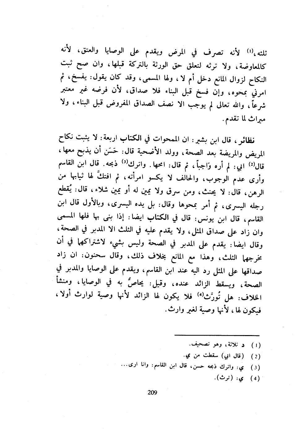 ثُلُثِهِ لِأَنَّهُ تَصَرَّفَ فِي الْمَرَضِ وَيُقَدَّمُ عَلَى الْوَصَايَا وَالْعِتْقِ لِأَنَّهُ كَالْمُعَاوَضَةِ وَلَا تَرِثُهُ لِتَعَلُّقِ حَقِّ الْوَرَثَةِ بِالتَّرِكَةِ قَبْلَهَا وَإِنْ صَحَّ ثَبَتَ النِّكَاحُ لِزَوَالِ الْمَانِعِ دَخَلَ أَمْ لَا وَلَهَا الْمُسَمَّى وَقَدْ كَانَ يَقُولُ يُفْسَخُ ثُمَّ أَمَرَنِي بِمَحْوِهِ وَإِنْ فُسِخَ قَبْلَ الْبِنَاءِ فَلَا صَدَاقَ لِأَنَّ فَرْضَهُ غَيْرُ مُعْتَبَرٍ شَرْعًا وَاللَّهُ تَعَالَى لَمْ يُوجِبْ إِلَّا نِصْفَ الصَّدَاقِ الْمَفْرُوضِ قَبْلَ الْبِنَاءِ وَلَا مِيرَاثَ لِمَا تَقَدَّمَ نَظَائِرُ قَالَ ابْنُ بَشِيرٍ إِنَّ الْمَمْحُوَّاتِ فِي الْكِتَابِ أَرْبَعَةٌ لَا يَثْبُتُ نِكَاحُ الْمَرِيضِ وَالْمَرِيضَةِ بَعْدَ الصِّحَّةِ وَوَلَدُ الْأُضْحِيَةِ قَالَ حَسَنٌ أَنْ يُذْبَحَ مَعَهَا قَالَ أُبَيٌّ لَمْ أَرَهُ وَاجِبًا ثُمَّ قَالَ امْحُهَا وَاتْرُكْ ذَبْحَهُ قَالَ ابْنُ الْقَاسِمِ وَأَرَى عَدَمَ الْوُجُوبِ وَالْحَالِفُ لَا يَكْسُو امْرَأَتَهُ ثُمَّ افتك لَهَا ثِيَابهَا مِنَ الرَّهْنِ قَالَ لَا يَحْنَثُ وَمَنْ سَرَقَ وَلَا يَمِين لَهُ أَو يَمِين شلاء قَالَ يقطع رِجْلُهُ الْيُسْرَى ثُمَّ أَمَرَ بِمَحْوِهَا وَقَالَ بَلْ يَدُهُ الْيُسْرَى وَبِالْأَوَّلِ قَالَ ابْنُ الْقَاسِمِ قَالَ ابْنُ يُونُسَ قَالَ فِي الْكِتَابِ أَيْضًا إِذَا بَنَى بِهَا فَلَهَا الْمُسَمَّى وَإِنْ زَادَ عَلَى صَدَاقِ الْمِثْلِ وَلَا يُقَدَّمُ عَلَيْهِ فِي الثُّلُثِ إِلَّا الْمُدَبَّرُ فِي الصِّحَّةِ وَقَالَ أَيْضًا يُقَدَّمُ عَلَى الْمُدَبَّرِ فِي الصِّحَّةِ وَلَيْسَ بِشَيْءٍ لِاشْتِرَاكِهِمَا فِي أَنَّ مَخْرَجَهُمَا الثُّلُثُ وَهَذَا مَعَ الْمَانِعِ بِخِلَاف ذَلِك وَقَالَ سَحْنُونٌ إِنْ زَادَ صَدَاقُهَا عَلَى الْمِثْلِ رُدَّ إِلَيْهِ عِنْدَ ابْنِ الْقَاسِمِ وَيُقَدَّمُ عَلَى الْوَصَايَا وَالْمُدَبَّرِ فِي الصِّحَّةِ وَيَسْقُطُ الزَّائِدُ عِنْدَهُ وَقِيلَ يُحَاصُّ بِهِ فِي الْوَصَايَا وَمَنْشَأُ الْخِلَافِ هَلْ تُوَرَّثُ فَلَا يَكُونَ لَهَا الزَّائِدُ لِأَنَّهَا وَصِيَّة لوَارث أَولا فَيَكُونَ لَهَا لِأَنَّهَا وَصِيَّةٌ لِغَيْرِ وَارِثٍ