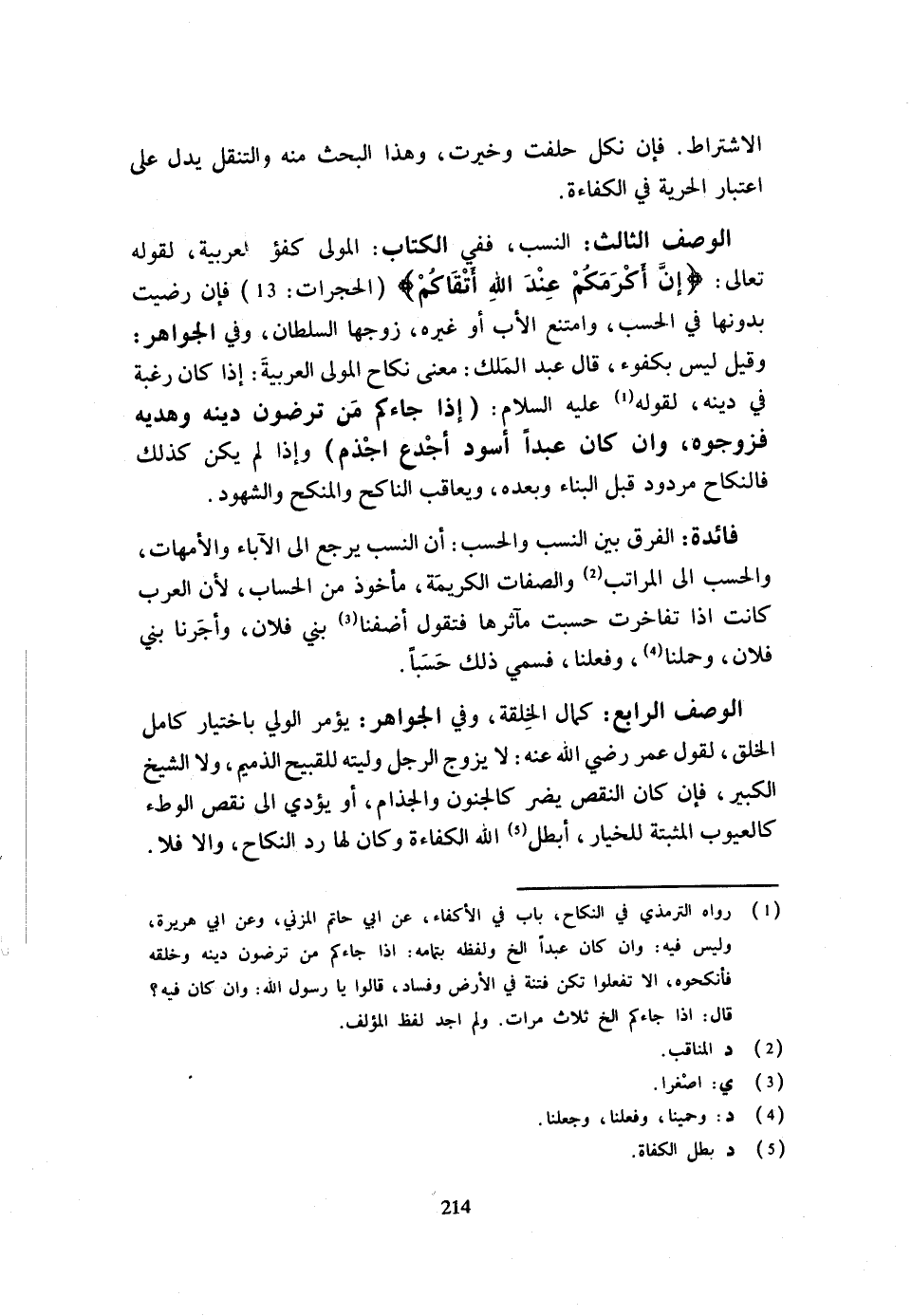 الِاشْتِرَاطِ فَإِنْ نَكَلَ حَلَفَتْ وَخُيِّرَتْ وَهَذَا الْبَحْثُ مِنْهُ والتنقل يَدُلُّ عَلَى اعْتِبَارِ الْحُرِّيَّةِ فِي الْكَفَاءَةِ الْوَصْفُ الثَّالِث النّسَب فَفِي الْكتاب الْمولى كفؤ الْعَرَبيَّة لِقَوْلِهِ تَعَالَى {إِنَّ أَكْرَمَكُمْ عِنْدَ اللَّهِ أَتْقَاكُمْ} الحجرات 13 فَإِنْ رَضِيَتْ بِدُونِهَا فِي الْحَسَبِ وَامْتَنَعَ الْأَبُ أَوْ غَيْرُهُ زَوَّجَهَا السُّلْطَانُ وَفِي الْجَوَاهِرِ وَقيل لَيْسَ بكفؤ قَالَ عَبْدُ الْمَلِكِ مَعْنَى نِكَاحِ الْمَوْلَى الْعَرَبِيَّةَ إِذَا كَانَ رَغْبَةً فِي دِينِهِ لِقَوْلِهِ عَلَيْهِ السَّلَامُ إِذَا جَاءَكُمْ مَنْ تَرْضَوْنَ دِينَهُ وَهَدْيَهُ فَزَوِّجُوهُ وَإِنْ كَانَ عَبْدًا أَسْوَدَ أَجْدَعَ أَجْذَمَ وَإِذَا لَمْ يَكُنْ كَذَلِكَ فَالنِّكَاحُ مَرْدُودٌ قَبْلَ الْبِنَاءِ وَبَعْدَهُ وَيُعَاقَبُ النَّاكِحُ وَالْمُنْكِحُ وَالشُّهُودُ فَائِدَةٌ الْفرق بَين النّسَب والحسب أَنَّ النَّسَبَ يَرْجِعُ إِلَى الْآبَاءِ وَالْأُمَّهَاتِ وَالْحَسَبَ إِلَى الْمُرَتّب وَالصِّفَاتِ الْكَرِيمَةِ مَأْخُوذٌ مِنَ الْحِسَابِ لِأَنَّ الْعَرَبَ كَانَتْ إِذَا تَفَاخَرَتْ حَسَبَتْ مَآثِرَهَا فَتَقُولُ أَضَفْنَا بني فلَان وأجرنا بني فلَان وحملنا وَفعلنَا فَسُمي ذَلِكَ حَسَبًا الْوَصْفُ الرَّابِعُ كَمَالُ الْخِلْقَةِ وَفِي الْجَوَاهِر يُؤمر الْوَلِيّ بِاخْتِيَار كَامِل الْخلق لِقَوْلِ عُمَرَ رَضِيَ اللَّهُ عَنْهُ لَا يُزَوِّجُ الرَّجُلُ وَلِيَّتَهُ لِلْقَبِيحِ الذَّمِيمِ وَلَا الشَّيْخِ الْكَبِيرِ فَإِنْ كَانَ النَّقْصُ يَضُرُّ كَالْجُنُونِ وَالْجُذَامِ أَوْ يُؤَدِّي إِلَى نقص الْوَطْء كالعيوب المثبتة للخيار أبطل الله الْكَفَاءَةَ وَكَانَ لَهَا رَدُّ النِّكَاحِ وَإِلَّا فَلَا