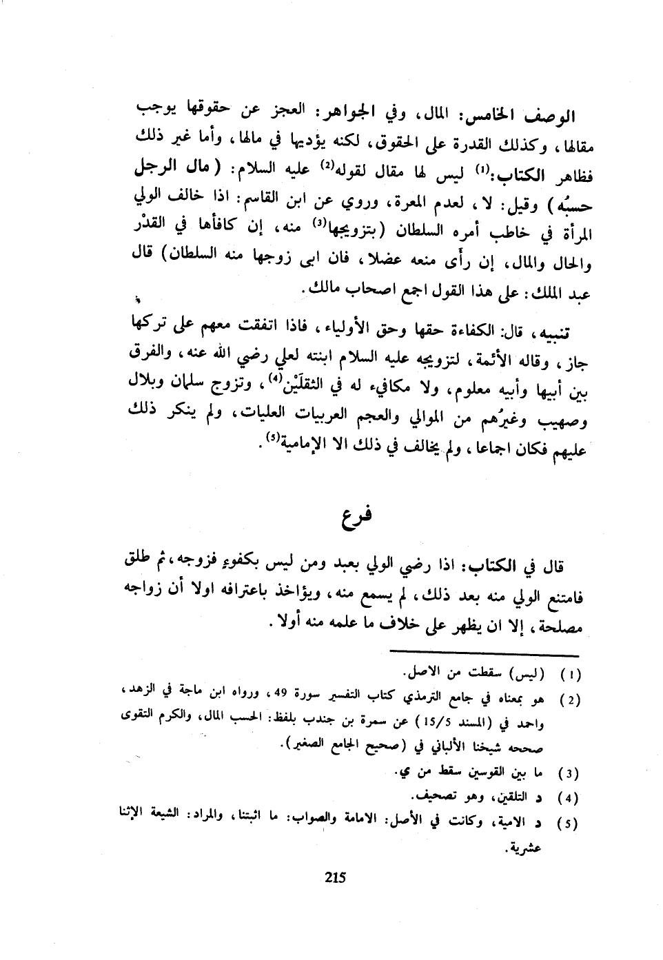 الْوَصْفُ الْخَامِسُ الْمَالُ وَفِي الْجَوَاهِرِ الْعَجْزُ عَنْ حُقُوقِهَا يُوجِبُ مَقَالَهَا وَكَذَلِكَ الْقُدْرَةُ عَلَى الْحُقُوقِ لَكِنَّهُ يُؤَدِّيهَا فِي مَالِهَا وَأَمَّا غَيْرُ ذَلِكَ فَظَاهر الْكتاب لَيْسَ لَهَا مَقَالٌ لِقَوْلِهِ عَلَيْهِ السَّلَامُ مَالُ الرَّجُلِ حَسَبُهُ وَقِيلَ لَا لِعَدَمِ الْمَعَرَّةِ وَرُوِيَ عَنِ ابْنِ الْقَاسِمِ إِذَا خَالَفَ الْوَلِيُّ الْمَرْأَةَ فِي خَاطِبٍ أَمَرَهُ السُّلْطَانُ بِتَزْوِيجِهَا مِنْهُ إِنْ كَافَأَهَا فِي الْقَدْرِ وَالْحَالِ وَالْمَالِ إِنْ رَأَى مَنْعَهُ عَضْلًا فَإِنْ أَبَى زَوَّجَهَا مِنْهُ السُّلْطَانُ قَالَ عَبْدُ الْمَلِكِ عَلَى هَذَا الْقَوْلِ أَجْمَعَ أَصْحَابُ مَالِكٍ تَنْبِيهٌ قَالَ الْكَفَاءَةُ حَقُّهَا وَحَقُّ الْأَوْلِيَاءِ فَإِذَا اتَّفَقَتْ مَعَهُمْ عَلَى تَرْكِهَا جَازَ وَقَالَهُ الْأَئِمَّةُ لِتَزْوِيجِهِ عَلَيْهِ السَّلَامُ ابْنَتَهُ لِعَلِيٍّ رَضِيَ اللَّهُ عَنْهُ وَالْفَرْقُ بَيْنَ أَبِيهَا وَأَبِيهِ مَعْلُومٌ وَلَا مُكَافِئَ لَهُ فِي الثَّقَلَيْنِ وَتَزَوَّجَ سَلْمَانُ وَبِلَالٌ وَصُهَيْبٌ وَغَيْرُهُمْ مِنَ الْمَوَالِي وَالْعَجَمِ الْعَرَبِيَّاتِ الْعَلِيَّاتِ وَلَمْ يُنْكَرْ ذَلِكَ عَلَيْهِمْ فَكَانَ إِجْمَاعًا وَلَمْ يُخَالِفْ فِي ذَلِكَ إِلَّا الْإِمَامِيَّةُ