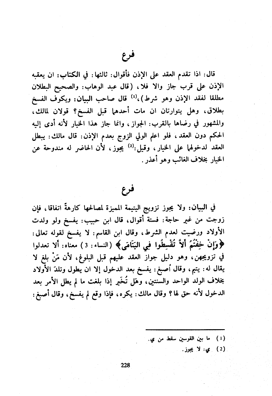 فِي الْبَيَانِ وَلَا يَجُوزُ تَزْوِيجُ الْيَتِيمَةِ الْمُمَيِّزَةِ لِمَصَالِحِهَا كَارِهَةً اتِّفَاقًا فَإِنْ زُوِّجَتْ مِنْ غَيْرِ حَاجَةٍ فَسِتَّةُ أَقْوَالٍ قَالَ ابْنُ حَبِيبٍ يُفْسَخُ وَلَوْ وَلَدَتِ الْأَوْلَادَ وَرَضِيَتْ لِعَدَمِ الشَّرْطِ وَقَالَ ابْنُ الْقَاسِمِ لَا يُفْسَخُ لِقَوْلِهِ تَعَالَى {وَإِنْ خِفْتُمْ أَلا تُقْسِطُوا فِي الْيَتَامَى} النِّسَاء 3 مَعْنَاهُ أَلَّا تَعْدِلُوا فِي تَزْوِيجِهِنَّ وَهُوَ دَلِيلُ جَوَازِ الْعَقْدِ عَلَيْهِم قَبْلَ الْبُلُوغِ لِأَنَّ مَنْ بَلَغَ لَا يُقَالُ لَهُ يَتِيمٌ وَقَالَ أَصْبَغُ يُفْسَخُ بَعْدَ الدُّخُولِ إِلَّا أَنْ يَطُولَ وَتَلِدَ الْأَوْلَادَ بِخِلَافِ الْوَلَدِ الْوَاحِدِ وَالسَّنَتَيْنِ وَهَلْ تُخَيَّرُ إِذَا بَلَغَتْ مَا لَمْ يَطُلِ الْأَمْرُ بَعْدَ الدُّخُولِ لِأَنَّهُ حَقٌّ لَهَا وَقَالَ مَالِكٌ يُكْرَهُ فَإِذَا وَقَعَ لَمْ يُفْسَخْ وَقَالَ أصبغ