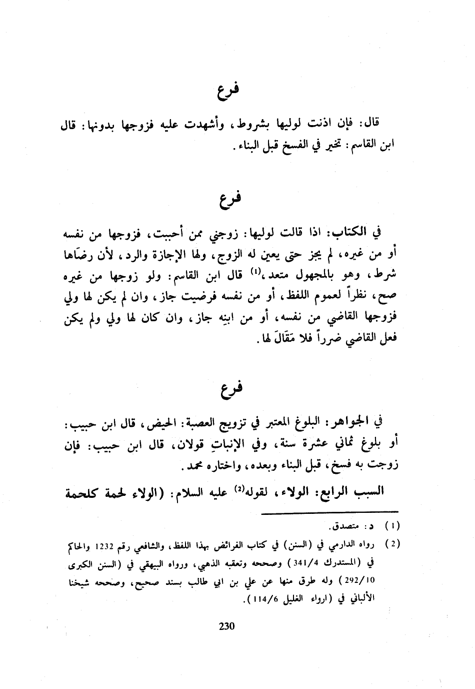 فِي الْجَوَاهِرِ الْبُلُوغُ الْمُعْتَبَرُ فِي تَزْوِيجِ الْعَصَبَةِ الْحَيْضُ قَالَ ابْنُ حَبِيبٍ أَوْ بُلُوغُ ثَمَانِي عَشْرَةَ سَنَةً وَفِي الْإِنْبَاتِ قَوْلَانِ قَالَ ابْنُ حَبِيبٍ فَإِنْ زُوِّجَتْ بِهِ فُسِخَ قَبْلَ الْبِنَاءِ وَبعده وَاخْتَارَهُ مُحَمَّد السَّبَب الرَّابِع الْوَلَاء لِقَوْلِهِ عَلَيْهِ السَّلَامُ الْوَلَاءُ لُحْمَةٌ كَلُحْمَةِ