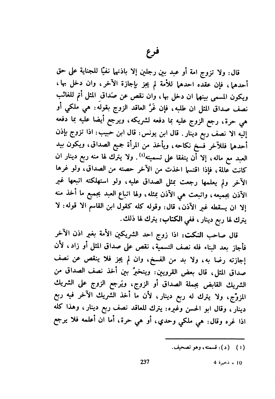 قَالَ وَلَا تُزَوَّجُ أَمَةٌ أَوْ عَبْدٌ بَيْنَ رَجُلَيْنِ إِلَّا بِإِذْنِهِمَا نَفْيًا لِلْجِنَايَةِ عَلَى حَقِّ أَحَدِهِمَا فَإِنْ عَقَدَهُ أَحَدُهُمَا لِلْأَمَةِ لَمْ يَجُزْ بِإِجَازَةِ الْآخَرِ وَإِنْ دَخَلَ بِهَا وَيَكُونُ الْمُسَمَّى بَيْنَهُمَا إِنْ دَخَلَ بِهَا وَإِنْ نَقَصَ عَنْ صَدَاقِ الْمِثْلِ أَتَمَّ لِلْغَائِبِ نِصْفَ صَدَاقِ الْمِثْلِ أَتَمَّ لِلْغَائِبِ نِصْفَ صَدَاقِ الْمِثْلِ إِنْ طَلَبَهُ فَإِنْ غَرَّ الْعَاقِدُ الزَّوْجَ بِقَوْلِهِ هِيَ مِلْكِي أَوْ هِيَ حُرَّةٌ رَجَعَ الزَّوْجُ عَلَيْهِ بِمَا دَفَعَهُ لِشَرِيكِهِ وَيَرْجِعُ أَيْضًا عَلَيْهِ بِمَا دَفَعَهُ إِلَيْهِ إِلَّا نِصْفَ رُبُعِ دِينَارٍ قَالَ ابْنُ يُونُسَ قَالَ ابْنُ حَبِيبٍ إِذَا تَزَوَّجَ بِإِذْنِ أَحَدِهِمَا فَلِلْآخَرِ فَسْخُ نِكَاحِهِ وَيَأْخُذُ مِنَ الْمَرْأَةِ جَمِيعَ الصَّدَاقِ وَيَكُونُ بِيَدِ الْعَبْدِ مَعَ مَاله إِلَّا أَن يتَّفقَا على تَسْمِيَته وَلَا يَتْرُكُ لَهَا مِنْهُ رُبُعَ دِينَارٍ إِنْ كَانَتْ عَالِمَةً فَإِذَا اقْتَسَمَا أَخَذَتْ مِنَ الْآخَرِ حِصَّتَهُ مِنَ الصَّدَاقِ وَلَوْ غَرَّهَا الْآخَرُ وَلَمْ يُعْلِمْهَا رَجَعَتْ بِمِثْلِ الصَّدَاقِ عَلَيْهِ وَلَوِ اسْتَهْلَكَتْهُ اتَّبَعَهَا غَيْرُ الْآذِنِ بِجَمِيعِهِ وَاتَّبَعَتْ هِيَ الْآذِنَ بِمِثْلِهِ وَلَهَا اتِّبَاعُ الْعَبْدِ بِجَمِيعِ مَا أُخِذَ مِنْهُ إِلَّا أَنْ يُسْقِطَهُ غَيْرُ الْآذِنِ قَالَ وَقَوْلُهُ كُلُّهُ كَقَوْلِ ابْنِ الْقَاسِمِ إِلَّا قَوْلَهُ لَا يَتْرُكُ لَهَا رُبُعَ دِينَارٍ فَفِي الْكِتَابِ يَتْرُكُ لَهَا ذَلِكَ قَالَ صَاحِبُ النُّكَتِ إِذَا زَوَّجَ أَحَدُ الشَّرِيكَيْنِ الْأَمَةَ بِغَيْرِ إِذْنِ الْآخَرِ فَأَجَازَ بَعْدَ الْبِنَاءِ فَلَهُ نِصْفُ التَّسْمِيَةِ نَقَصَ عَلَى صَدَاقِ الْمِثْلِ أَوْ زَادَ لِأَنَّ إِجَازَتَهُ رِضًا بِهِ وَلَا بُدَّ مِنَ الْفَسْخِ وَإِنْ لَمْ يُجِزْ فَلَا يَنْقُصُ عَنْ نِصْفِ صَدَاقِ الْمِثْلِ قَالَ بَعْضُ الْقَرَوِيِّينَ وَيَتَخَيَّرُ بَيْنَ أَخْذِ نِصْفِ الصَّدَاقِ مِنَ الشَّرِيكِ الْقَابِضِ بِجُمْلَةِ الصَّدَاقِ أَوِ الزَّوْجِ وَيَرْجِعُ الزَّوْجُ عَلَى الشَّرِيكِ الْمُزَوِّجِ وَلَا يَتْرُكُ لَهُ رُبُعَ دِينَارٍ لِأَنَّ مَا أَخَذَ الشَّرِيكُ الْآخَرُ فِيهِ رُبُعُ دِينَارٍ وَقَالَ أَبُو الْحَسَنِ وَغَيْرُهُ يَتْرُكُ لِلْعَاقِدِ نِصْفَ رُبُعِ دِينَارٍ وَهَذَا كُلُّهُ إِذَا غَرَّهُ وَقَالَ هِيَ مِلْكِي وَحْدِي أَوْ هِيَ حُرَّةٌ أَمَّا إِنْ أَعْلَمَهُ فَلَا يَرْجِعُ