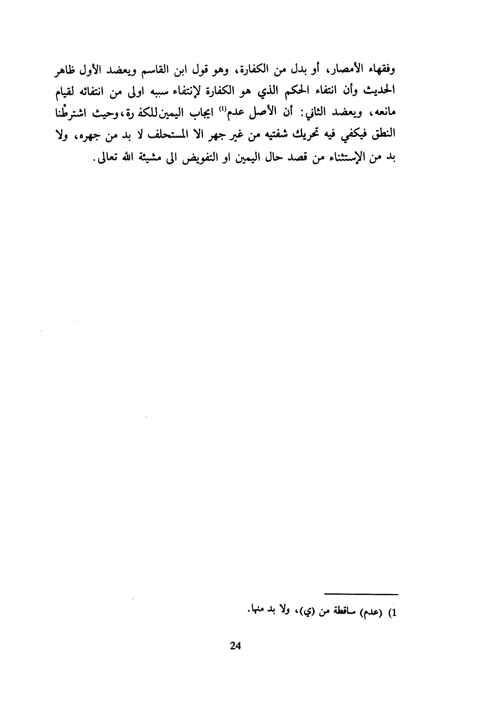 وَفُقَهَاءِ الْأَمْصَارِ أَوْ بَدَلٌ مِنَ الْكَفَّارَةِ وَهُوَ قَوْلُ ابْنِ الْقَاسِمِ وَيُعَضِّدُ الْأَوَّلَ ظَاهِرُ الْحَدِيثِ وَأَنَّ انْتِفَاءَ الْحُكْمِ الَّذِي هُوَ الْكَفَّارَةُ لانْتِفَاءِ سَببه أولى من انتفاءه لِقِيَامِ مَانِعِهِ وَيُعَضِّدُ الثَّانِيَ أَنَّ الْأَصْلَ عَدَمُ إِيجَابِ الْيَمِينِ لِلْكَفَّارَةِ وَحَيْثُ اشْتَرَطْنَا النُّطْقَ فَيَكْفِي فِيهِ تَحْرِيكُ شَفَتَيْهِ مِنْ غَيْرِ جَهْرٍ إِلَّا الْمُسْتَحْلَفَ لَا بُدَّ مِنْ جَهْرِهِ وَلَا بُدَّ مِنْ الِاسْتِثْنَاءِ مِنْ قَصْدِ حَالِ الْيَمِينِ أَوِ التَّفْوِيضِ إِلَى مَشِيئَةِ اللَّهِ تَعَالَى