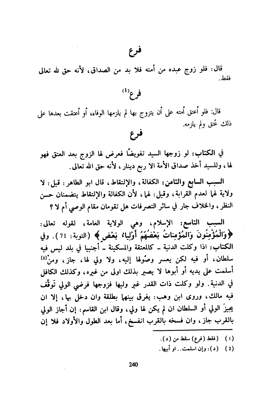 فِي الْكِتَابِ لَوْ زَوَّجَهَا السَّيِّدُ تَفْوِيضًا فَعَرَضَ لَهَا الزَّوْجُ بَعْدَ الْعِتْقِ فَهُوَ لَهَا وَلِلسَّيِّدِ أَخْذُ صَدَاقِ الْأَمَةِ إِلَّا رُبُعَ دِينَارٍ لِأَنَّهُ حَقُّ اللَّهِ تَعَالَى السَّبَبُ السَّابِعُ وَالثَّامِن الْكفَالَة والالتقاط قَالَ أَبُو الطَّاهِرِ قِيلَ لَا وِلَايَةَ لَهُمَا لِعَدَمِ الْقَرَابَةِ وَقِيلَ لَهُمَا لِأَنَّ الْكَفَالَةَ وَالِالْتِقَاطَ يَتَضَمَّنَانِ حُسْنَ النَّظَرِ وَالْخِلَافُ جَارٍ فِي سَائِرِ التَّصَرُّفَاتِ هَلْ تَقُومَانِ مَقَامَ الْوَصِيِّ أَمْ لَا السَّبَب التَّاسِع الْإِسْلَام وَهِيَ الْوِلَايَةُ الْعَامَّةُ لِقَوْلِهِ تَعَالَى {وَالْمُؤْمِنُونَ وَالْمُؤْمِنَاتُ بَعْضُهُمْ أَوْلِيَاءُ بَعْضٍ} التَّوْبَة 71 وَفِي الْكِتَابِ إِذَا وَكَّلَتِ الدَّنِيَّةُ كَالْمُعْتَقَةِ وَالْمِسْكِينَةِ أَجْنَبِيًّا فِي بَلَدٍ لَيْسَ فِيهِ سُلْطَانٌ أَوْ فِيهِ لَكِنْ يَعْسُرُ وُصُولُهَا إِلَيْهِ وَلَا وَلِيَّ لَهَا جَازَ وَمَنْ أَسْلَمَتْ عَلَى يَدَيْهِ أَوْ أَبُوهَا لَا يَصِيرُ بِذَلِكَ أَوْلَى مِنْ غَيْرِهِ وَكَذَلِكَ الْكَافِلُ فِي الدَّنِيَّةِ وَلَوْ وَكَّلَتْ ذَاتُ الْقَدْرِ غَيْرَ وَلِيِّهَا فَزَوَّجَهَا فَرَضِيَ الْوَلِيُّ تَوَقَّفَ فِيهِ مَالِكٌ وَرَوَى ابْنُ وَهْبٍ يُفَرَّقُ بَيْنَهُمَا بِطَلْقَةٍ وَإِنْ دَخَلَ بِهَا إِلَّا أَنْ يُجِيزَ الْوَلِيُّ أَوِ السُّلْطَانُ إِنْ لَمْ يَكُنْ لَهَا وَلِيٌّ وَقَالَ ابْنُ الْقَاسِمِ إِنْ أَجَازَ الْوَلِيُّ بِالْقُرْبِ جَازَ وَإِنْ فَسَخَهُ بِالْقُرْبِ انْفَسَخَ أَمَّا بَعْدَ الطَّوْلِ وَالْأَوْلَادِ فَلَا إِن