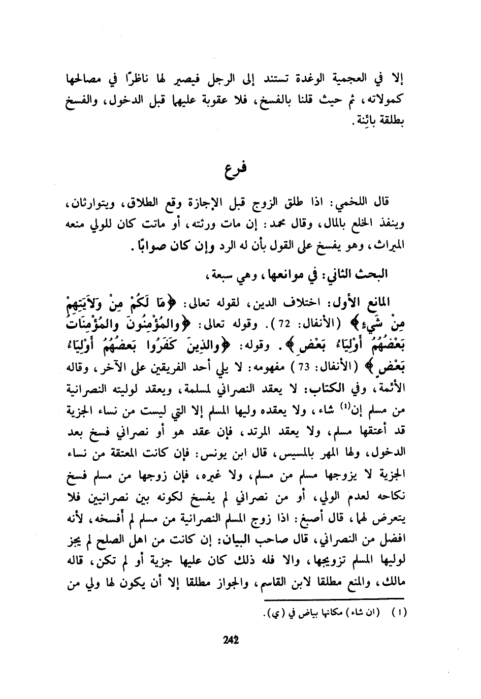 قَالَ اللَّخْمِيُّ إِذَا طَلَّقَ الزَّوْجُ قَبْلَ الْإِجَازَةِ وَقَعَ الطَّلَاقُ وَيَتَوَارَثَانِ وَيَنْفُذُ الْخُلْعُ بِالْمَالِ وَقَالَ مُحَمَّدٌ إِنْ مَاتَ ورثته أَو مَاتَت كَانَ للْوَلِيّ مَنعه الْمِيرَاثَ وَهُوَ يُفْسَخُ عَلَى الْقَوْلِ بِأَنَّ لَهُ الرَّدَّ وَإِنْ كَانَ صَوَابًا الْبَحْثُ الثَّانِي فِي مَوَانِعِهَا وَهِيَ سَبْعَةٌ الْمَانِعُ الْأَوَّلُ اخْتِلَافُ الدِّينِ لِقَوْلِهِ تَعَالَى {مَا لَكُمْ مِنْ وَلايَتِهِمْ مِنْ شَيْءٍ} الْأَنْفَال 72 وقَوْله تَعَالَى {وَالْمُؤْمِنُونَ وَالْمُؤْمِنَاتُ بَعْضُهُمْ أَوْلِيَاء بعض} وَقَوْلِهِ {وَالَّذِينَ كَفَرُوا بَعْضُهُمْ أَوْلِيَاءُ بَعْضٍ} الْأَنْفَال 73 مَفْهُومُهُ لَا يَلِي أَحَدُ الْفَرِيقَيْنِ عَلَى الْآخَرِ وَقَالَهُ الْأَئِمَّةُ وَفِي الْكِتَابِ لَا يَعْقِدُ النَّصْرَانِيُّ لِمُسْلِمَةٍ وَيَعْقِدُ لِوَلِيَّتِهِ النَّصْرَانِيَّةِ مِنْ مُسْلِمٍ إِنْ شَاءَ يَعْقِدُهُ وَلِيُّهَا الْمُسْلِمُ إِلَّا الَّتِي لَيْسَتْ مِنْ نسَاء الْجِزْيَةِ قَدْ أَعْتَقَهَا مُسْلِمٌ وَلَا يَعْقِدُ الْمُرْتَدُّ فَإِنْ عَقَدَ هُوَ أَوْ نَصَرَانِيٌّ فُسِخَ بَعْدَ الدُّخُولِ وَلَهَا الْمَهْرُ بِالْمَسِيسِ قَالَ ابْنُ يُونُسَ فَإِنْ كَانَتِ الْمُعْتَقَةُ مِنْ نِسَاءِ الْجِزْيَةِ لَا يُزَوِّجْهَا مُسْلِمٌ مِنْ مُسْلِمٍ وَلَا غَيْرِهِ فَإِنْ زَوَّجَهَا مِنْ مُسْلِمٍ فُسِخَ نِكَاحُهُ لِعَدَمِ الْوَلِيِّ أَوْ مِنْ نَصْرَانِيٍّ لَمْ يُفْسَخْ لِكَوْنِهِ بَيْنَ نَصْرَانِيَّيْنِ فَلَا يَتَعَرَّضُ لَهُمَا قَالَ أَصْبَغُ إِذَا زَوَّجَ الْمُسْلِمُ النَّصْرَانِيَّةَ مِنْ مُسْلِمٍ لَمْ أَفْسَخْهُ لِأَنَّهُ أَفْضَلُ مِنَ النَّصْرَانِيِّ قَالَ صَاحِبُ الْبَيَانِ إِنْ كَانَتْ مِنْ أَهْلِ الصُّلْحِ لَمْ يَجُزْ لِوَلِيِّهَا الْمُسْلِمِ تَزْوِيجُهَا وَإِلَّا فَلَهُ ذَلِكَ كَانَ عَلَيْهَا جِزْيَةٌ أَوْ لَمْ تَكُنْ قَالَهُ مَالِكٌ وَالْمَنْعُ مُطْلَقًا لِابْنِ الْقَاسِمِ وَالْجَوَازُ مُطْلَقًا إِلَّا أَنْ يَكُونَ لَهَا وَلِيٌّ مِنْ