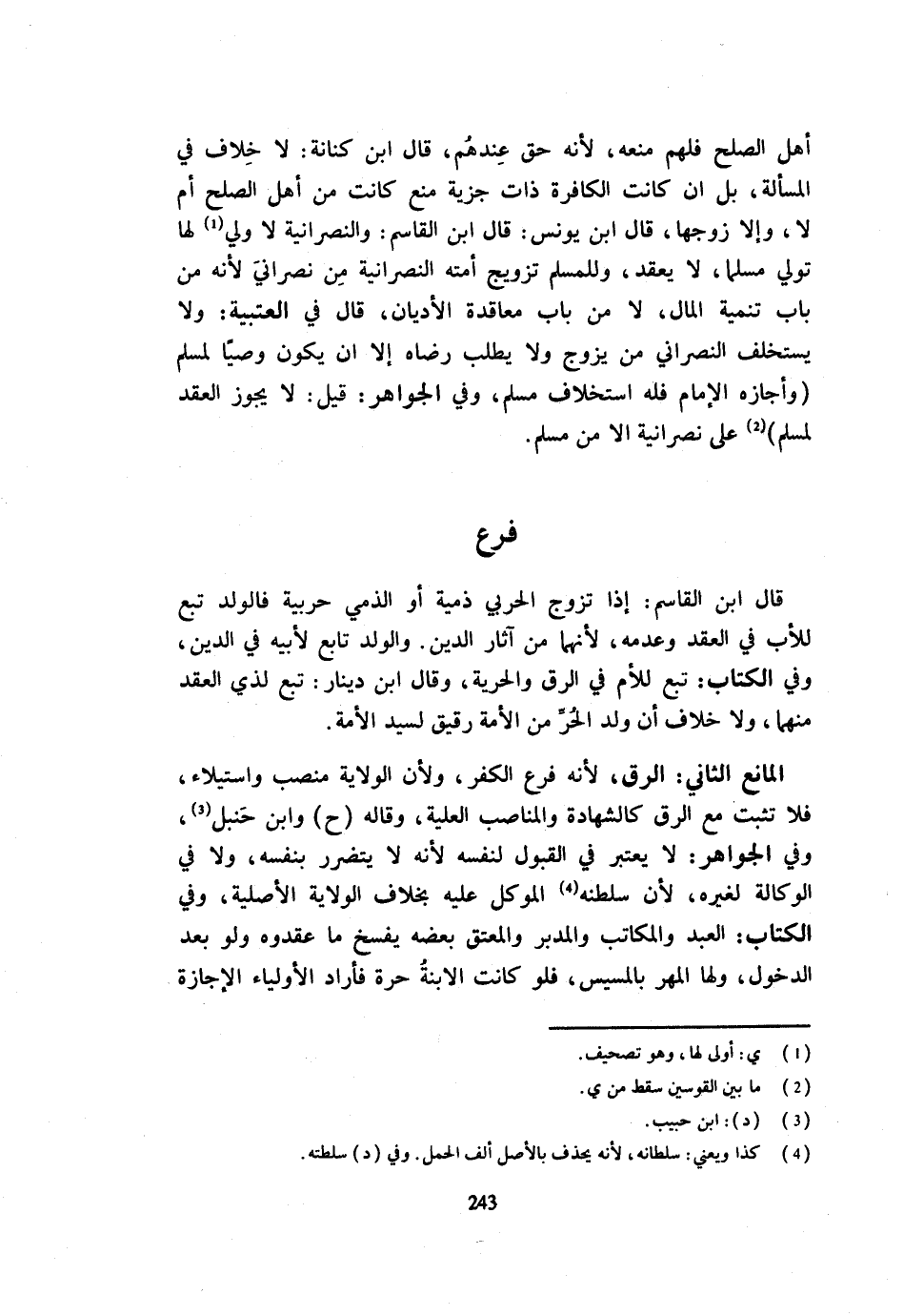 أَهْلِ الصُّلْحِ فَلَهُمْ مَنْعُهُ لِأَنَّهُ حَقٌّ عِنْدَهُمْ قَالَ ابْنُ كِنَانَةَ لَا خِلَافَ فِي الْمَسْأَلَةِ بَلْ إِنْ كَانَتِ الْكَافِرَةُ ذَاتَ جِزْيَةٍ مُنِعَ كَانَتْ مِنْ أَهْلِ الصُّلْحِ أَمْ لَا وَإِلَّا زَوَّجَهَا قَالَ ابْنُ يُونُسَ قَالَ ابْنُ الْقَاسِمِ وَالنَّصْرَانِيَّةُ لَا وَلِيَّ لَهَا تُوَلِّي مُسْلِمًا لَا يَعْقِدُ وَلِلْمُسْلِمِ تَزْوِيجُ أَمَتِهِ النَّصْرَانِيَّةِ مَنْ نَصْرَانِيٍّ لِأَنَّهُ مِنْ بَابِ تَنْمِيَةِ الْمَالِ لَا مِنْ بَابِ مُعَاقَدَةِ الْأَدْيَانِ قَالَ فِي الْعُتْبِيَّةِ وَلَا يَسْتَخْلِفُ النَّصْرَانِيُّ مَنْ يُزَوِّجُ وَلَا يَطْلُبُ رِضَاهُ إِلَّا أَنْ يَكُونَ وَصِيًّا لِمُسْلِمٍ وَأَجَازَهُ الْإِمَامُ فَلَهُ اسْتِخْلَافُ مُسْلِمٍ وَفِي الْجَوَاهِرِ قِيلَ لَا يَجُوزُ الْعَقْدُ لِمُسْلِمٍ عَلَى نَصْرَانِيَّةٍ إِلَّا مِنْ مُسْلِمٍ