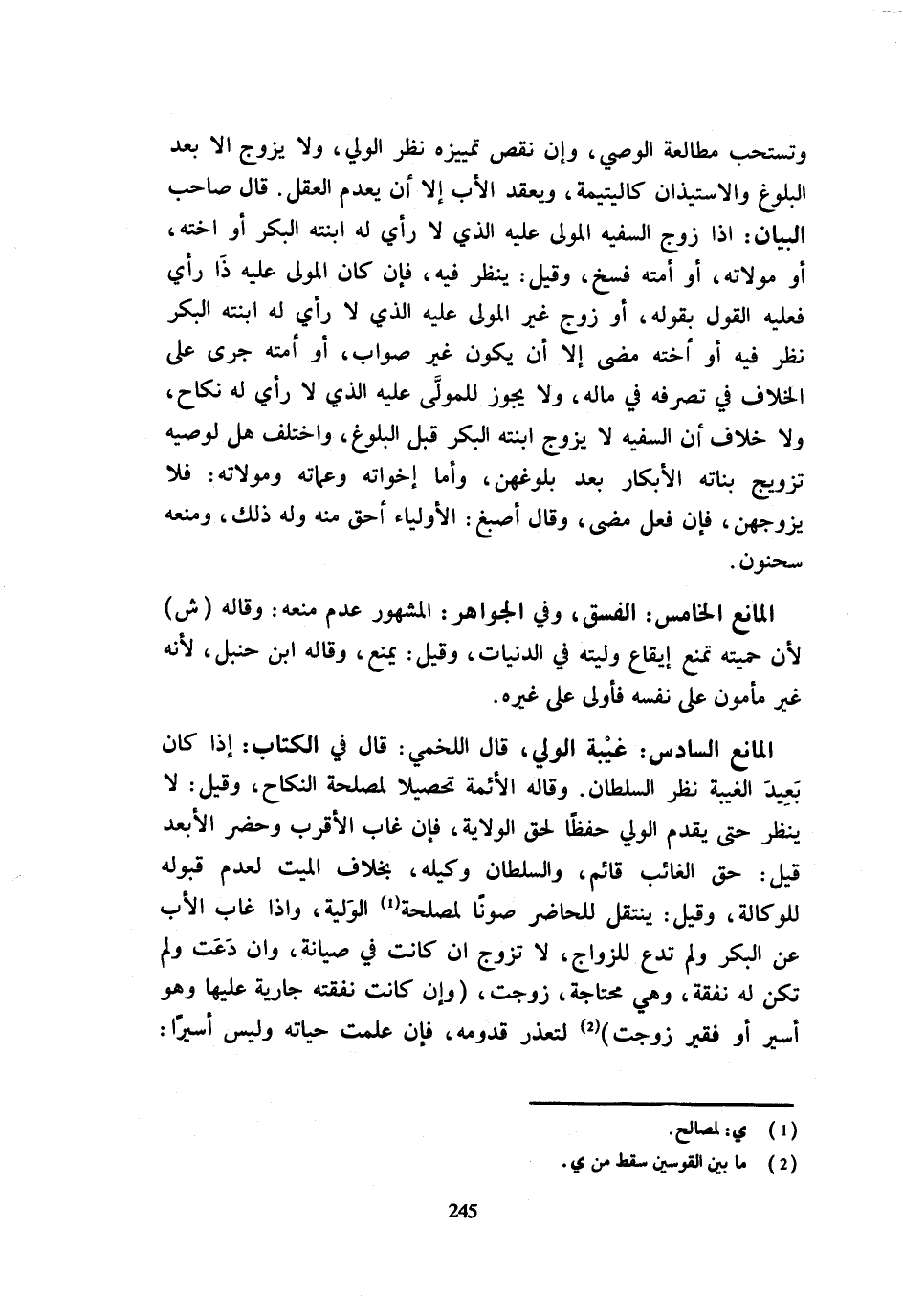 وتستحب مُطَالَعَةُ الْوَصِيِّ وَإِنْ نَقَصَ تَمْيِيزُهُ نَظَرَ الْوَلِيُّ وَلَا يُزَوّج إِلَّا بعد الْبلُوغ والاستيذان كَالْيَتِيمَةِ وَيَعْقِدُ الْأَبُ إِلَّا أَنْ يَعْدِمَ الْعَقْلَ قَالَ صَاحِبُ الْبَيَانِ إِذَا زَوَّجَ السَّفِيهُ الْمُوَلَّى عَلَيْهِ الَّذِي لَا رَأْيَ لَهُ ابْنَتَهُ الْبِكْرَ أَوْ أُخْتَهُ أَوْ مَوْلَاتَهُ أَوْ أَمَتَهُ فُسِخَ وَقِيلَ يُنْظَرُ فِيهِ فَإِنْ كَانَ الْمُوَلَّى عَلَيْهِ ذَا رَأْيٍ فَعَلَيْهِ الْقَوْلُ بِقَوْلِهِ أَوْ زَوَّجَ غَيْرُ الْمُوَلَّى عَلَيْهِ الَّذِي لَا رَأْيَ لَهُ ابْنَتَهُ الْبِكْرَ نُظِرَ فِيهِ أَوْ أُخْتَهُ مَضَى إِلَّا أَنْ يَكُونَ غَيْرَ صَوَابٍ أَوْ أَمَتَهُ جَرَى عَلَى الْخِلَافِ فِي تَصَرُّفِهِ فِي مَالِهِ وَلَا يَجُوزُ لِلْمُوَلَّى عَلَيْهِ الَّذِي لَا رَأْيَ لَهُ نِكَاحٌ وَلَا خِلَافَ أَنَّ السَّفِيهَ لَا يُزَوِّجُ ابْنَتَهُ الْبِكْرَ قَبْلَ الْبُلُوغِ وَاخْتُلِفَ هَلْ لِوَصِيِّهِ تَزْوِيجُ بَنَاتِهِ الْأَبْكَارِ بَعْدَ بُلُوغِهِنَّ وَأَمَّا أَخَوَاتُهُ وَعَمَّاتُهُ وَمَوْلَاتُهُ فَلَا يُزَوِّجُهُنَّ فَإِنْ فَعَلَ مَضَى وَقَالَ أَصْبَغُ الْأَوْلِيَاءُ أَحَقُّ مِنْهُ وَلَهُ ذَلِكَ وَمَنَعَهُ سَحْنُونٌ الْمَانِعُ الْخَامِسُ الْفِسْقُ وَفِي الْجَوَاهِرِ الْمَشْهُورُ عَدَمُ مَنْعِهِ وَقَالَهُ ش لِأَنَّ حَمِيَّتَهُ تَمْنَعُ إِيقَاعَ وَلِيَّتِهُ فِي الدَّنِيَّاتِ وَقِيلَ يُمْنَعُ وَقَالَهُ ابْنُ حَنْبَلٍ لِأَنَّهُ غَيْرُ مَأْمُونٍ عَلَى نَفْسِهِ فَأَوْلَى عَلَى غَيْرِهِ الْمَانِعُ السَّادِسُ غَيْبَةُ الْوَلِيِّ قَالَ اللَّخْمِيُّ قَالَ فِي الْكِتَابِ إِذَا كَانَ بَعِيدَ الْغَيْبَةِ نَظَرَ السُّلْطَانُ وَقَالَهُ الْأَئِمَّةُ تَحْصِيلًا لِمَصْلَحَةِ النِّكَاحِ وَقِيلَ لَا يَنْظُرُ حَتَّى يُقَدِّمَ الْوَلِيُّ حِفْظًا لِحَقِّ الْوِلَايَةِ فَإِنْ غَابَ الْأَقْرَبُ وَحَضَرَ الْأَبْعَدُ قِيلَ حَقُّ الْغَائِبِ قَائِمٌ وَالسُّلْطَانُ وَكِيلُهُ بِخِلَافِ الْمَيِّتِ لِعَدَمِ قَبُولِهِ لِلْوِكَالَةِ وَقِيلَ يَنْتَقِلُ لِلْحَاضِرِ صَوْنًا لِمَصْلَحَةِ الْوَلِيَّةِ وَإِذَا غَابَ الْأَبُ عَنِ الْبِكْرِ وَلَمْ تَدْعُ لِلزَّوَاجِ لَا تُزَوَّجُ إِنْ كَانَتْ فِي صِيَانَةٍ وَإِنْ دَعَتْ وَلَمْ تَكُنْ لَهُ نَفَقَةٌ وَهِيَ مُحْتَاجَةٌ زُوِّجَتْ وَإِنْ كَانَتْ نَفَقَتُهُ جَارِيَةً عَلَيْهَا وَهُوَ أَسِيرٌ أَوْ فَقِيرٌ زُوِّجَتْ لِتَعَذُّرِ قُدُومِهِ فَإِنْ عَلِمَتْ حَيَاتَهُ وَلَيْسَ أَسِيرًا