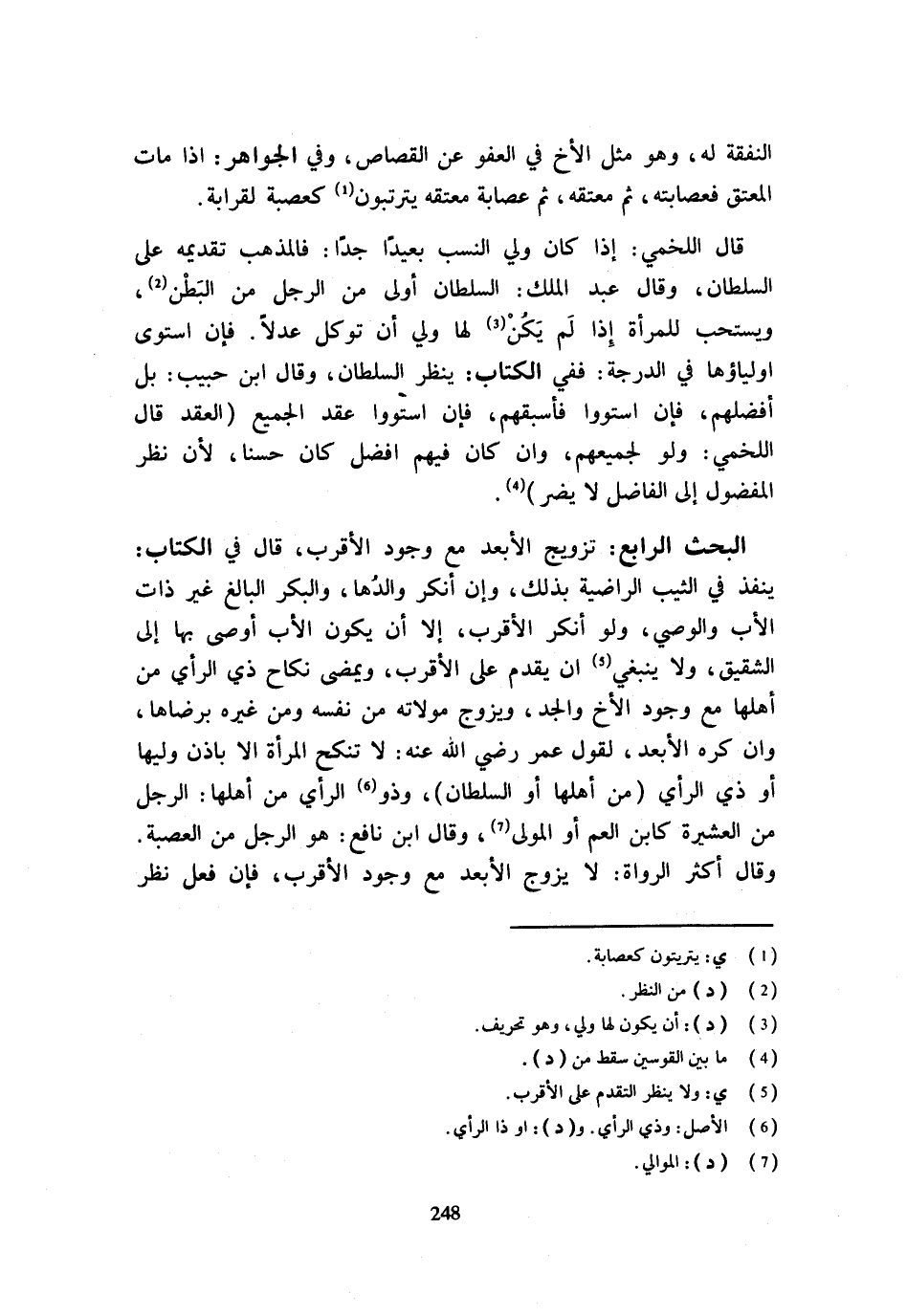 النَّفَقَةُ لَهُ وَهُوَ مِثْلُ الْأَخِ فِي الْعَفْوِ عَنِ الْقَصَاصِ وَفِي الْجَوَاهِرِ إِذَا مَاتَ الْمُعْتِقُ فعصابته ثمَّ مُعْتقه ثمَّ عِصَابَة مُعْتقه يترتبون كعصبة لقرابة قَالَ اللَّخْمِيُّ إِذَا كَانَ وَلِيُّ النَّسَبِ بَعِيدًا جِدًّا فَالْمَذْهَبُ تَقْدِيمُهُ عَلَى السُّلْطَانِ وَقَالَ عَبْدُ الْمَلِكِ السُّلْطَانُ أَوْلَى مِنَ الرَّجُلِ مِنَ الْبَطْنِ وَيُسْتَحَبُّ لِلْمَرْأَةِ إِذَا لَمْ يَكُنْ لَهَا وَلِيٌّ أَنْ تُوَكِّلَ عَدْلًا فَإِنِ اسْتَوَى أَوْلِيَاؤُهَا فِي الدَّرَجَةِ فَفِي الْكِتَابِ يَنْظُرُ السُّلْطَانُ وَقَالَ ابْنُ حَبِيبٍ بَلْ أَفْضَلُهُمْ فَإِنْ اسْتَوُوا فَأَسْبَقُهُمْ فَإِنْ اسْتَوُوا عَقَدَ الْجَمِيعُ الْعَقْدَ قَالَ اللَّخْمِيُّ وَلَوْ لِجَمِيعِهِمْ وَإِنْ كَانَ فِيهِمْ أَفْضَلُ كَانَ حَسَنًا لِأَنَّ نَظَرَ الْمَفْضُولِ إِلَى الْفَاضِلِ لَا يَضُرُّ الْبَحْثُ الرَّابِعُ تَزْوِيجُ الْأَبْعَدِ مَعَ وُجُودِ الْأَقْرَبِ قَالَ فِي الْكِتَابِ يَنْفُذُ فِي الثَّيِّبِ الرَّاضِيَةِ بِذَلِكَ وَإِنْ أَنْكَرَ وَالِدُهَا وَالْبِكْرِ الْبَالِغِ غَيْرِ ذَاتِ الْأَبِ وَالْوَصِيِّ وَلَوْ أَنْكَرَ الْأَقْرَبُ إِلَّا أَنْ يَكُونَ الْأَبُ أَوْصَى بِهَا إِلَى الشَّقِيقِ وَلَا يَنْبَغِي أَن يتَقَدَّم عَلَى الْأَقْرَبِ وَيَمْضِي نِكَاحُ ذِي الرَّأْيِ مِنْ أَهْلِهَا مَعَ وُجُودِ الْأَخِ وَالْجَدِّ وَيُزَوِّجُ مَوْلَاتَهُ مِنْ نَفْسِهِ وَمِنْ غَيْرِهِ بِرِضَاهَا وَإِنْ كَرِهَ الْأَبْعَدُ لِقَوْلِ عُمَرَ رَضِيَ اللَّهُ عَنْهُ لَا تُنْكَحُ الْمَرْأَةُ إِلَّا بِإِذْنِ وَلِيِّهَا أَوْ ذِي الرَّأْي من أَهلهَا أَو السُّلْطَان وَذُو الرَّأْي من أَهلهَا الرَّجُلُ مِنَ الْعَشِيرَةِ كَابْنِ الْعَمِّ أَوِ الْمَوْلَى وَقَالَ ابْنُ نَافِعٍ هُوَ الرَّجُلُ مِنَ الْعَصَبَةِ وَقَالَ أَكثر الروَاة لَا يُزَوّج الْأَبْعَد مَعَ وجود الْأَقْرَب فَإِنْ فَعَلَ نَظَرَ