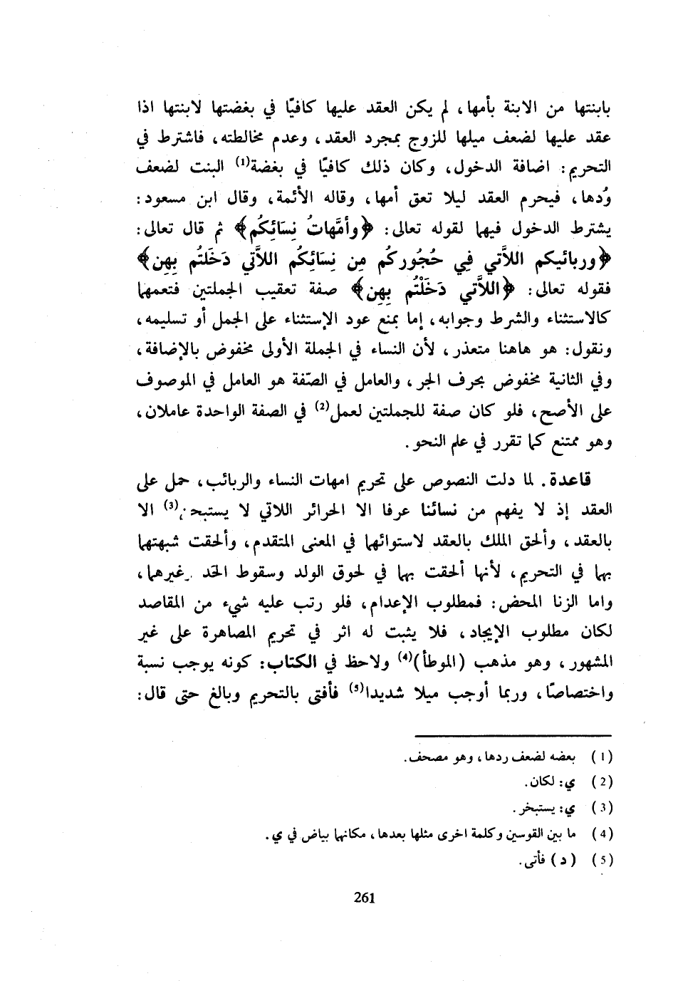 بِابْنَتِهَا مِنَ الِابْنَةِ بِأُمِّهَا لَمْ يَكُنِ الْعَقْدُ عَلَيْهَا كَافِيا فِي بغضتها لِابْنَتِهَا إِذَا عُقِدَ عَلَيْهَا لِضَعْفِ مَيْلِهَا لِلزَّوْجِ بِمُجَرَّدِ الْعَقْدِ وَعَدَمِ مُخَالَطَتِهِ فَاشْتُرِطَ فِي التَّحْرِيمِ إِضَافَةُ الدُّخُولِ وَكَانَ ذَلِكَ كَافِيًا فِي بِغْضَةِ الْبِنْت لضعف ودها فَيحرم العقد لَيْلًا تَعُقَّ أُمَّهَا وَقَالَهُ الْأَئِمَّةُ وَقَالَ ابْنُ مَسْعُودٍ يشْتَرط الدُّخُول فيهمَا لقَوْله تَعَالَى {وَأُمَّهَات نِسَائِكُم} ثمَّ قَالَ تَعَالَى {وربائيكم اللاتِي فِي حُجُورِكُمْ مِنْ نِسَائِكُمُ اللاتِي دَخَلْتُمْ بِهن} فَقَوله تَعَالَى {اللَّاتِي دَخَلْتُم بِهن} صِفَةُ تَعْقِيبِ الْجُمْلَتَيْنِ فَتَعُمُّهُمَا كَالِاسْتِثْنَاءِ وَالشَّرْطِ وَجَوَابِهِ إِمَّا بِمَنْع عَوْدَ الِاسْتِثْنَاءِ عَلَى الْجُمَلِ أَوْ تَسْلِيمِهِ وَنَقُولُ هُوَ هَا هُنَا مُتَعَذِّرٌ لِأَنَّ النِّسَاءَ فِي الْجُمْلَةِ الْأُولَى مَخْفُوضٌ بِالْإِضَافَةِ وَفِي الثَّانِيَةِ مَخْفُوضٌ بِحَرْفِ الْجَرِّ وَالْعَامِلُ فِي الصِّفَةِ هُوَ الْعَامِلُ فِي الْمَوْصُوفِ عَلَى الْأَصَحِّ فَلَوْ كَانَ صِفَةً لِلْجُمْلَتَيْنِ لَعَمِلَ فِي الصِّفَةِ الْوَاحِدَةِ عَامِلَانِ وَهُوَ مُمْتَنِعٌ كَمَا تَقَرَّرَ فِي عِلْمِ النَّحْوِ قَاعِدَةٌ لَمَّا دَلَّتِ النُّصُوصُ عَلَى تَحْرِيمِ أُمَّهَاتِ النِّسَاءِ وَالرَّبَائِبِ حُمِلَ عَلَى الْعَقْدِ إِذْ لَا يُفْهَمُ مِنْ نِسَائِنَا عُرْفًا إِلَّا الْحَرَائِرُ اللَّاتِي لَا يُسْتَبَحْنَ إِلَّا بِالْعَقْدِ وَأُلْحِقَ الْمِلْكُ بِالْعَقْدِ لِاسْتِوَائِهِمَا فِي الْمَعْنَى الْمُتَقَدِّمِ وَأُلْحِقَتْ شُبْهَتُهُمَا بِهِمَا فِي التَّحْرِيمِ لِأَنَّهَا أُلْحِقَتْ بِهِمَا فِي لُحُوقِ الْوَلَدِ وَسُقُوطِ الْحَدِّ وَغَيْرِهِمَا وَأَمَّا الزِّنَا الْمَحْضُ فَمَطْلُوبُ الْإِعْدَامِ فَلَوْ رُتِّبَ عَلَيْهِ شَيْءٌ مِنَ الْمَقَاصِدِ لَكَانَ مَطْلُوبَ الْإِيجَادِ فَلَا يَثْبُتُ لَهُ أَثَرٌ فِي تَحْرِيمِ الْمُصَاهَرَةِ عَلَى غَيْرِ الْمَشْهُورِ وَهُوَ مَذْهَبُ الْمُوَطَّأِ وَلَاحَظَ فِي الْكِتَابِ كَوْنَهُ يُوجِبُ نِسْبَةً وَاخْتِصَاصًا وَرُبَّمَا أَوْجَبَ مَيْلًا شَدِيدًا فَأَفْتَى بِالتَّحْرِيمِ وَبَالَغَ حَتَّى قَالَ