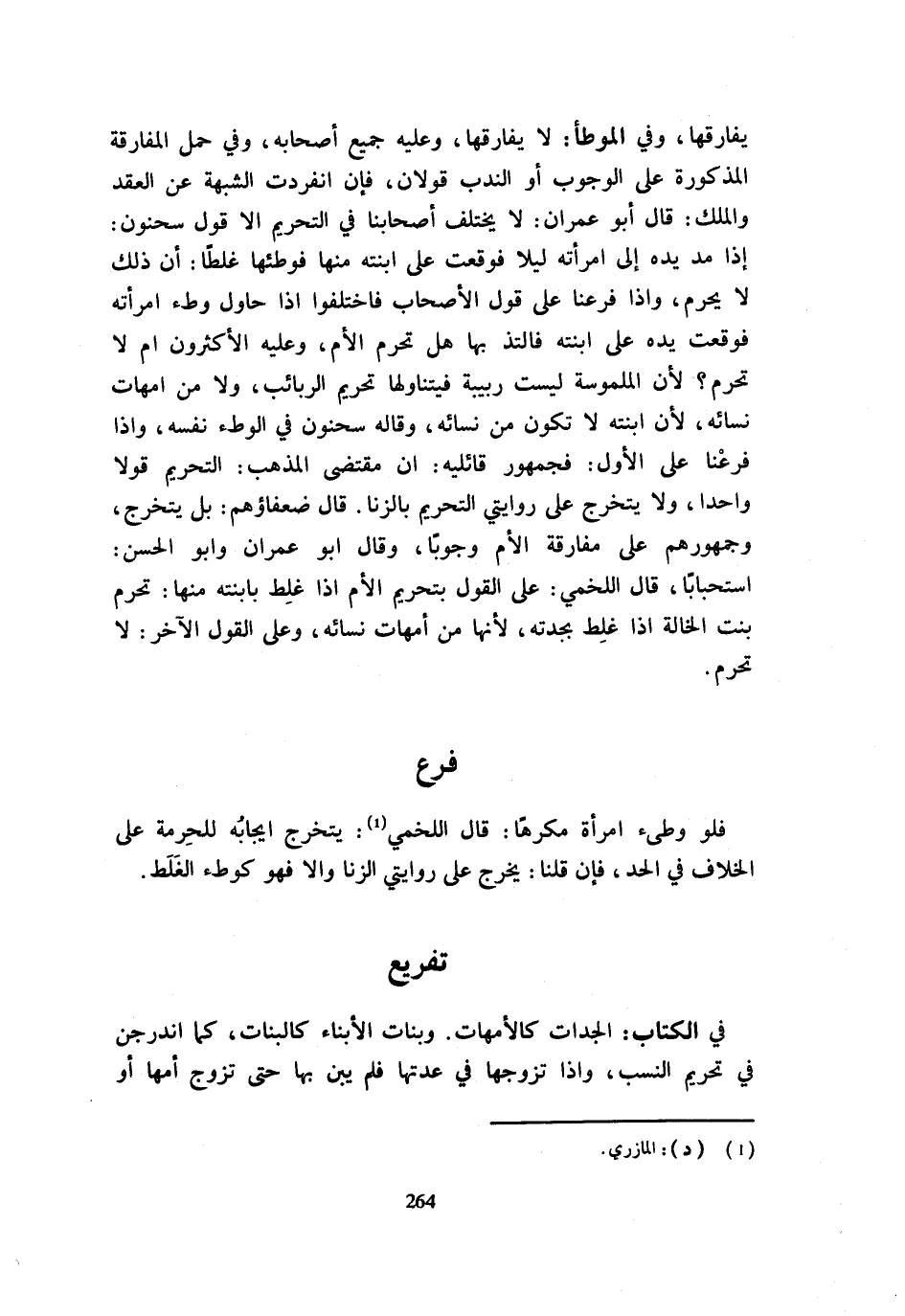 يُفَارِقُهَا وَفِي الْمُوَطَّأِ لَا يُفَارِقُهَا وَعَلَيْهِ جَمِيعُ أَصْحَابِهِ وَفِي حَمْلِ الْمُفَارَقَةِ الْمَذْكُورَةِ عَلَى الْوُجُوبِ أَوِ النَّدْبِ قَوْلَانِ فَإِنِ انْفَرَدَتِ الشُّبْهَةُ عَنِ الْعَقْدِ وَالْمِلْكِ قَالَ أَبُو عِمْرَانَ لَا يَخْتَلِفُ أَصْحَابُنَا فِي التَّحْرِيمِ إِلَّا قَوْلَ سَحْنُونٍ إِذَا مَدَّ يَدَهُ إِلَى امْرَأَتِهِ لَيْلًا فَوَقَعَتْ عَلَى ابْنَتِهِ مِنْهَا فَوَطِئَهَا غَلَطًا أَنَّ ذَلِكَ لَا يُحَرِّمُ وَإِذَا فَرَّعْنَا عَلَى قَوْلِ الْأَصْحَابِ فَاخْتَلَفُوا إِذَا حَاوَلَ وَطْءَ امْرَأَتِهِ فَوَقَعَتْ يَدُهُ عَلَى ابْنَتِهِ فَالْتَذَّ بِهَا هَلْ تَحْرُمُ الْأُمُّ وَعَلَيْهِ الْأَكْثَرُونَ أَمْ لَا تَحْرُمُ لِأَنَّ الْمَلْمُوسَةَ لَيْسَتْ رَبِيبَةً فَيَتَنَاوَلَهَا تَحْرِيمُ الرَّبَائِبِ وَلَا مِنْ أُمَّهَاتِ نِسَائِهِ لِأَنَّ ابْنَتَهُ لَا تَكُونُ مِنْ نِسَائِهِ وَقَالَهُ سَحْنُونٌ فِي الْوَطْءِ نَفْسِهِ وَإِذَا فَرَّعْنَا عَلَى الْأَوَّلِ فَجُمْهُورُ قَائِلِيهِ إِنَّ مُقْتَضَى الْمَذْهَبِ التَّحْرِيمُ قَوْلًا وَاحِدًا وَلَا يَتَخَرَّجُ عَلَى رِوَايَتَيِ التَّحْرِيمِ بِالزِّنَا قَالَ ضُعَفَاؤُهُمْ بَلْ يَتَخَرَّجُ وَجُمْهُورُهُمْ عَلَى مُفَارَقَةِ الْأُمِّ وُجُوبًا وَقَالَ أَبُو عِمْرَانَ وَأَبُو الْحَسَنِ اسْتِحْبَابًا قَالَ اللَّخْمِيُّ عَلَى الْقَوْلِ بِتَحْرِيمِ الْأُمِّ إِذَا غَلِطَ بِابْنَتِهِ مِنْهَا تَحْرُمُ بِنْتُ الْخَالَةِ إِذَا غَلِطَ بِجَدَّتِهِ لِأَنَّهَا مِنْ أُمَّهَاتِ نِسَائِهِ وَعَلَى الْقَوْلِ الْآخَرِ لَا تَحْرُمُ