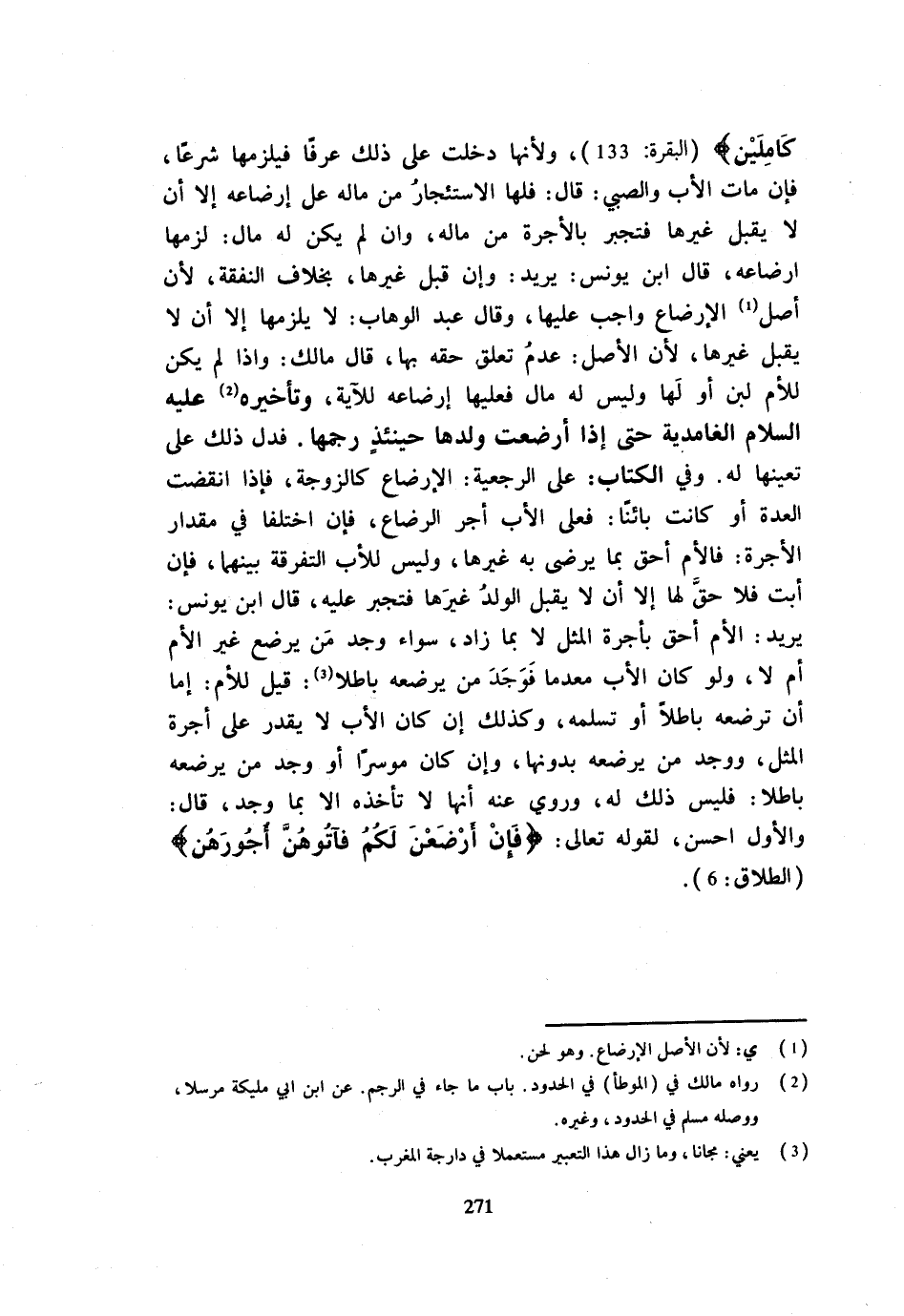 كَامِلَيْنِ} الْبَقَرَة 133 وَلِأَنَّهَا دَخَلَتْ عَلَى ذَلِكَ عُرْفًا فيلزمها شرعا فَإِن مَاتَ الْأَب وَالصَّبِيّ قَالَ فلهَا الِاسْتِئْجَار من مَاله عل إرضاعه إِلَّا أَن لَا يَقْبَلَ غَيْرُهَا فَتُجْبَرَ بِالْأُجْرَةِ مِنْ مَالِهِ وَإِنْ لَمْ يَكُنْ لَهُ مَالٌ لَزِمَهَا إِرْضَاعُهُ قَالَ ابْنُ يُونُسَ يُرِيدُ وَإِنْ قَبِلَ غَيْرُهَا بِخِلَافِ النَّفَقَةِ لِأَنَّ أَصْلَ الْإِرْضَاعِ وَاجِبٌ عَلَيْهَا وَقَالَ عبد الْوَهَّاب لَا يلْزمهَا إِلَّا أَن لَا يقبل غَيرهَا لِأَن الأَصْل عدم تعلق حَقه بِهَا قَالَ مَالِكٌ وَإِذَا لَمْ يَكُنْ لِلْأُمِّ لَبَنٌ أَوْ لَهَا وَلَيْسَ لَهُ مَالٌ فَعَلَيْهَا إِرْضَاعُهُ لِلْآيَةِ وَتَأْخِيرِهِ عَلَيْهِ السَّلَامُ الْغَامِدِيَّةَ حَتَّى إِذا أرضعت وَلَدهَا حِينَئِذٍ رَجَمَهَا فَدَلَّ ذَلِكَ عَلَى تَعَيُّنِهَا لَهُ وَفِي الْكتاب على الرَّجْعِيَّة الْإِرْضَاع كَالزَّوْجَةِ فَإِذَا انْقَضَتِ الْعِدَّةُ أَوْ كَانَتْ بَائِنًا فعلى الْأَب أجر الرَّضَاع فَإِنِ اخْتَلَفَا فِي مِقْدَارِ الْأُجْرَةِ فَالْأُمُّ أَحَقُّ بِمَا يَرْضَى بِهِ غَيْرُهَا وَلَيْسَ لِلْأَبِ التَّفْرِقَةُ بَيْنَهُمَا فَإِنْ أَبَتْ فَلَا حَقَّ لَهَا إِلَّا أَن لَا يَقْبَلَ الْوَلَدُ غَيْرَهَا فَتُجْبَرَ عَلَيْهِ قَالَ ابْنُ يُونُسَ يُرِيدُ الْأُمُّ أَحَقُّ بِأُجْرَةِ الْمِثْلِ لَا بِمَا زَادَ سَوَاءٌ وُجِدَ مَنْ يُرْضِعُ غَيْرُ الْأُمِّ أَمْ لَا وَلَوْ كَانَ الْأَبُ مُعْدِمًا فَوَجَدَ مَنْ يُرْضِعُهُ بَاطِلًا قِيلَ لِلْأُمِّ إِمَّا أَنْ تُرْضِعَهُ بَاطِلًا أَوْ تُسَلِّمَهُ وَكَذَلِكَ إِنْ كَانَ الْأَبُ لَا يَقْدِرُ عَلَى أُجْرَةِ الْمِثْلِ وَوَجَدَ مَنْ يُرْضِعُهُ بِدُونِهَا وَإِنْ كَانَ مُوسِرًا أَو وجد مَنْ يُرْضِعُهُ بَاطِلًا فَلَيْسَ ذَلِكَ لَهُ وَرُوِيَ عَنْهُ أَنَّهَا لَا تَأْخُذُهُ إِلَّا بِمَا وَجَدَ قَالَ وَالْأَوَّلُ أَحْسَنُ لِقَوْلِهِ تَعَالَى {فَإِنْ أَرْضَعْنَ لَكُمْ فَآتُوهُنَّ أُجُورَهُنَّ} الطَّلَاق 6