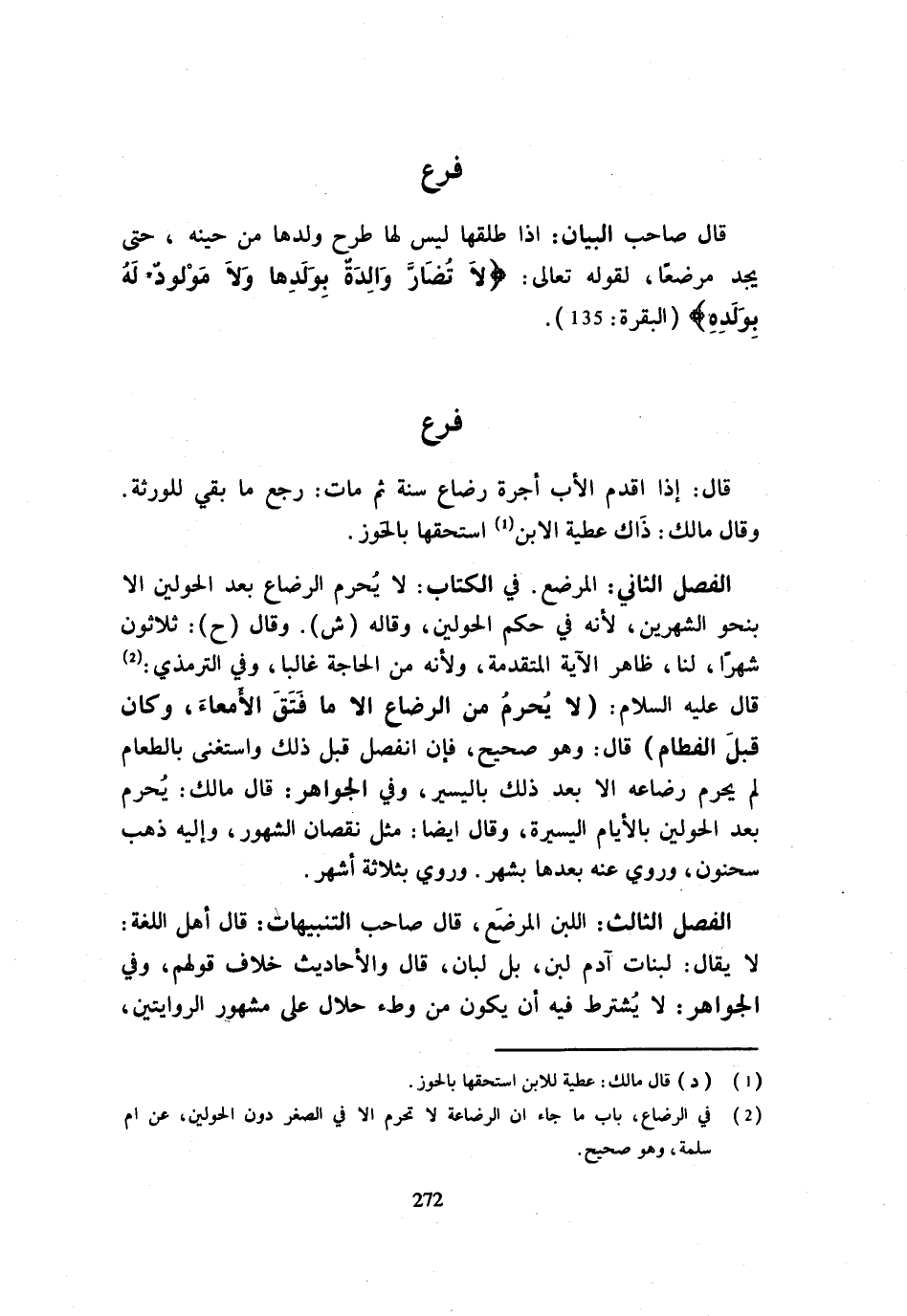 قَالَ إِذا أقدم الْأَبُ أُجْرَةَ رَضَاعِ سَنَةٍ ثُمَّ مَاتَ رَجَعَ مَا بَقِيَ لِلْوَرَثَةِ وَقَالَ مَالِكٌ ذَاكَ عَطِيَّةُ الابْن اسْتحقَّهَا بالحوز الْفَصْل الثَّانِي الْمُرْضع فِي الْكِتَابِ لَا يُحَرَّمُ الرَّضَاعُ بَعْدَ الْحَوْلَيْنِ إِلَّا بِنَحْوِ الشَّهْرَيْنِ لِأَنَّهُ فِي حُكْمِ الْحَوْلَيْنِ وَقَالَهُ ش وَقَالَ ح ثَلَاثُونَ شَهْرًا لَنَا ظَاهِرُ الْآيَة الْمُتَقَدّمَة وَلِأَنَّهُ من الْحَاجَةِ غَالِبًا وَفِي التِّرْمِذِيِّ قَالَ عَلَيْهِ السَّلَامُ لَا يُحَرِّمُ مِنَ الرَّضَاعِ إِلَّا مَا فَتَقَ الْأَمْعَاءَ وَكَانَ قَبْلَ الْفِطَامِ قَالَ وَهُوَ صَحِيحٌ فَإِنِ انْفَصَلَ قَبْلَ ذَلِكَ وَاسْتَغْنَى بِالطَّعَامِ لَمْ يُحَرِّمْ رَضَاعُهُ إِلَّا بَعْدَ ذَلِكَ بِالْيَسِيرِ وَفِي الْجَوَاهِرِ قَالَ مَالِكٌ يُحَرِّمُ بَعْدَ الْحَوْلَيْنِ بِالْأَيَّامِ الْيَسِيرَةِ وَقَالَ أَيْضًا مِثْلَ نُقْصَانِ الشُّهُورِ وَإِلَيْهِ ذَهَبَ سَحْنُونٌ وَرُوِيَ عَنْهُ بَعْدَهَا بِشَهْرٍ وَرُوِيَ بِثَلَاثَة أشهر الْفَصْل الثَّالِث اللَّبن الْمُرْضع قَالَ صَاحِبُ التَّنْبِيهَاتِ قَالَ أَهْلُ اللُّغَةِ لَا يُقَالُ لِبَنَاتِ آدَمَ لَبَنٌ بَلْ لِبَانٌ قَالَ وَالْأَحَادِيثُ خِلَافُ قَوْلِهِمْ وَفِي الْجَوَاهِرِ لَا يُشْتَرَطُ فِيهِ أَنْ يَكُونَ مِنْ وَطْءٍ حَلَالٍ عَلَى مَشْهُور الرِّوَايَتَيْنِ