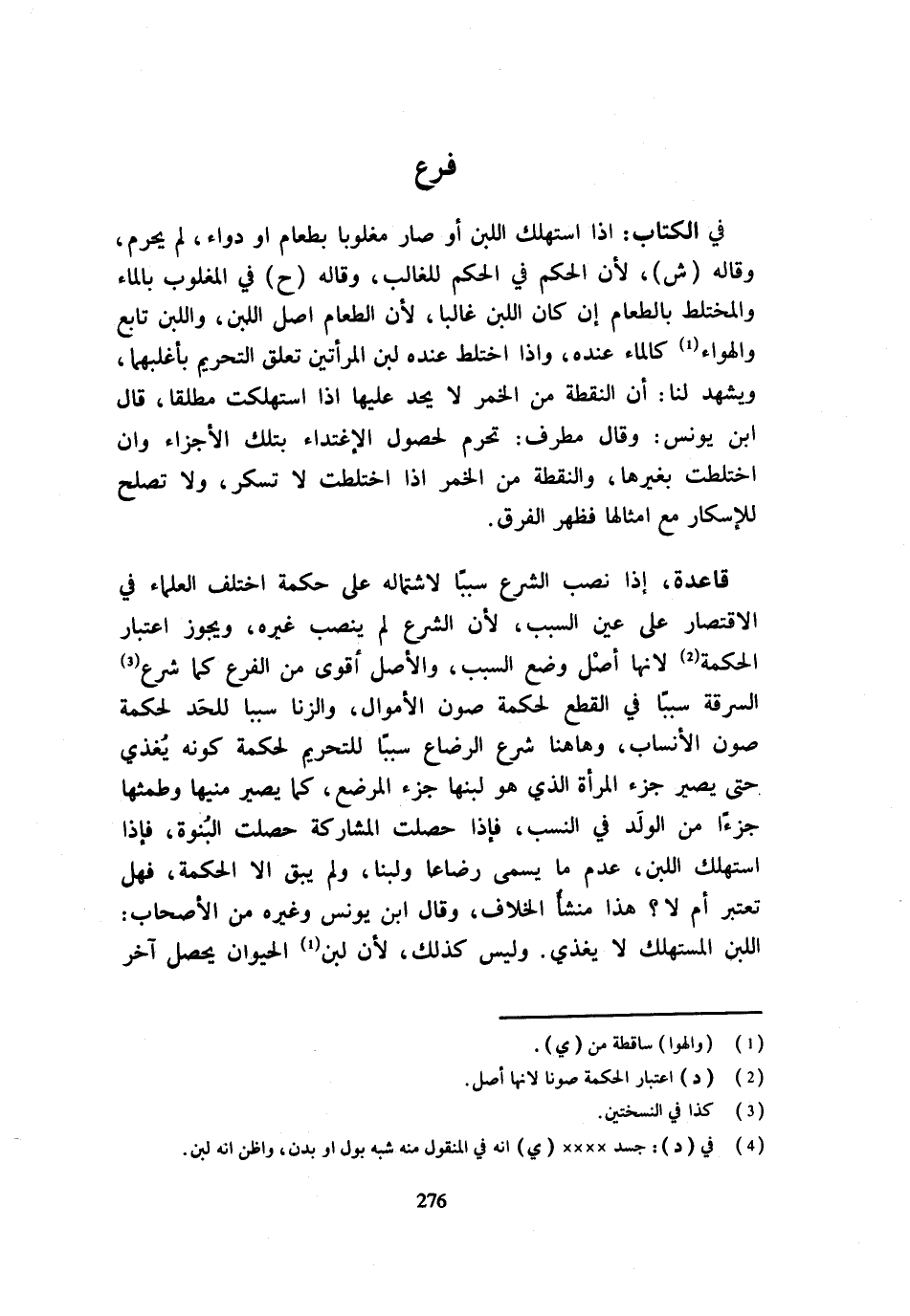 فِي الْكِتَابِ إِذَا اسْتُهْلِكَ اللَّبَنُ أَوْ صَارَ مَغْلُوبًا بِطَعَامٍ أَوْ دَوَاءٍ لَمْ يُحَرَّمْ وَقَالَهُ ش لِأَنَّ الْحُكْمَ فِي الْحُكْمِ لِلْغَالِبِ وَقَالَهُ ح فِي الْمَغْلُوبِ بِالْمَاءِ وَالْمُخْتَلِطِ بِالطَّعَامِ إِنْ كَانَ اللَّبَنُ غَالِبًا لِأَنَّ الطَّعَامَ أَصْلُ اللَّبن وَاللَّبن تَابع والهواء كَالْمَاءِ عِنْدَهُ وَإِذَا اخْتَلَطَ عِنْدَهُ لَبَنُ الْمَرْأَتَيْنِ تَعَلَّقَ التَّحْرِيمُ بِأَغْلَبِهِمَا وَيَشْهَدُ لَنَا أَنَّ النُّقْطَةَ مِنَ الْخَمْرِ لَا يُحَدُّ عَلَيْهَا إِذَا اسْتُهْلِكَتْ مُطلقًا قَالَ ابْن يُونُس وَقَالَ مطرف تحرم لحُصُول الإغتداء بِتِلْكَ الْأَجْزَاءِ وَإِنِ اخْتَلَطَتْ بِغَيْرِهَا وَالنُّقْطَةُ مِنَ الْخَمْرِ إِذَا اخْتَلَطَتْ لَا تُسْكِرُ وَلَا تَصْلُحُ لِلْإِسْكَارِ مَعَ أَمْثَالِهَا فَظَهَرَ الْفَرْقُ قَاعِدَةٌ إِذَا نَصَبَ الشَّرْعُ سَبَبًا لِاشْتِمَالِهِ عَلَى حِكْمَةٍ اخْتَلَفَ الْعُلَمَاءُ فِي الِاقْتِصَارِ عَلَى عَيْنِ السَّبَبِ لِأَنَّ الشَّرْعَ لَمْ يَنْصِبْ غَيْرَهُ وَيَجُوزُ اعْتِبَارُ الْحِكْمَةِ لِأَنَّهَا أَصْلُ وَضْعِ السَّبَبِ وَالْأَصْلُ أَقْوَى مِنَ الْفَرْع كَمَا شرع السّرقَة سَببا فِي الْقطع لحكمة صون الْأَمْوَال وَالزِّنَا سَببا للحد لحكمة صون الْأَنْسَاب وَهَا هُنَا شَرَعَ الرَّضَاعَ سَبَبًا لِلتَّحْرِيمِ لِحِكْمَةِ كَوْنِهِ يُغَذِّي حَتَّى يَصِيرَ جُزْءُ الْمَرْأَةِ الَّذِي هُوَ لَبَنُهَا جُزْءَ الْمُرْضَعِ كَمَا يَصِيرُ مَنِيُّهَا وَطَمْثُهَا جُزْءًا مِنَ الْوَلَدِ فِي النَّسَبِ فَإِذَا حَصَلَتِ الْمُشَارَكَةُ حَصَلَتِ الْبُنُوَّةُ فَإِذَا اسْتُهْلِكَ اللَّبَنُ عُدِمَ مَا يُسَمَّى رَضَاعًا وَلَبَنًا وَلَمْ يَبْقَ إِلَّا الْحِكْمَةُ فَهَلْ تُعْتَبَرُ أَمْ لَا هَذَا مَنْشَأُ الْخِلَافِ وَقَالَ ابْنُ يُونُسَ وَغَيْرُهُ مِنَ الْأَصْحَابِ اللَّبَنُ الْمُسْتَهْلك لَا يغذي وَلَيْسَ كَذَلِك لِأَن لبن الْحَيَوَان يحصل آخر