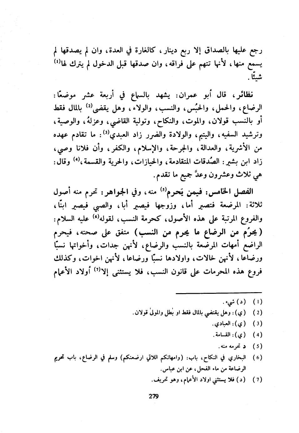 رَجَعَ عَلَيْهَا بِالصَّدَاقِ إِلَّا رُبُعَ دِينَارٍ كَالْغَارَةِ فِي الْعدة وَإِن لَمْ يُصَدِّقْهَا لَمْ يُسْمَعْ مِنْهَا لِأَنَّهَا تُتَّهَمُ عَلَى فِرَاقِهِ وَإِنْ صَدَّقَهَا قَبْلَ الدُّخُولِ لَمْ يتْرك لَهَا شَيْئا نَظَائِرُ قَالَ أَبُو عِمْرَانَ يَشْهَدُ بِالسَّمَاعِ فِي أَرْبَعَةَ عَشَرَ مَوْضِعًا الرَّضَاعُ وَالْحَمْلُ وَالْحَبْسُ وَالنَّسَبُ وَالْوَلَاءُ وَهَلْ يُقْضَى بِالْمَالِ فَقَطْ أَوْ بِالنَّسَبِ قَوْلَانِ وَالْمَوْتُ وَالنِّكَاحُ وَتَوْلِيَةُ الْقَاضِي وَعَزْلُهُ وَالْوَصِيَّةُ وترشيد السَّفِيه واليتيم والولادة وَالضَّرَر زَادَ الْعَبْدِيُّ مَا تَقَادَمَ عَهْدُهُ مِنَ الْأَشْرِيَةِ وَالْعَدَالَة والجرحة وَالْإِسْلَامِ وَالْكُفْرِ وَأَنَّ فُلَانًا وَصِيٌّ زَادَ ابْنُ بَشِيرٍ الصَّدَقَاتُ الْمُتَقَادِمَةُ وَالْحِيَازَاتُ وَالْحُرِّيَّةُ وَالْقِسْمَةُ وَقَالَ هِيَ ثَلَاث وَعِشْرُونَ وَعَدَّ جَمِيعَ مَا تَقَدَّمَ الْفَصْلُ الْخَامِسُ فِيمَن يحرم مِنْهُ وَفِي الْجَوَاهِر تحرم مِنْهُ أُصُولٌ ثَلَاثَةٌ الْمُرْضِعَةُ فَتَصِيرُ أُمًّا وَزَوْجُهَا فَيَصِيرُ أَبًا وَالصَّبِيُّ فَيَصِيرُ ابْنًا وَالْفُرُوعُ الْمُرَتَّبَةُ عَلَى هَذِهِ الْأُصُولِ كَحُرْمَةِ النَّسَبِ لِقَوْلِهِ عَلَيْهِ السَّلَامُ يَحْرُمُ مِنَ الرَّضَاعِ مَا يَحْرُمُ مِنَ النّسَب مُتَّفق على صِحَّته فَيحرم الرَّاضِعِ أُمَّهَاتُ الْمُرْضِعَةِ بِالنَّسَبِ وَالرَّضَاعِ لِأَنَّهُنَّ جَدَّاتٌ وَأَخَوَاتِهَا نَسَبًا وَرَضَاعًا لِأَنَّهُنَّ خَالَاتٌ وَأَوْلَادَهَا نَسَبًا وَرَضَاعًا لِأَنَّهُنَّ أَخَوَاتٌ وَكَذَلِكَ فُرُوعُ هَذِهِ الْمُحَرَّمَاتِ عَلَى قَانُونِ النَّسَبِ فَلَا يُسْتَثْنَى إِلَّا أَوْلَادُ الْأَعْمَام