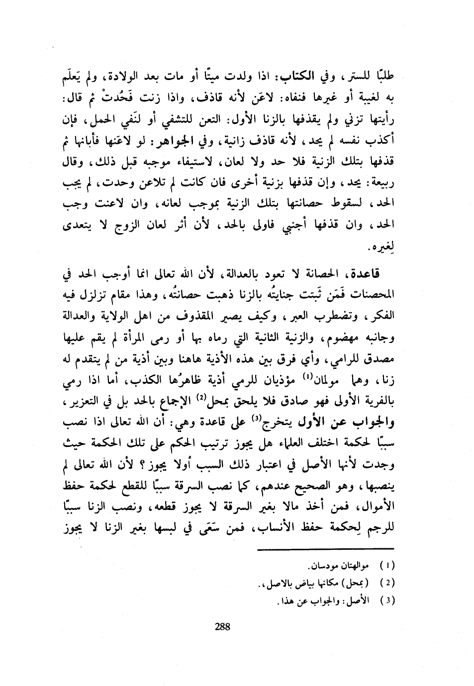 طَلَبًا لِلسَّتْرِ وَفِي الْكِتَابِ إِذَا وَلَدَتْ مَيِّتًا أَوْ مَاتَ بَعْدَ الْوِلَادَةِ وَلَمْ يَعْلَمْ بِهِ لِغَيْبَةٍ أَوْ غَيْرِهَا فَنَفَاهُ لَاعَنَ لِأَنَّهُ قَاذِفٌ وَإِذَا زَنَتْ فَحُدَّتْ ثُمَّ قَالَ رَأَيْتُهَا تَزْنِي وَلَمْ يَقْذِفْهَا بِالزِّنَا الْأَوَّلِ الْتَعَنَ لِلتَّشَفِّي أَوْ لِنَفْيِ الْحَمْلِ فَإِنْ أَكْذَبَ نَفْسَهُ لَمْ يُحَدَّ لِأَنَّهُ قَاذِفُ زَانِيَةٍ وَفِي الْجَوَاهِرِ لَوْ لَاعَنَهَا فَأَبَانَهَا ثُمَّ قَذَفَهَا بِتِلْكَ الزَّنْيَةِ فَلَا حَدَّ وَلَا لِعَانَ لِاسْتِيفَاءِ مُوجِبِهِ قَبْلَ ذَلِكَ وَقَالَ رَبِيعَةُ يُحَدُّ وَإِنْ قَذَفَهَا بِزَنْيَةٍ أُخْرَى فَإِنْ كَانَتْ لَمْ تُلَاعَنْ وَحُدَّتْ لَمْ يَجِبِ الْحَدُّ لِسُقُوطِ حَصَانَتِهَا بِتِلْكَ الزَّنْيَةِ بِمُوجِبِ لِعَانِهِ وَإِنْ لَاعَنَتْ وَجَبَ الْحَدُّ وَإِنْ قَذَفَهَا أَجْنَبِيٌّ فَأَوْلَى بِالْحَدِّ لِأَنَّ أَثَرَ لِعَانِ الزَّوْجِ لَا يَتَعَدَّى لِغَيْرِهِ قَاعِدَةٌ الْحَصَانَةُ لَا تَعُودُ بِالْعَدَالَةِ لِأَنَّ اللَّهَ تَعَالَى إِنَّمَا أَوْجَبَ الْحَدَّ فِي الْمُحْصَنَاتِ فَمن ثَبت جِنَايَته بِالزِّنَا ذهبت حصانته وَهَذَا مقَام تزلزل فِيهِ الْفِكر وتضطرب العبر وَكَيف يَصِيرُ الْمَقْذُوفُ مِنْ أَهْلِ الْوِلَايَةِ وَالْعَدَالَةِ وَجَانِبُهُ مَهْضُومٌ وَالزَّنْيَةُ الثَّانِيَةِ الَّتِي رَمَاهُ بِهَا أَوْ رَمَى الْمَرْأَةَ لَمْ يَقُمْ عَلَيْهَا مُصَدِّقٌ لِلرَّامِي وَأي فرق بَين هَذِه الأذية هَا هُنَا وَبَيْنَ أَذِيَّةِ مَنْ لَمْ يَتَقَدَّمْ لَهُ زِنًا وَهُمَا مُولِمَانِ مُؤْذِيَانِ لِلرَّمْيِ أَذِيَّةً ظَاهِرُهَا الْكَذِبُ أَمَّا إِذَا رُمِيَ بِالْفِرْيَةِ الْأُولَى فَهُوَ صَادِقٌ فَلَا يَلْحَقُ بِمَحَلِّ الْإِجْمَاعِ بِالْحَدِّ بَلْ فِي التَّعْزِيرِ وَالْجَوَابُ عَنِ الْأَوَّلِ يَتَخَرَّجُ عَلَى قَاعِدَةٍ وَهِيَ أَنَّ اللَّهَ تَعَالَى إِذَا نَصَبَ سَبَبًا لِحِكْمَةٍ اخْتَلَفَ الْعُلَمَاءُ هَلْ يَجُوزُ تَرْتِيبُ الْحُكْمِ عَلَى تِلْكَ الْحِكْمَةِ حَيْثُ وُجِدَتْ لِأَنَّهَا الْأَصْلُ فِي اعْتِبَارِ ذَلِكَ السَّبَبِ أَوْ لَا يَجُوزُ لِأَنَّ اللَّهَ تَعَالَى لَمْ يَنْصِبْهَا وَهُوَ الصَّحِيحُ عِنْدَهُمْ كَمَا نَصَبَ السَّرِقَةَ سَبَبًا لِلْقَطْعِ لِحِكْمَةِ حِفْظِ الْأَمْوَالِ فَمَنْ أَخَذَ مَالًا بِغَيْرِ السَّرِقَةِ لَا يَجُوزُ قَطْعُهُ وَنَصَبَ الزِّنَا سَبَبًا لِلرَّجْمِ لِحِكْمَةِ حِفْظِ الْأَنْسَابِ فَمَنْ سَعَى فِي لَبْسِهَا بِغَيْر الزِّنَا لَا يجوز