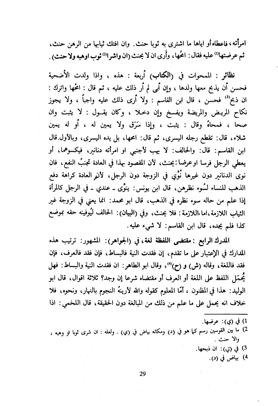 امْرَأَتَهُ فَأَعْطَاهُ أَوْ إِيَّاهَا مَا اشْتَرَى بِهِ ثَوْبًا حَنِثَ وَإِنِ افْتَكَّ ثِيَابَهَا مِنَ الرَّهْنِ حَنِثَ ثُمَّ عَرَضْتُهَا عَلَيْهِ فَقَالَ امْحُهَا وَأَرَى أَن لَا يَحْنَث إِن واشرا ثوب أوهبه وَلَا حنث نَظَائِرُ الْمَمْحُوَّاتُ فِي الْكِتَابِ أَرْبَعَةٌ هَذِهِ وَإِذَا وَلَدَتِ الْأُضْحِيَّةُ فَحَسُنَ أَنْ يَذْبَحَ مَعَهَا وَلَدَهَا وَإِنْ أَبَى لَمْ أَرَ ذَلِكَ عَلَيْهِ ثُمَّ قَالَ امْحُهَا وَاتْرُكْ إِنْ ذَبَحَ فَحَسَنٌ قَالَ ابْنُ الْقَاسِمِ وَلَا أَرَى ذَلِكَ عَلَيْهِ وَاجِبًا وَلَا يَجُوزُ نِكَاحُ الْمَرِيضِ وَالْمَرِيضَةِ وَيُفْسَخُ وَإِنْ دَخَلَا وَكَانَ يَقُولُ لَا يَثْبُتُ وَإِنْ صَحَّا فَمَحَاهُ وَقَالَ يَثْبُتُ وَإِذَا سَرَقَ وَلَا يَمِينَ لَهُ أَوْ لَهُ يَمِينٌ شلاء قَالَ تُقْطَعُ رِجْلُهُ الْيُسْرَى ثُمَّ قَالَ امْحُهَا بَلْ يَدُهُ الْيُسْرَى وَبِالْأَوَّلِ قَالَ ابْنُ الْقَاسِمِ قَالَ وَالْحَالِفُ لَا يَهَبُ لِأَجْنَبِيٍّ أَوِ امْرَأَتِهِ دَنَانِيرَ فَيَكْسُوهُمَا أَوْ يُعْطِي الرَّجُلَ فَرَسًا أَوْ عَرَضًا يَحْنَثُ لِأَنَّ الْمَقْصُودَ بِهَذَا فِي الْعَادَةِ تَجَنُّبُ النَّفْعِ فَإِنْ نَوَى الدَّنَانِيرَ دُونَ غَيْرِهَا نُوِيَ فِي الزَّوْجَةِ دُونَ الرَّجُلِ لِأَنَّ الْعَادَةَ كَرَاهَةُ دَفْعِ الذَّهَبِ لِلنِّسَاءِ لِسُوءِ نَظَرِهِنَّ قَالَ ابْنُ يُونُسَ يَنْوِي عِنْدِي فِي الرَّجُلِ كَالْمَرْأَةِ إِذَا عُلِمَ مِنْ حَالِهِ سُوءُ نَظَرِهِ فِي الذَّهَبِ قَالَ أَبُو مُحَمَّدٍ إِنَّمَا يَعْنِي فِي الزَّوْجَةِ غَيْرَ الثِّيَابِ اللَّازِمَةِ أَمَّا اللَّازِمَةُ فَلَا يَحْنَثُ وَفِي الْبَيَانِ الْحَالِفُ لَيُوَفِّيَنَّهُ حَقَّهُ بِمَوْضِعِ كَذَا فَلَمْ يَجِدْهُ قَالَ ابْنُ الْقَاسِمِ لَا شَيْءَ عَلَيْهِ الْمدْرك الرَّابِع مُقْتَضى اللَّفْظَة لُغَة فِي الْجَوَاهِرِ الْمَشْهُورُ تَرْتِيبُ هَذِهِ الْمَدَارِكِ فِي الِاعْتِبَارِ عَلَى مَا تَقَدَّمَ إِنْ فُقِدَتِ النِّيَّةُ فَالْبِسَاطِ فَإِن فقد فالعرف فَإِن فقد فاللغة وَقَالَ ش وح وَقَالَ أَبُو الطَّاهِرِ إِنْ فُقِدَتِ النِّيَّةُ وَالْبِسَاطُ فَهَلْ يُحْمَلُ اللَّفْظُ عَلَى اللُّغَةِ أَوِ الْعُرْفِ أَوْ مُقْتَضَاهُ شَرْعًا إِنْ وُجِدَ ثَلَاثَةُ أَقْوَالٍ قَالَ أَبُو الْوَلِيدِ هَذَا فِي الْمَظْنُونِ أَمَّا الْمَعْلُومُ كَقَوْلِهِ وَاللَّهِ لَأُرِيَنَّهُ النُّجُومَ بِالنَّهَارِ وَنَحْوِهِ فَلَا خِلَافَ أَنَّهُ يُحْمَلُ عَلَى مَا عُلِمَ مِنْ ذَلِكَ مِنَ الْمُبَالَغَةِ دُونَ الْحَقِيقَةِ قَالَ اللَّخْمِيّ إِذا