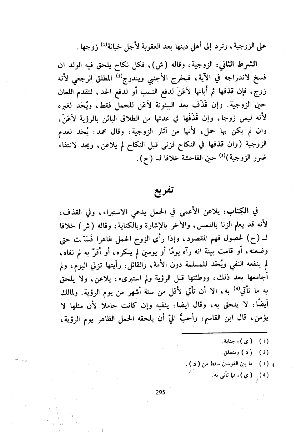 فِي الْكِتَابِ يُلَاعِنُ الْأَعْمَى فِي الْحَمْلِ يَدَّعِي الِاسْتِبْرَاءَ وَفِي الْقَذْفِ لِأَنَّهُ قَدْ يَعْلَمُ الزِّنَا باللمس وَالْآخر بِالْإِشَارَةِ وبالكناية وَقَالَهُ ش خِلَافًا لِ ح لِحُصُولِ فَهْمِ الْمَقْصُود وَإِذا رَأَى الزَّوْجُ الْحَمْلَ ظَاهِرًا فَسَكَتَ حَتَّى وَضَعَتْهُ أَوْ قَامَتْ بَيِّنَةٌ أَنَّهُ رَآهُ يَوْمًا أَوْ يَوْمَيْنِ لم يُنْكِرْهُ أَوْ أَقَرَّ بِهِ ثُمَّ نَفَاهُ لَمْ يَنْفَعْهُ النَّفْيُ وَيُحَدُّ لِلْمُسْلِمَةِ دُونَ الْأَمَةِ وَالْقَائِلُ رَأَيْتُهَا تَزْنِي الْيَوْمَ وَلَمْ أُجَامِعْهَا بَعْدَ ذَلِكَ وَوَطئهَا قَبْلَ الرُّؤْيَةِ وَلَمْ أَسْتَبْرِئْ يُلَاعَنُ وَلَا يَلْحَقُ بِهِ مَا تَأْتِي بِهِ إِلَّا أَنْ تَأْتِيَ لِأَقَلَّ مِنْ سِتَّةِ أَشْهُرٍ مِنْ يَوْمِ الرُّؤْيَةِ وَلِمَالِكٍ أَيْضًا لَا يَلْحَقُ بِهِ وَقَالَ أَيْضًا يَنْفِيهِ وَإِنْ كَانَتْ حَامِلًا لِأَنَّ مِثْلَهَا لَا يُؤْمَنُ قَالَ ابْنُ الْقَاسِمِ وَأَحَبُّ إِلَيَّ أَنْ يَلْحَقَهُ الْحَمْلُ الظَّاهِرُ يَوْمَ الرُّؤْيَةِ